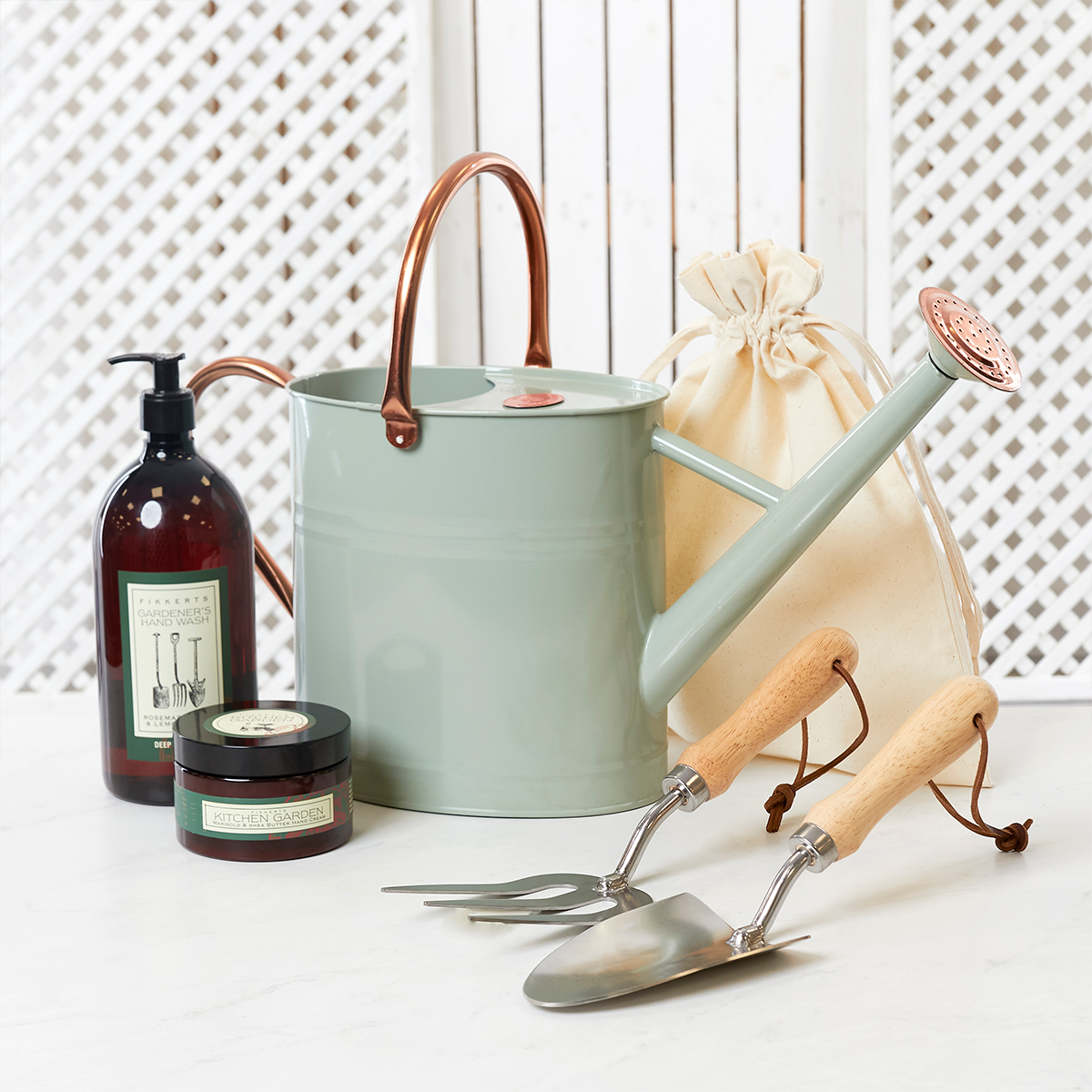 The perfect addition for your garden, this watering can is both practical and beautiful. Crafted in a lovely light green colour, it features copper handles for a stylish finish. It is well protected against rust for years of good use watering your garden plants. It features a folding handle and detachable watering rose and can hold up to 3.5 litre capacity. This comes in a beautiful gift set with a generous bottle of gardener's hand soap and hand cream. Includes Watering Can 3.5ltr Fikkerts Kitchen Garden Hand Soap 1ltr with pump dispenser & Fikkerts Kitchen Garden Hand Cream 250ml Tool Set