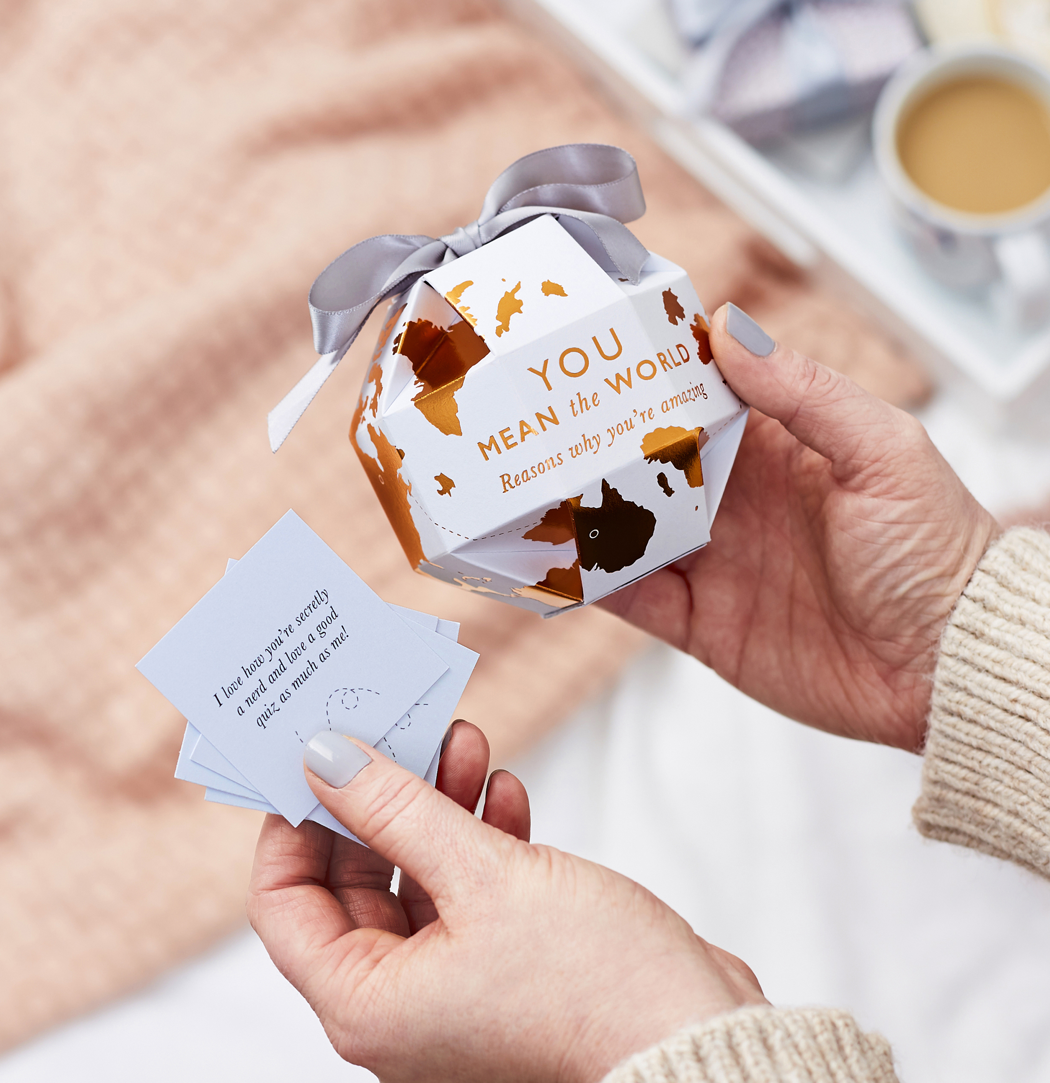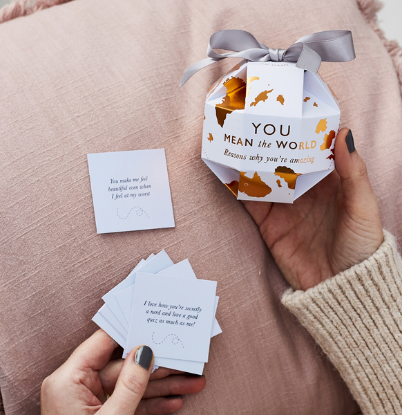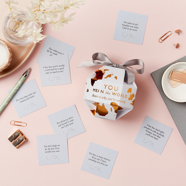 A personalised ‘you mean the world’ foil embossed token gift with eight hidden messages inside. This foil embossed globe is the perfect little gift to tell someone how much they mean to you. Your messages are hidden on little cards inside. Made from the highest quality GF Smith card, the light blue globe is copper foil embossed with the world and ‘You Mean The World, Reasons why you’re amazing’ on the outside. The globe comes packed in a little box and is tied with a double satin grey ribbon.