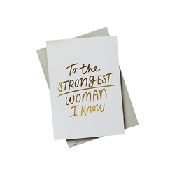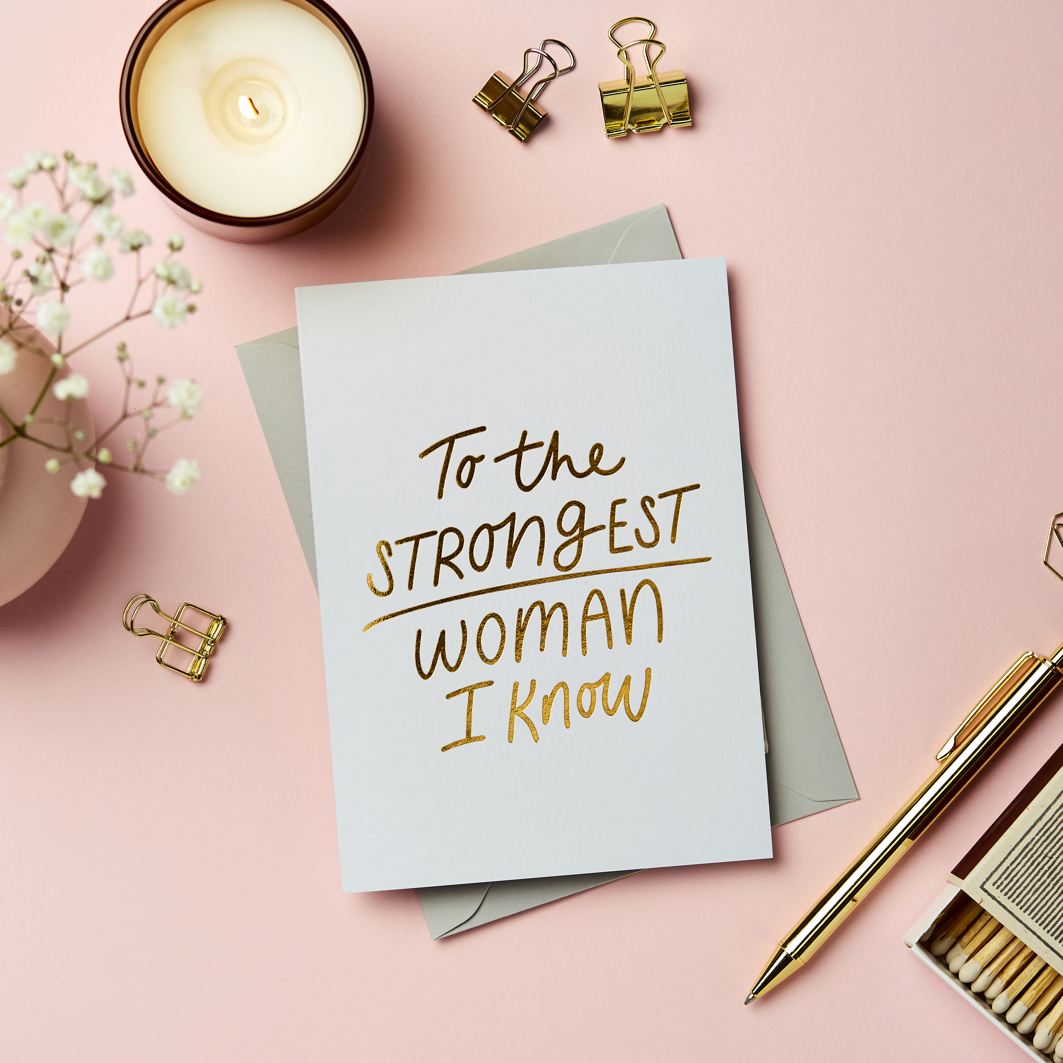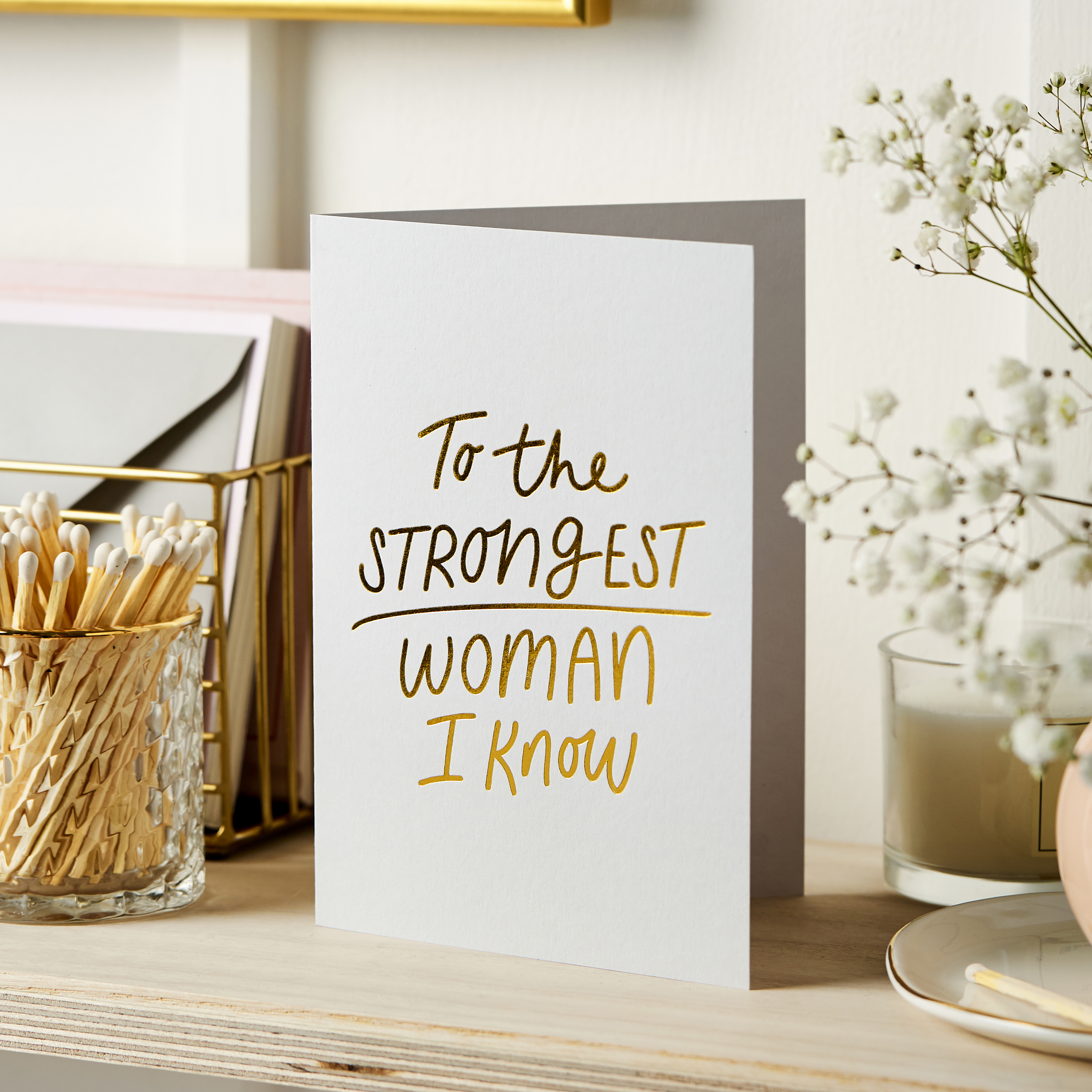 The perfect foil embossed card for the strongest woman you know. A lovely quote for the woman who’s your rock, this relatable card features ‘to the strongest woman I know’ gold foil embossed onto luxury sustainable card. Folded card dimensions: 12.7 x 17.8 cm Each card comes individually wrapped with a luxury grey envelope. The card is blank inside so you can add your own lovely message unless a printed message is chosen