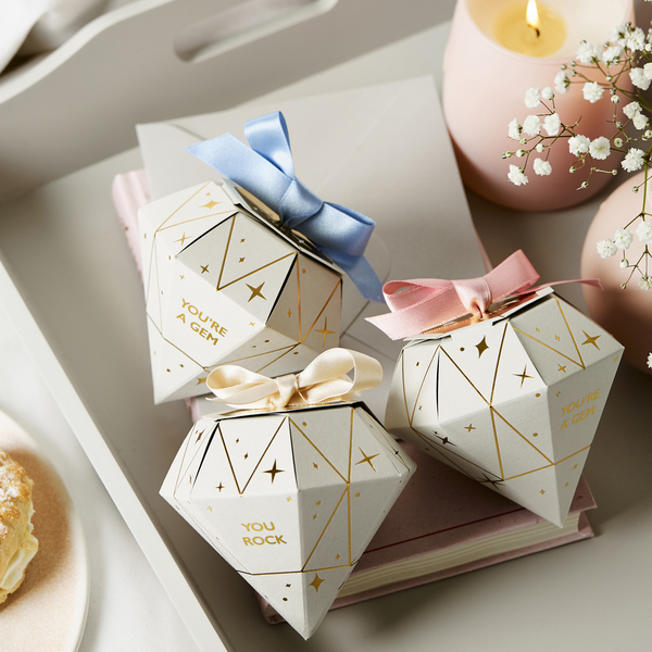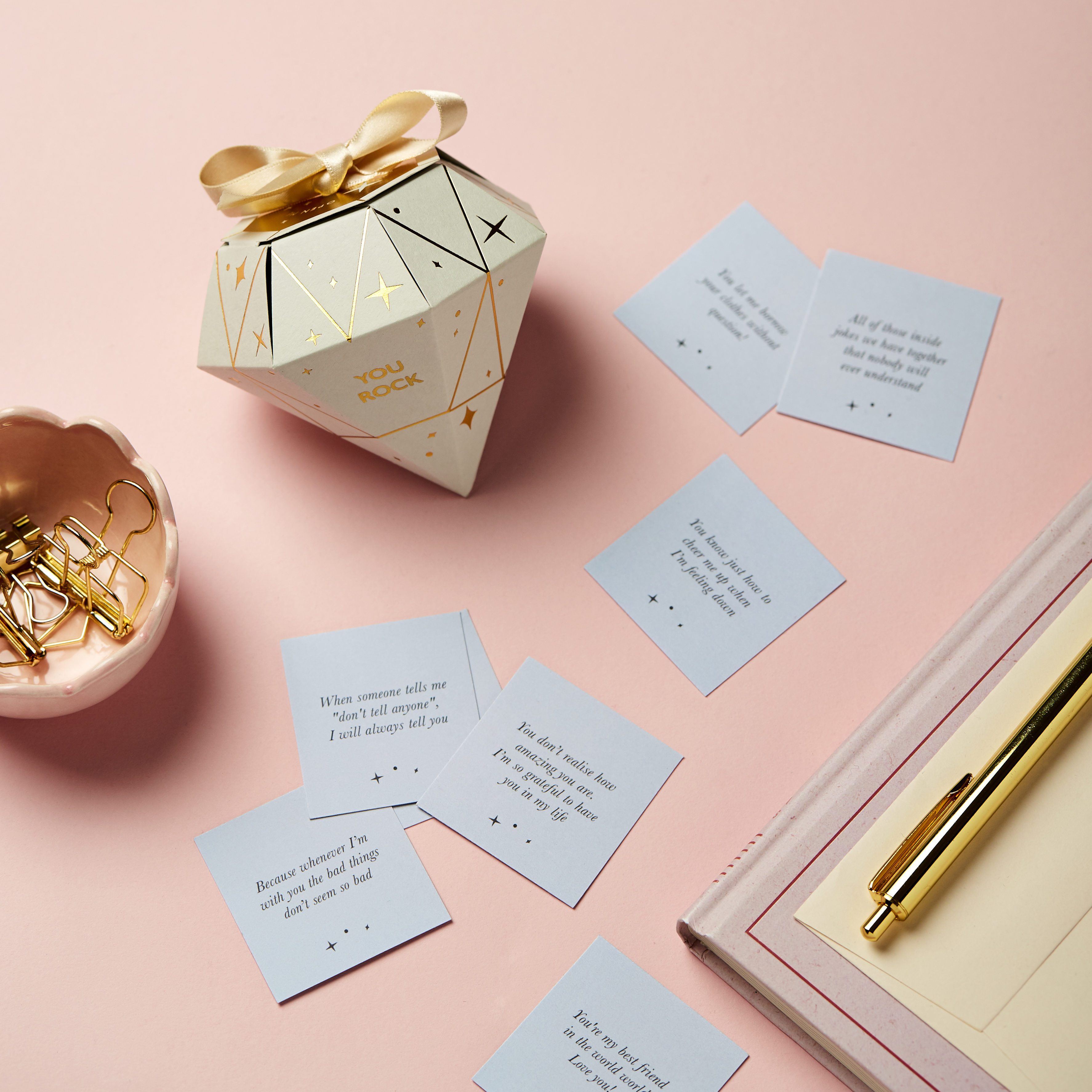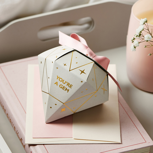 You’re a gem! Make them feel like one in a million with the Personalised You’re A Gem Token Gift. This Personalised You’re A Gem Token Gift features a stunning gem design and is foil embossed with the choice of either ‘You’re a Gem’ or ‘You Rock’. Un-do the ribbon to reveal eight messages, which can be personalised to remind someone how special they are. Beautiful enough to keep on your shelf or bookcase, this can be opened and enjoyed to show someone how appreciated they are. Fill the inside with your own personalised messages of your favourite memories and moments or remind them why they’re as rare as a gem, a perfect gift for a loved one or best friend.