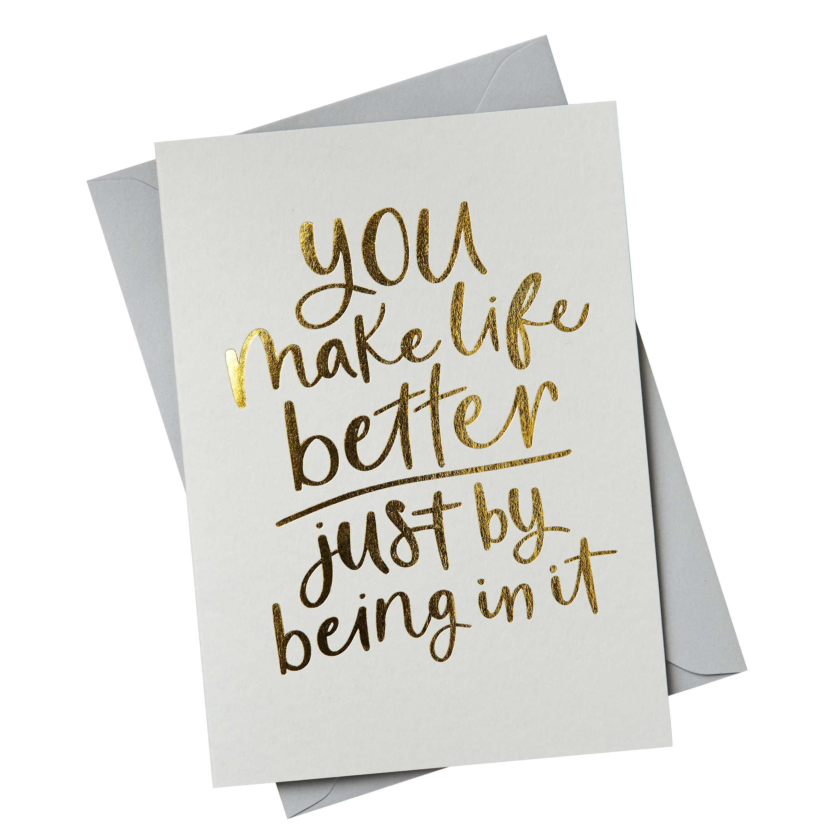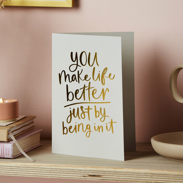 Share the love with your valentine with this thoughtful Valentine's Day card. Foil embossed onto luxury sustainable card, the front of the card features stylish gold lettering that reads 'You make life better just by being in it'.