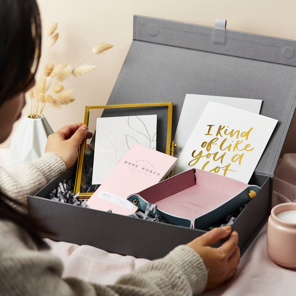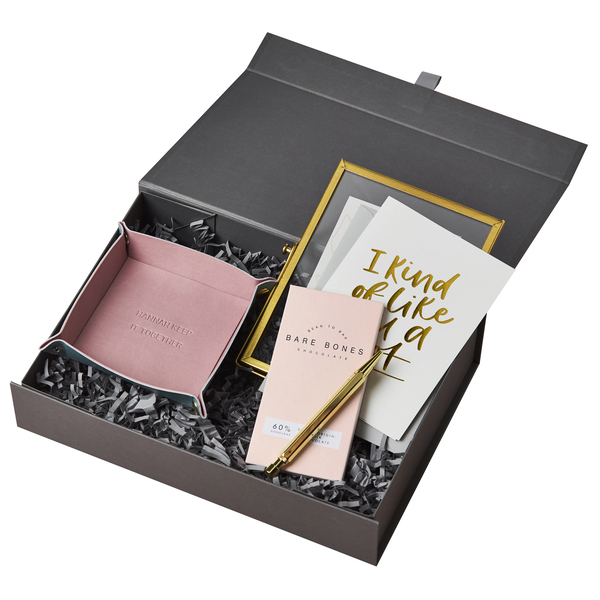 This Valentine's Gift Box comes complete with a stylish photo frame, a personalised vegan leather trinket tray, a unique Valentine's card and a bar of Bare Bones chocolate, all packaged in this beautiful gift box. Guaranteed to make them smile, this box is the perfect way to celebrate your love this Valentine's Day. Choose from our range of stylish colours for the trinket tray and choose your card to be popped into this box. Need this sent straight to your Valentine? No problem, we can print your message on the inside of the card or we can leave it blank for you to write out yourself. We can also send it direct to the recipient if you enter their delivery details at checkout. The gift box measures 32.5cm x 23cm x 7cm.
