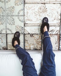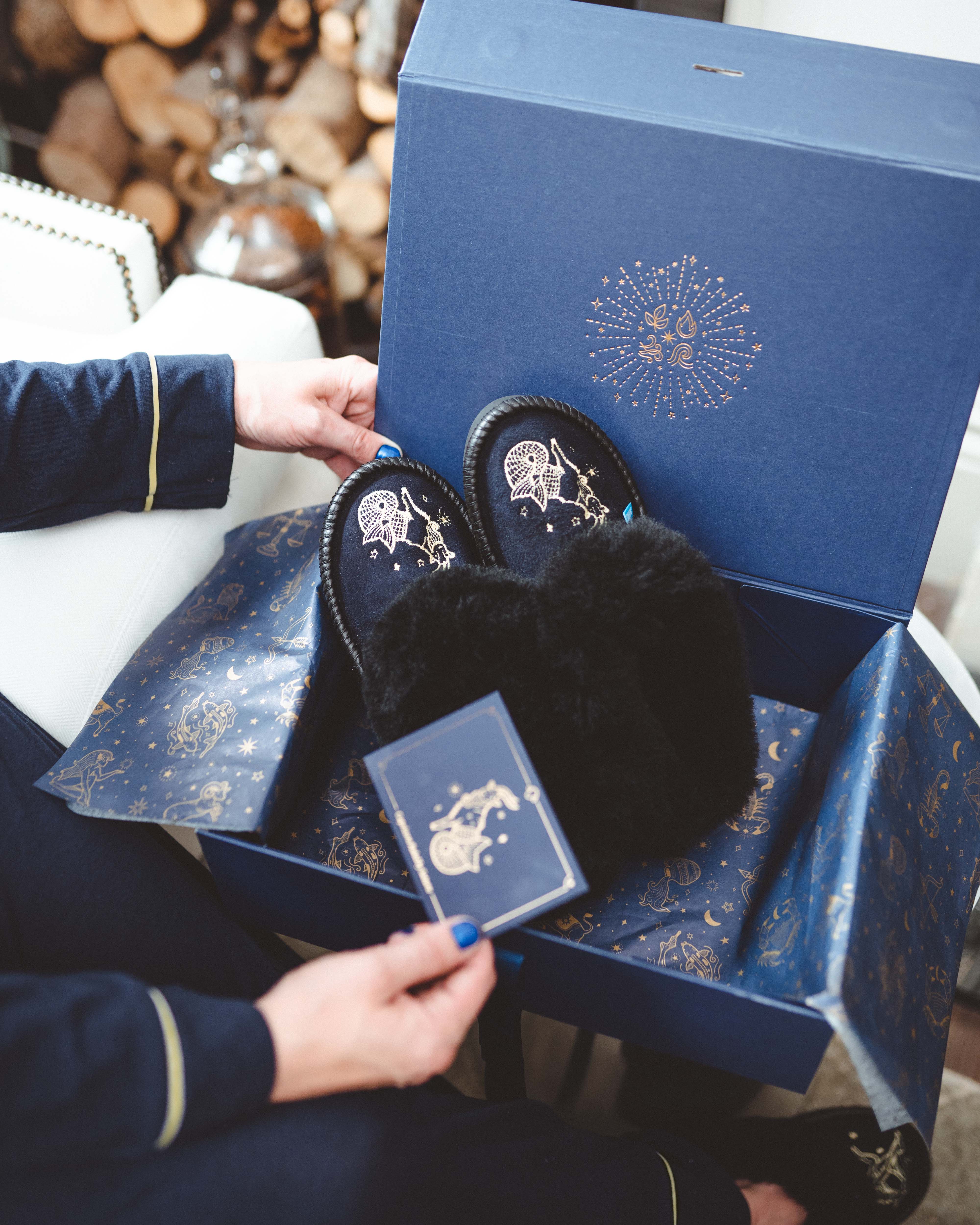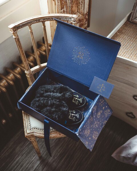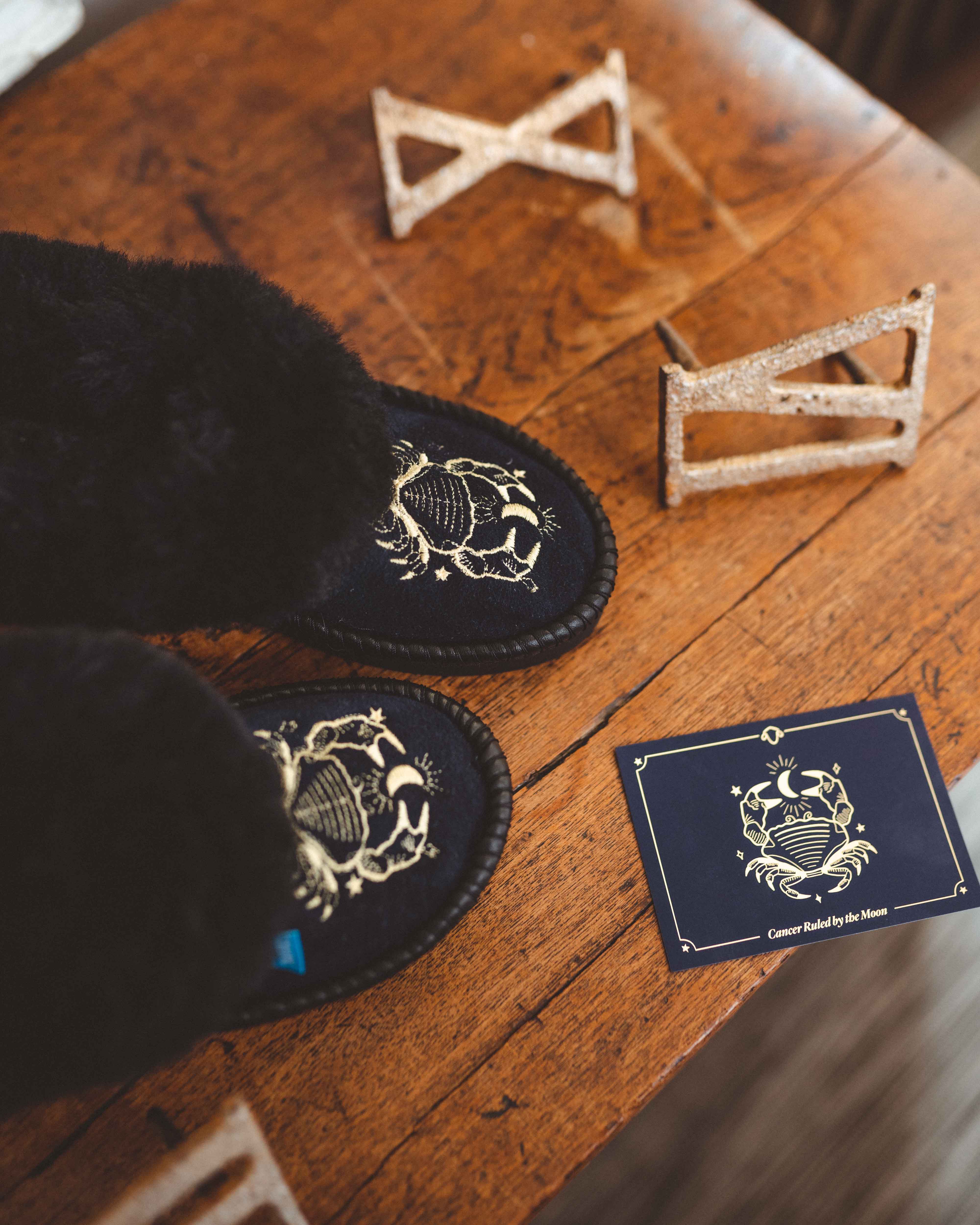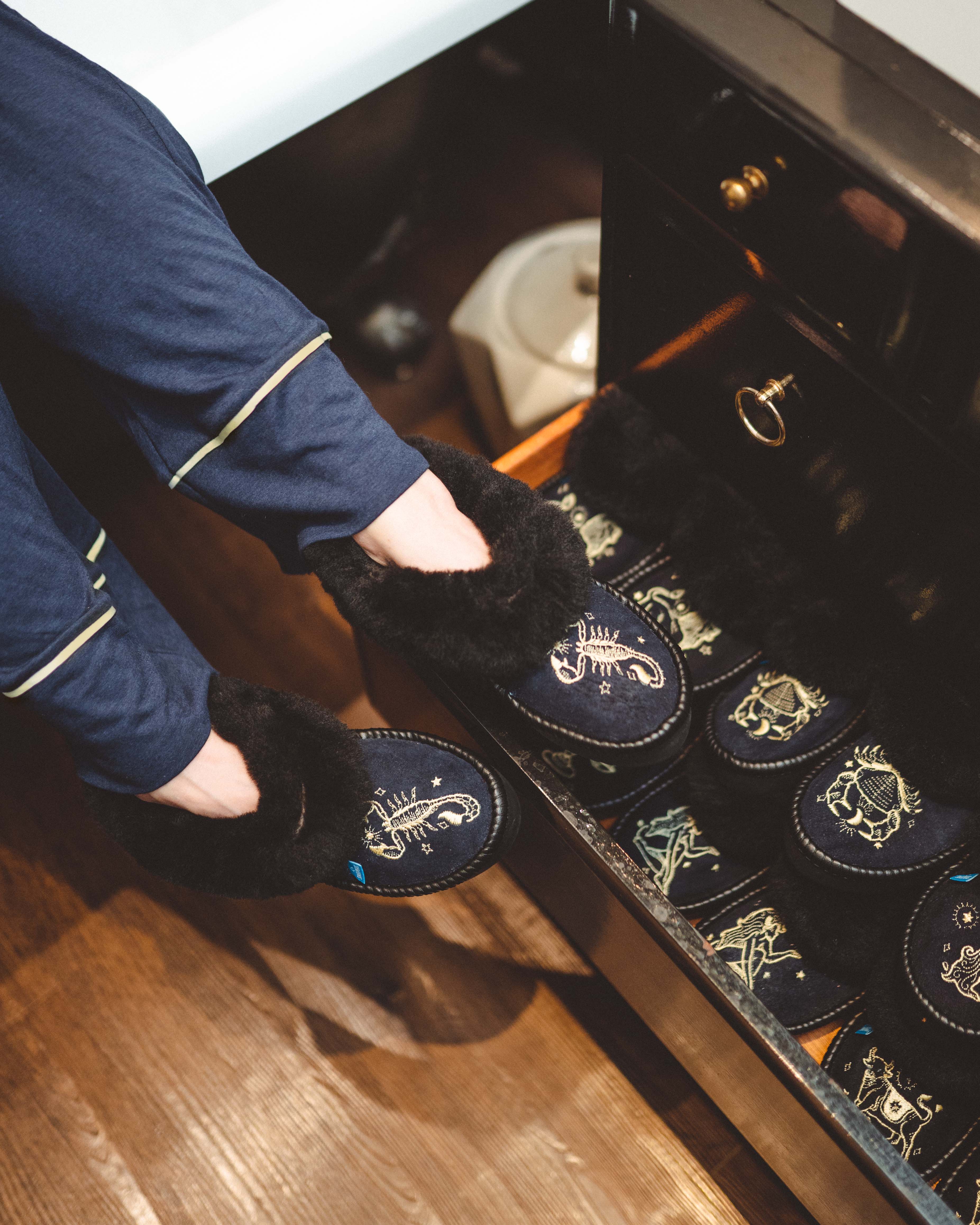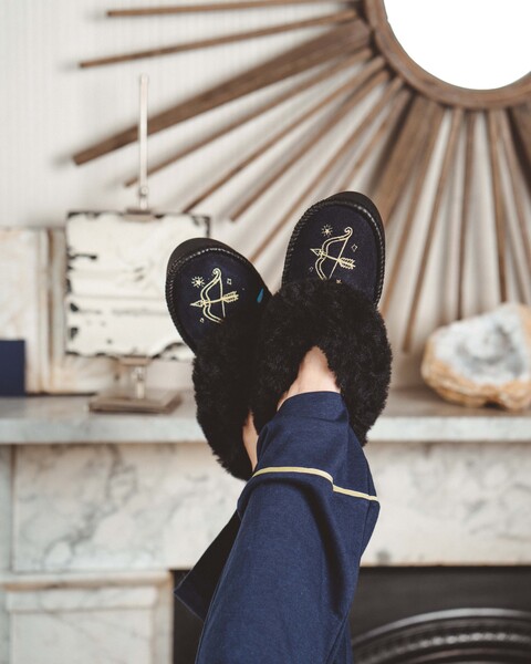 Calling all spiritualists! We have got the perfect zodiac-themed gift for any astrology lover. Sheepers presents our newest range, the Zodiac Collection. Inspired by Sheepers Core ranges, we are finally able to bring to you the ultimate outdoor slipper. Bringing the traditional moccasin sheepskin lined slipper together with the modern ability to be worn outside. The slipper itself displays a black fluffy sheepskin cuff, with a navy sheepskin upper detailed with gold embroidery outlining the chosen star signs symbol. However, the best is yet to come. The inside of the slipper is lined gorgeously with a stunning merino sheepskin wool supported by memory foam, to provide you with comfort you have never experienced before. This range aspires to be a perfect gift, making a wonderful and personal gift for a loved one or friend. Each exact detail has been thought through thoroughly, with the end goal of tying together a traditional slipper with the ultimate modern twist. SIZING TIP: Please order a size up from your usual shoe size. Please Note: Each pair is accompanied by our complimentary gift wrap the navy and gold embossed Zodiac Collection gift box, with a luxuriously matte manta card. Each mantra card, has been thoughtfully executed by professional Astrologer Damien Allen, to include a stunning description tailored to that particular star sign. Please use the below for guidance: Aquarius: January 21-February 18 Pisces: February 19-March 20 Aries: March 21-April 19
