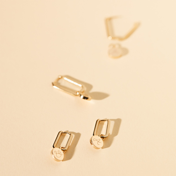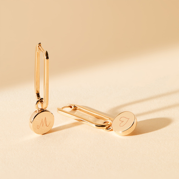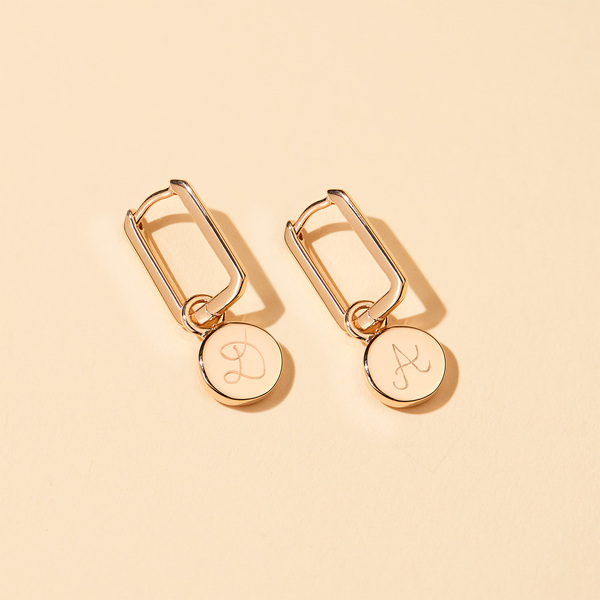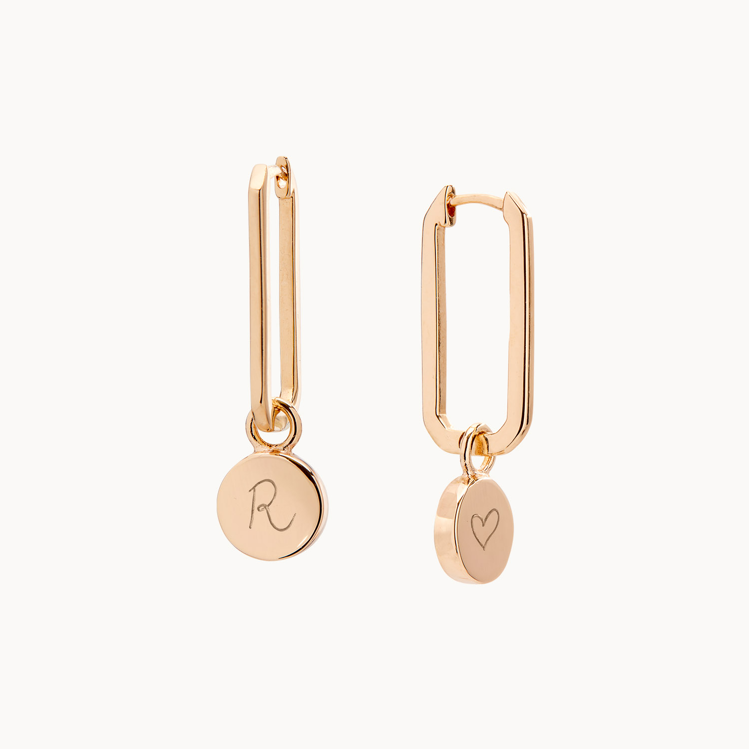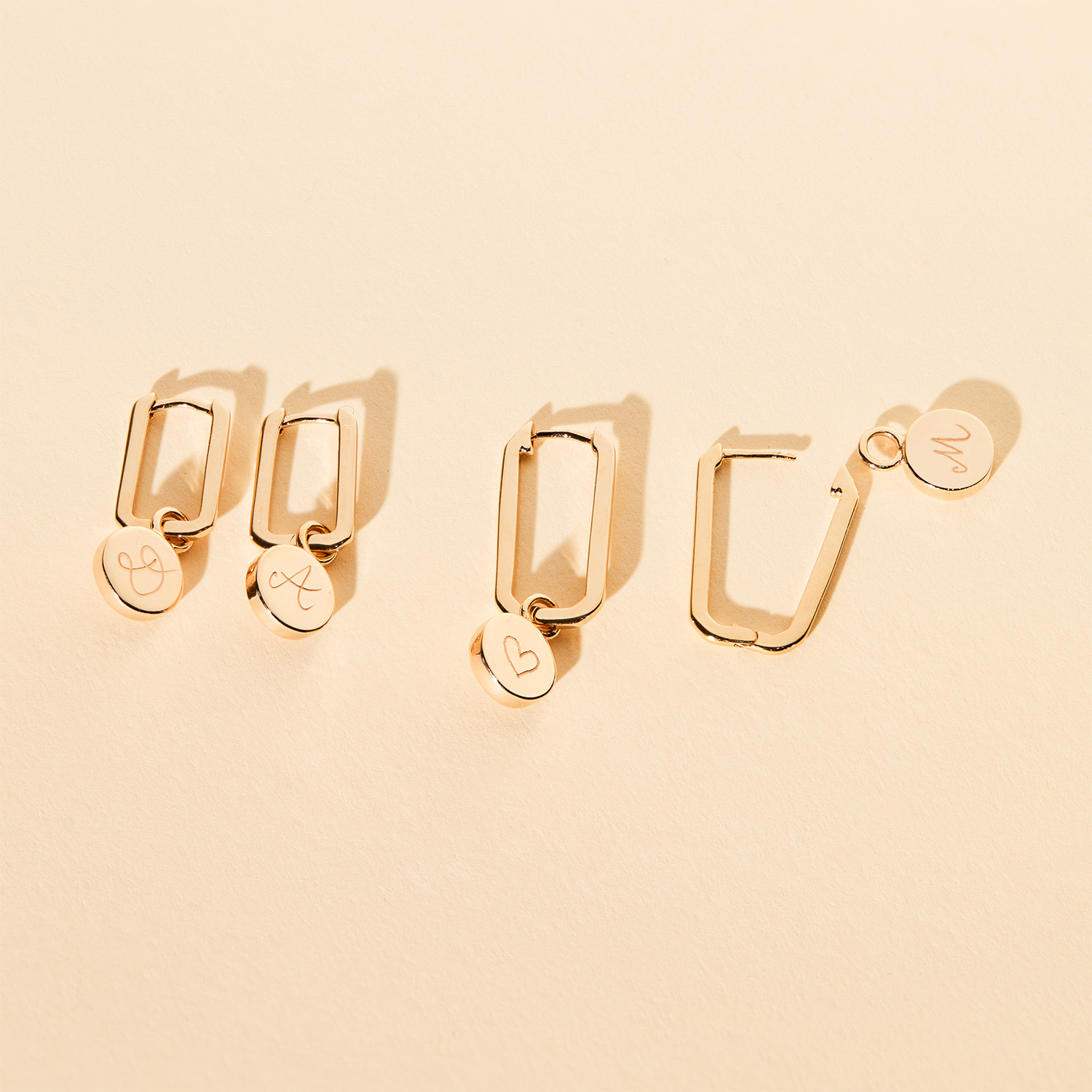 Delicate and elegant. Our Personalised Love Links Hoop Earrings consist of a contemporary link shaped hoop, from which an engravable disc gently hangs. Personalise by hand-engraving the pendant with an initial or number that means the most. Available in 18K Champagne Gold Plated.