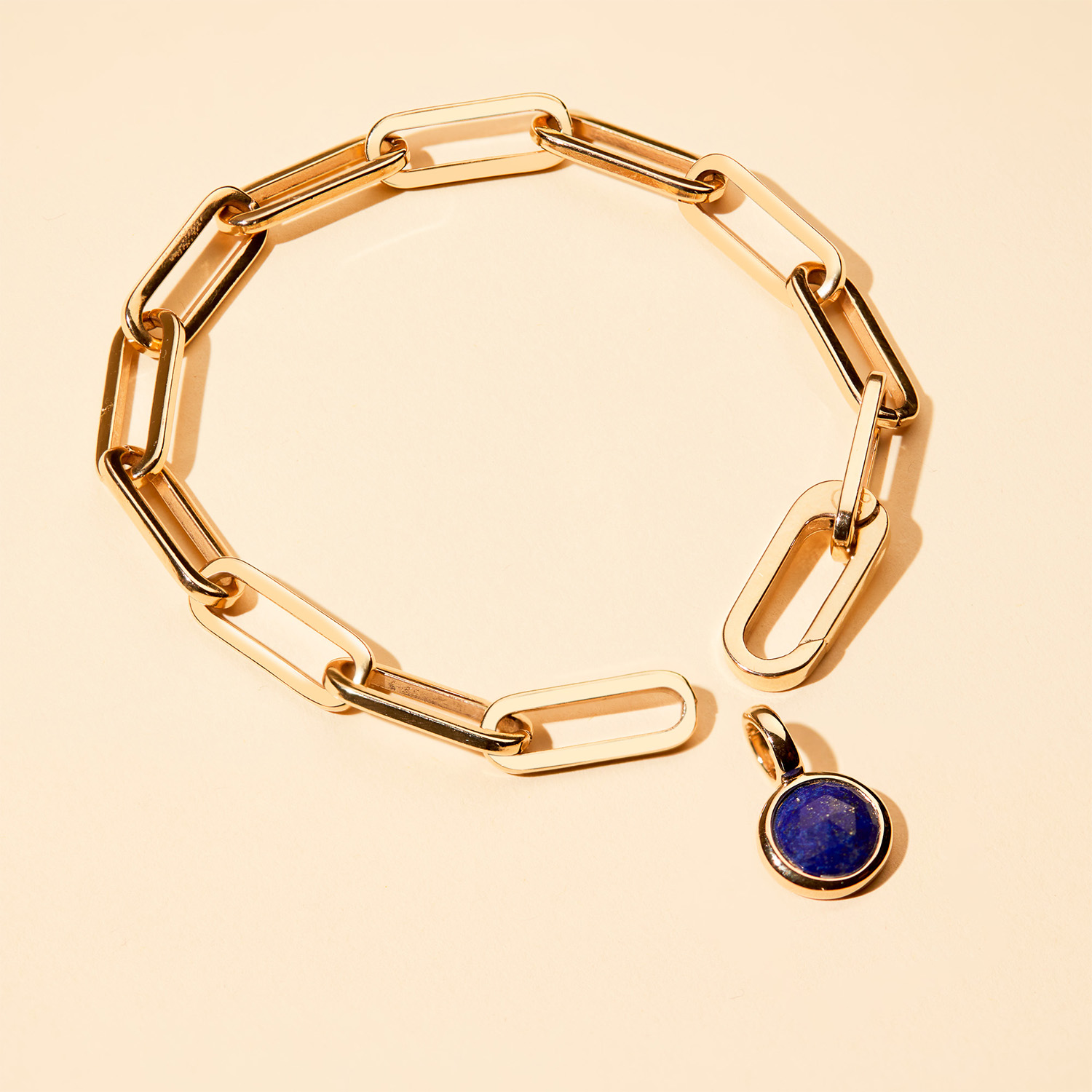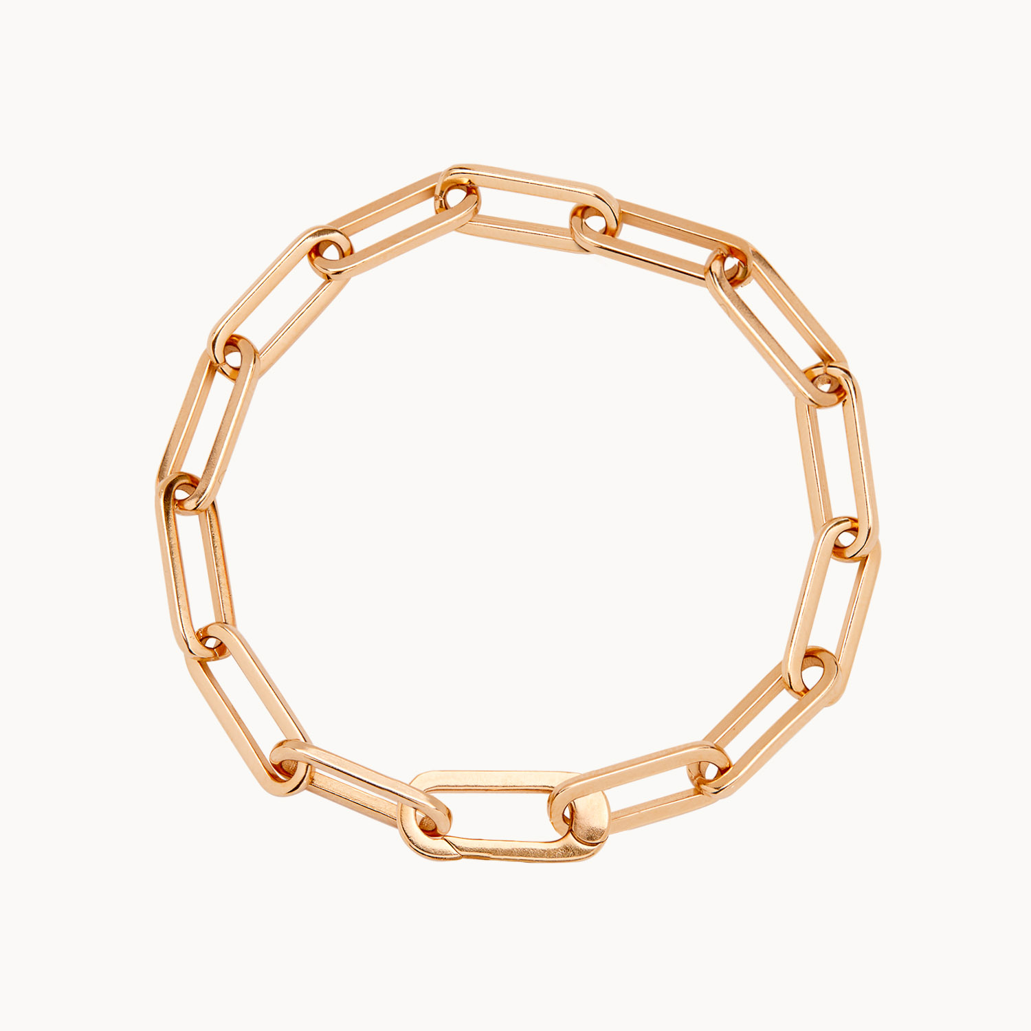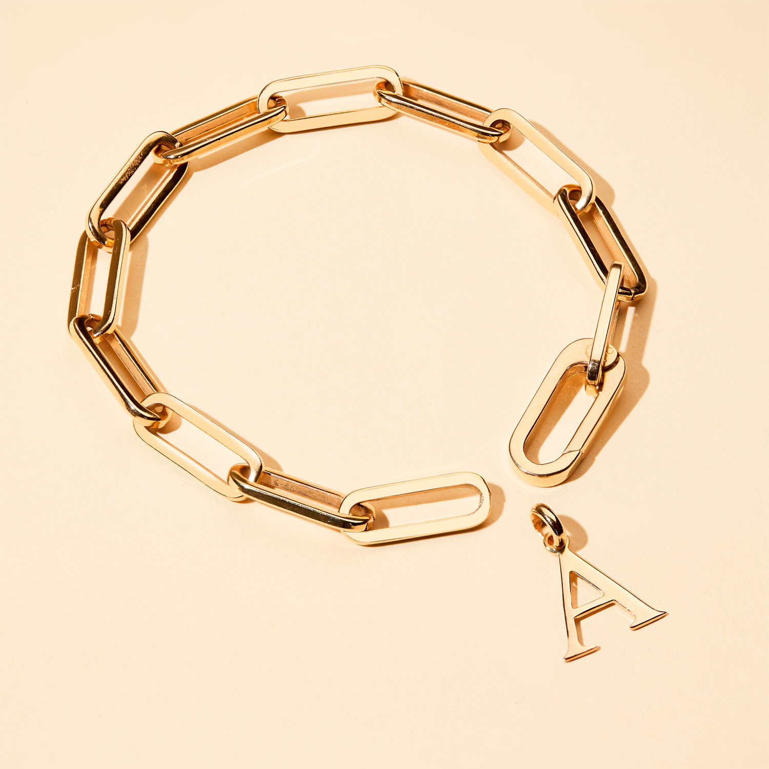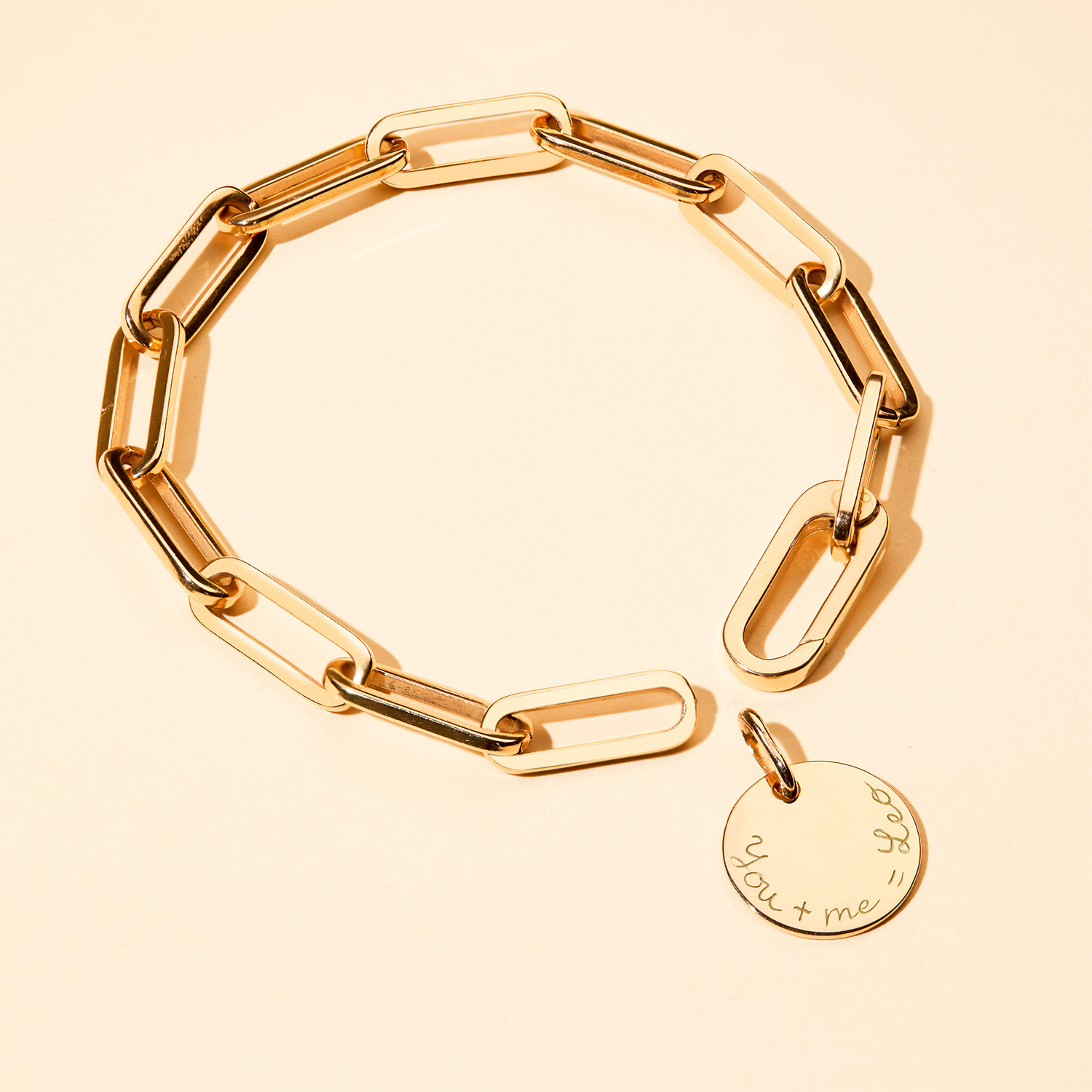 Stylish and chic, add a personalised charm of your choice to this bracelet by using the hinged link. To finish add a sweet hand engraved message to your chosen charm to make this piece the perfect personalised gift. Available in 18K Champagne Gold Plated