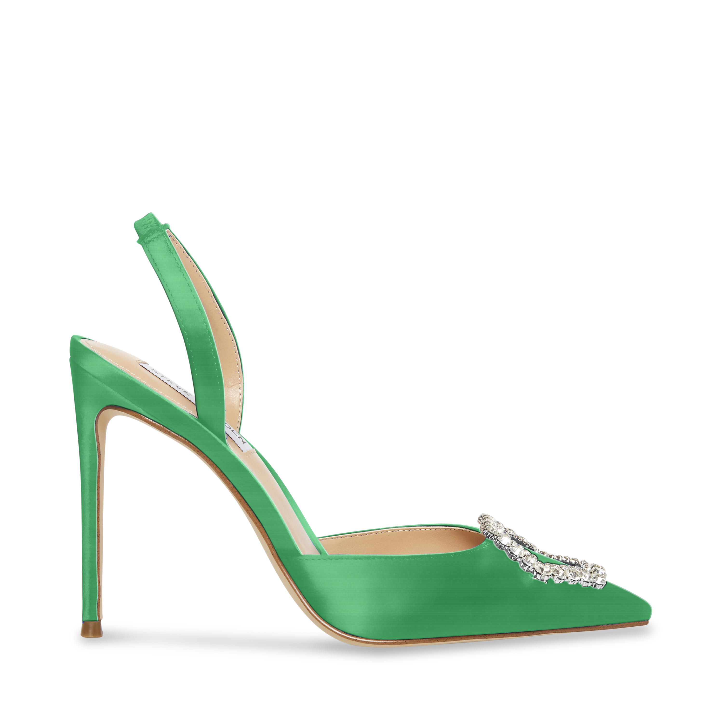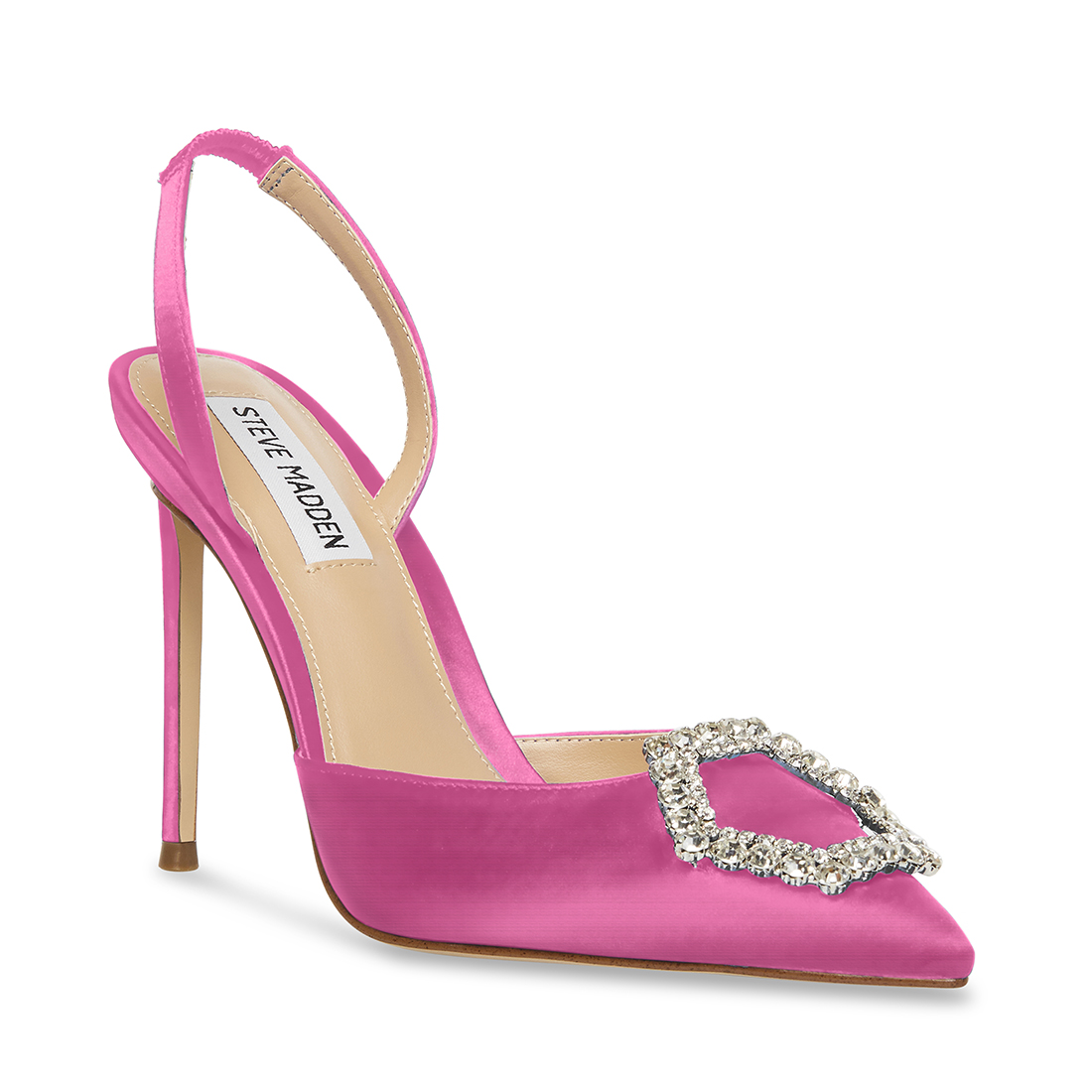 A sling back stiletto heel with rhinestone buckle on toe. Available in Pink, Green, Black and Blue.