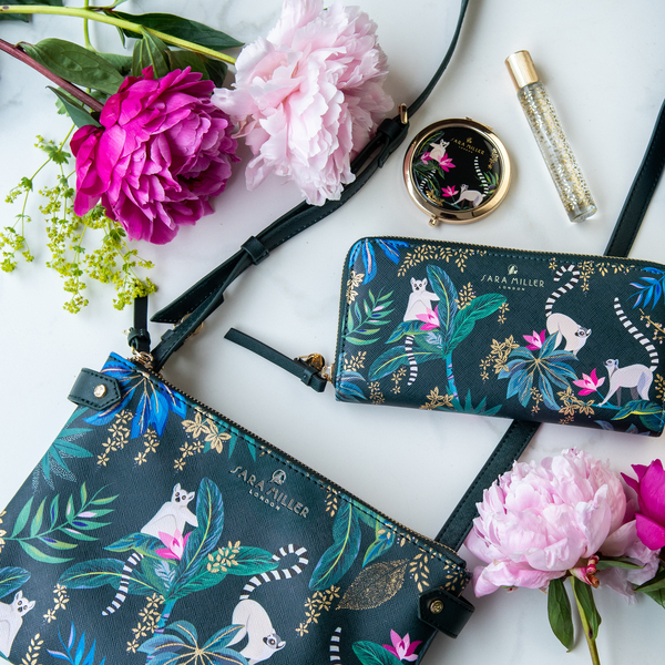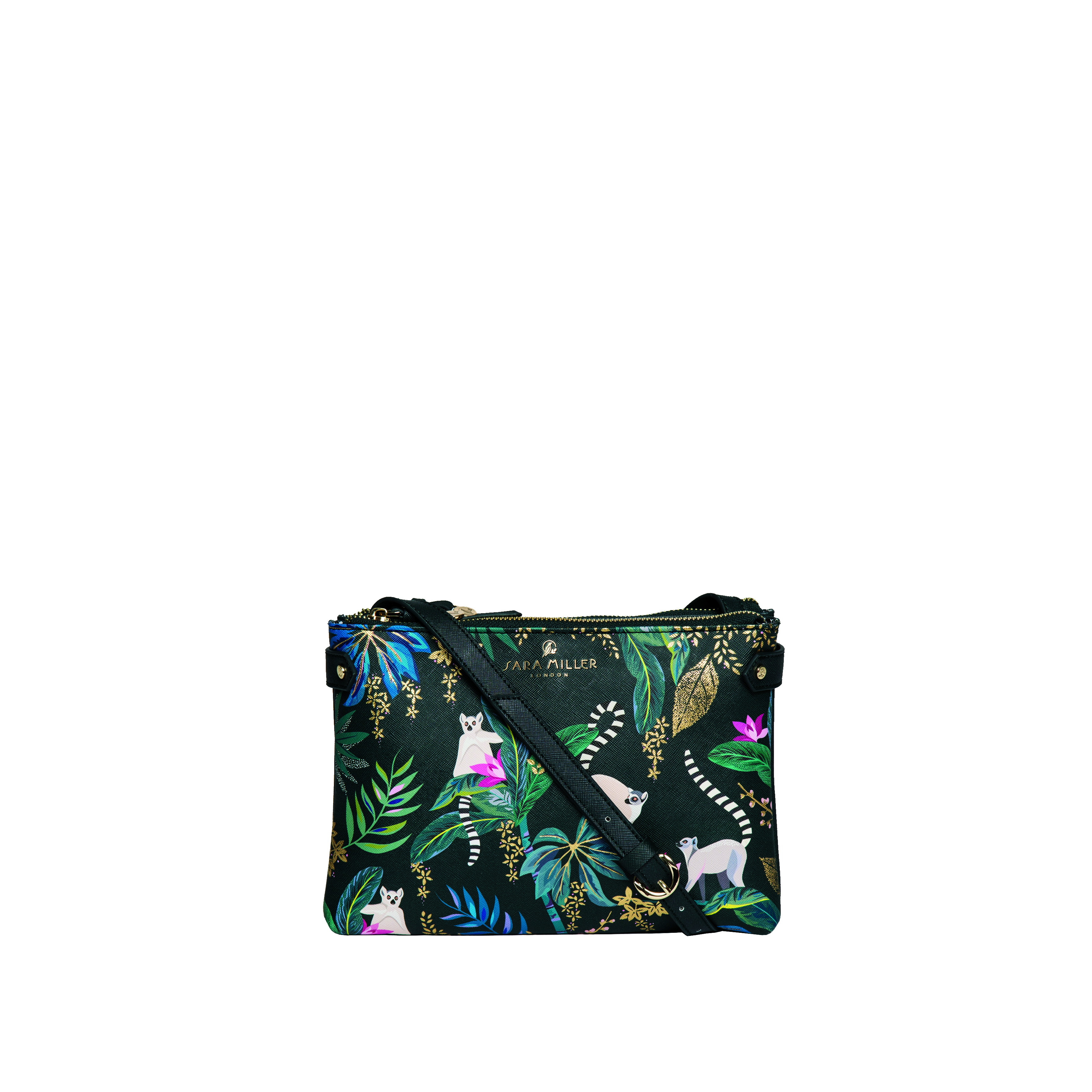 This cross body bag featuring playful lemurs set amongst exotic jungle foliage, makes the perfect day-to-evening accessory. The long shoulder strap and multiple compartments makes it a great shopping companion or it can also be used as a shoulder bag in the evening. The charming lemur print is a fun yet striking design with the added luxury of decorative gold foil details. Embellished with a delicate gold logo, etched Sara Miller London zip pulls and gold studs, the intricate gold detailing is beautifully set against the durable yet luxurious saffiano embossed fabric. Paired with an eye-catching striped lining complimenting the fun and playful feel of the outer design.