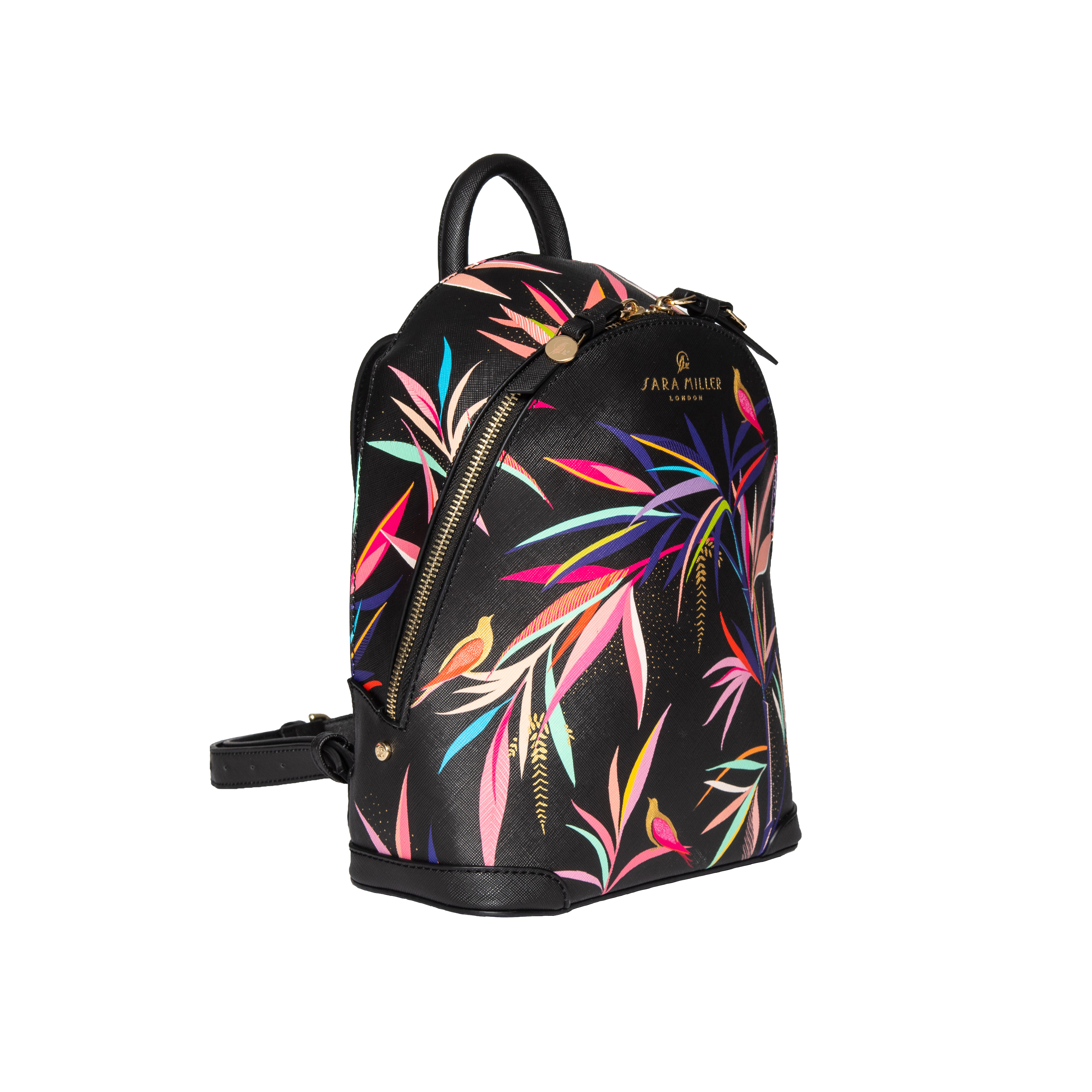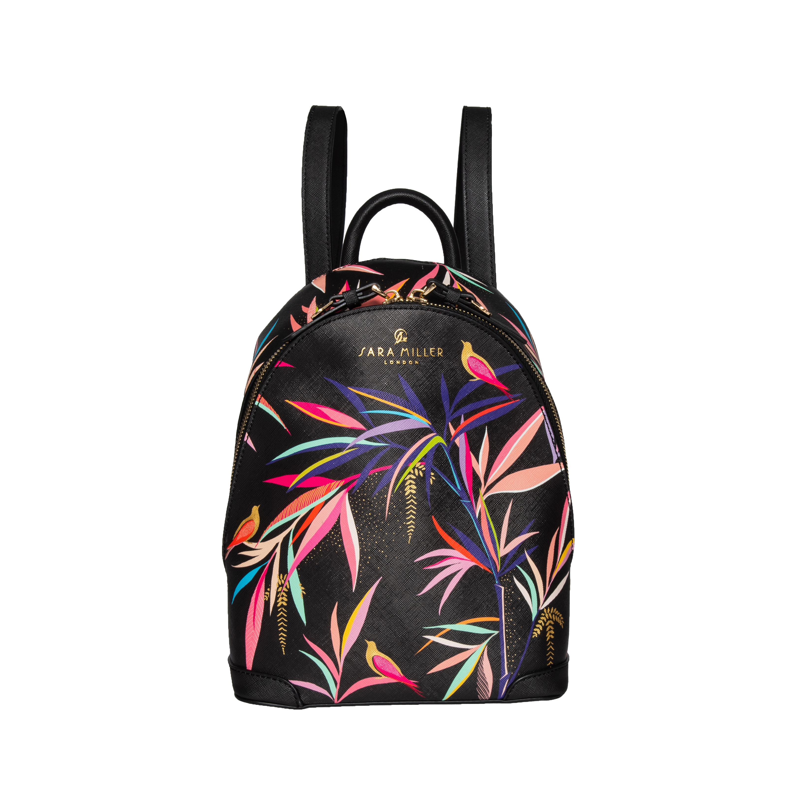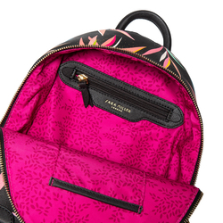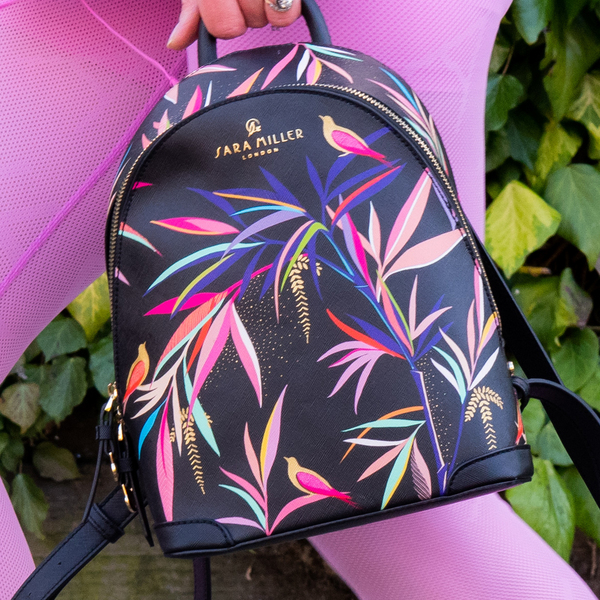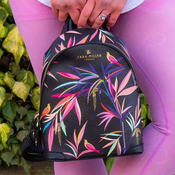 A practical yet stylish mini backpack featuring exotic birds nestled amongst the colourful bamboo flora of an oriental garden, perfectly designed for your everyday essentials and ideal for a day out exploring. This on-trend bamboo print is a contemporary and colourful design with the added luxury of decorative gold foil details. Embellished with a delicate gold logo, etched Sara Miller London zip pulls and gold studs, the intricate gold detailing is beautifully set against the durable yet luxurious saffiano embossed fabric. Paired with a vibrant fuchsia lining in a subtle two-tone leaf print complementing the elegant, decorative outer design.