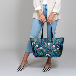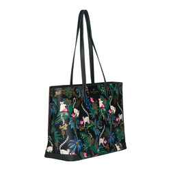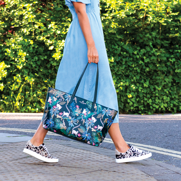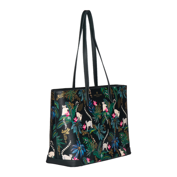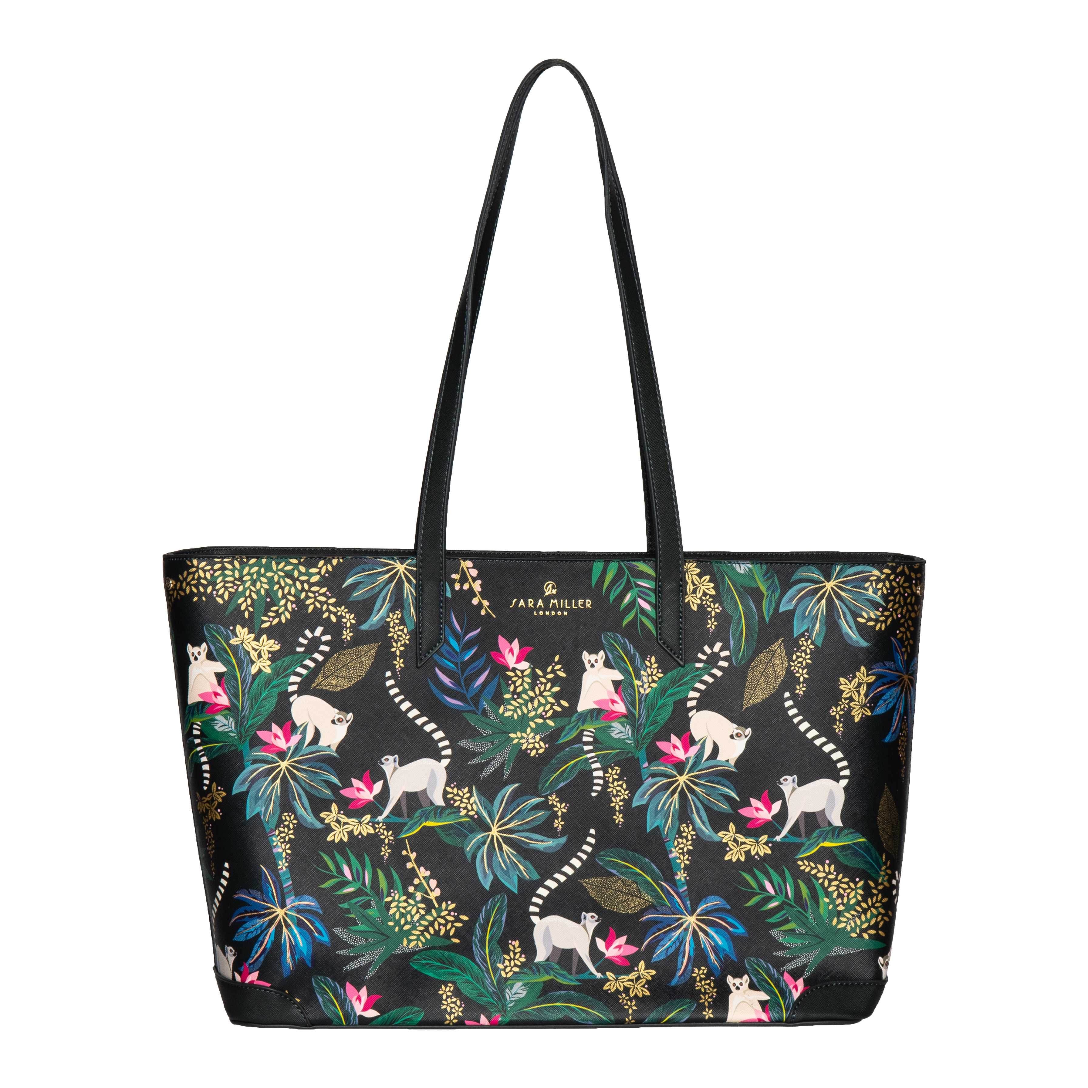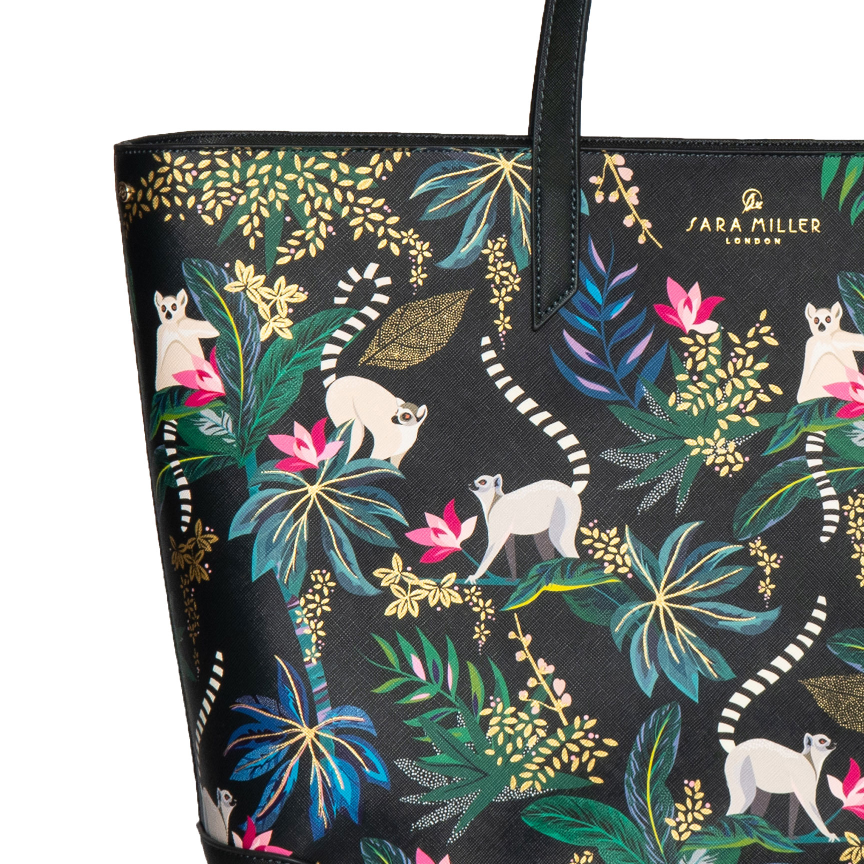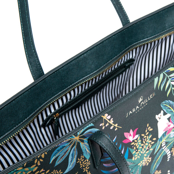 A generous-sized tote in a statement print featuring playful lemurs set amongst exotic jungle foliage, perfect for carrying all your everyday essentials whilst adding a stylish touch to any outfit. The charming lemur print is a fun yet striking design with the added luxury of decorative gold foil details. The tote features a zip-top closure for security and long shoulder drop handles for ease of carrying. Embellished with a delicate gold logo, etched Sara Miller London zip pulls and gold studs, the intricate gold detailing is beautifully set against the durable yet luxurious saffiano embossed fabric. Paired with an eye-catching striped lining complimenting the fun and playful feel of the outer design.