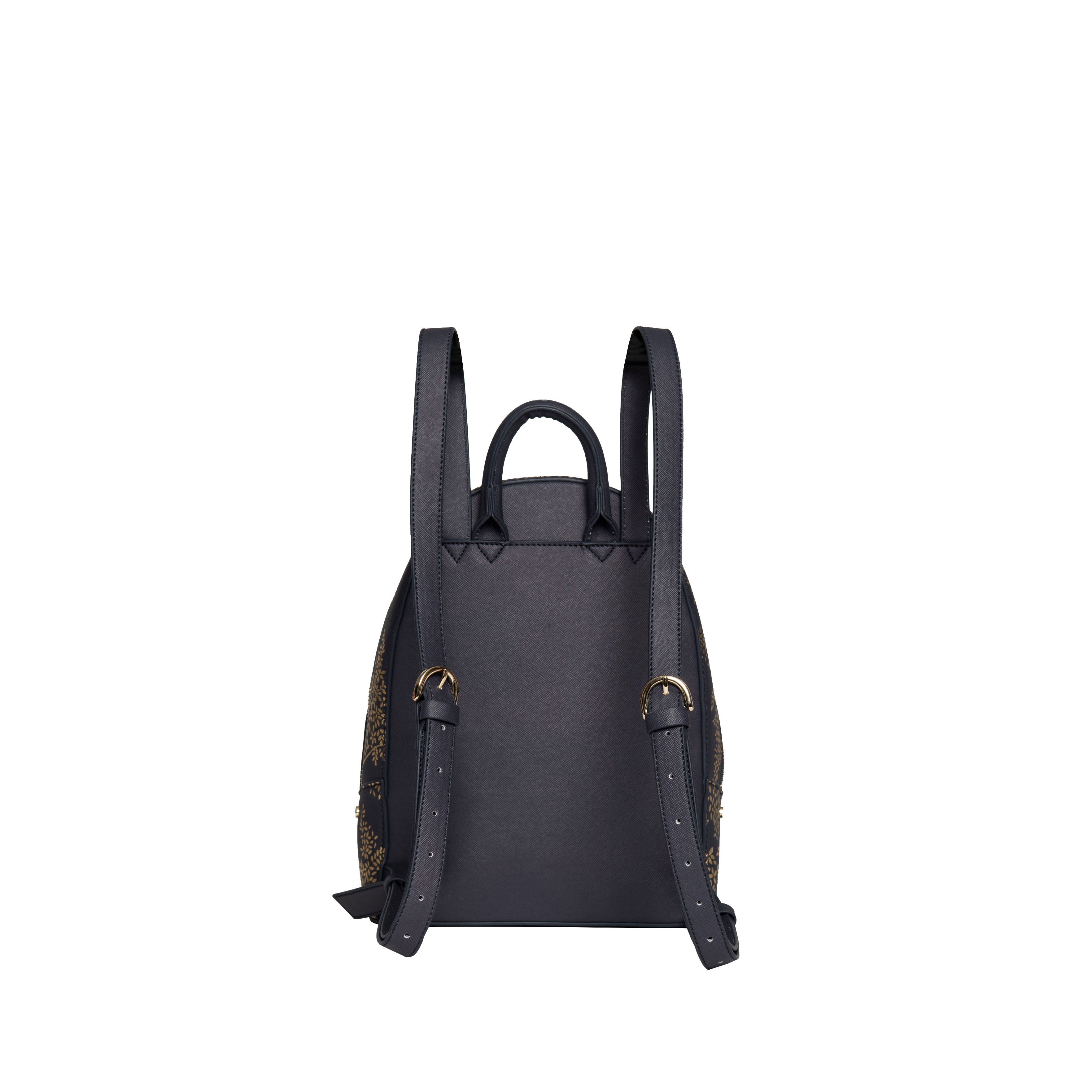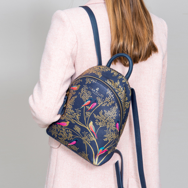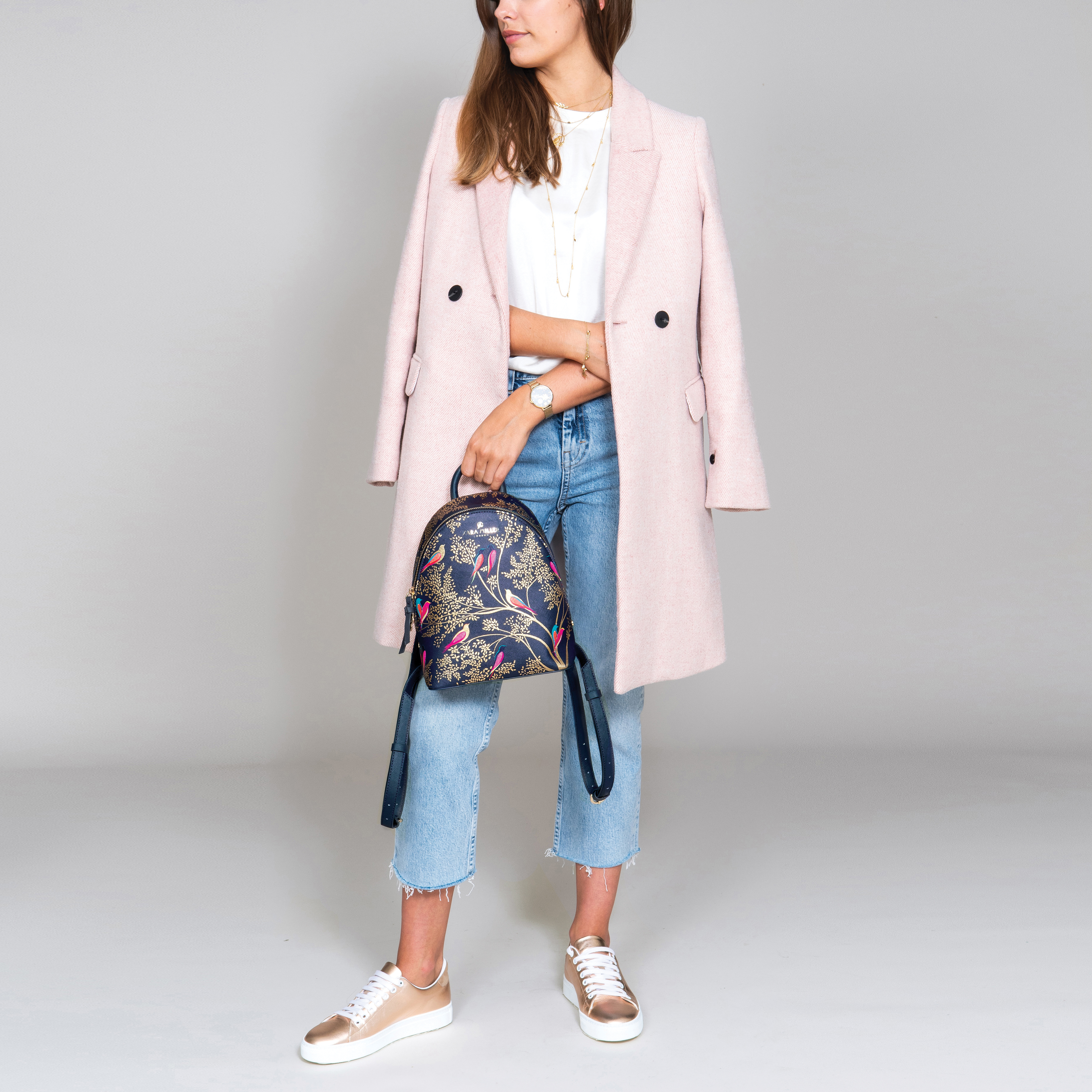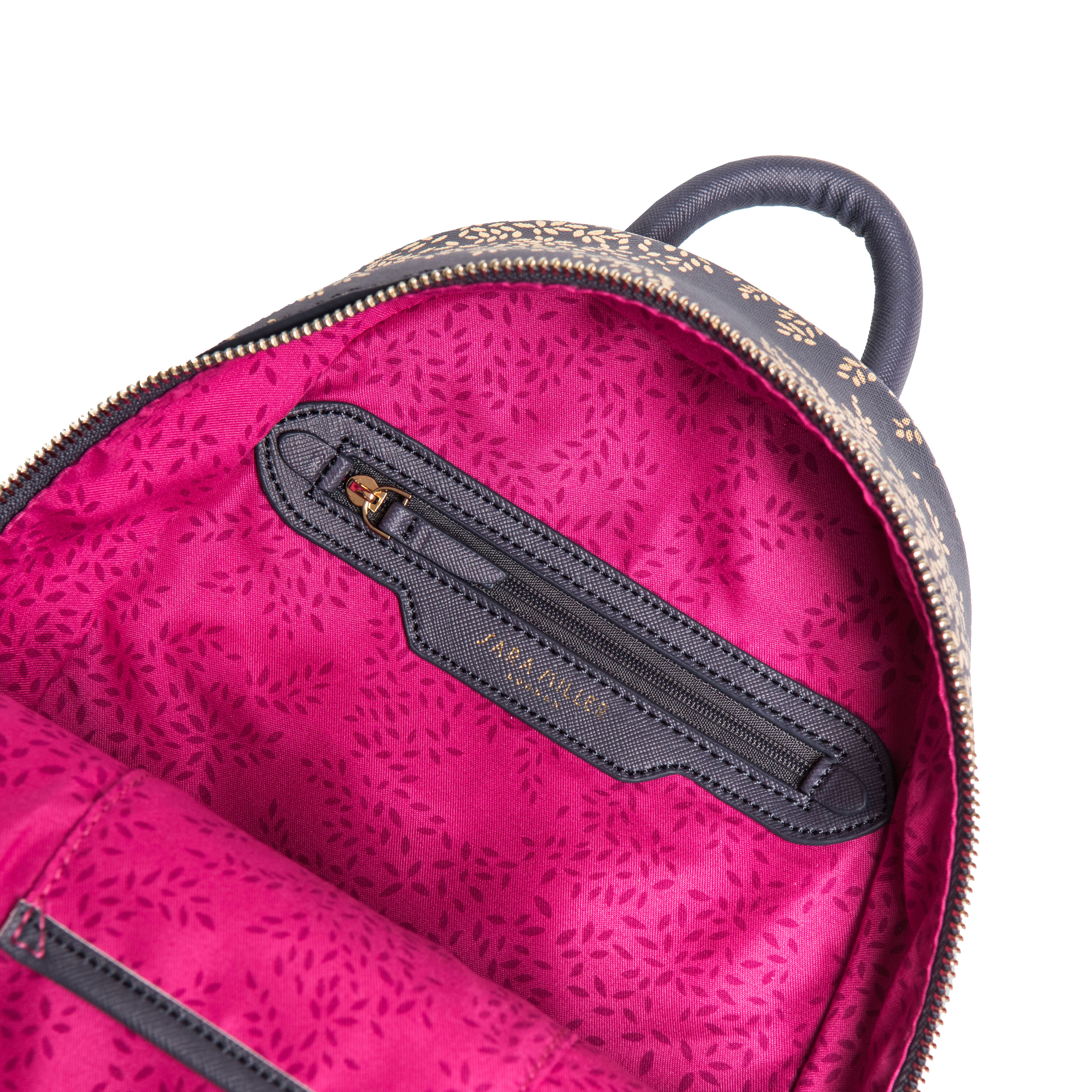 A practical yet stylish mini backpack featuring an array of stunning birds in an enchanted garden setting perfectly designed for your everyday essentials and ideal for a day out exploring. The sophisticated smokey blue colour-way makes it easy to wear with the added luxury of the decorative gold foil print. Embellished with a delicate gold logo, etched Sara Miller London zip pulls and gold studs, the intricate gold detailing is beautifully set against the durable yet luxurious saffiano embossed fabric. Paired with a striking fuchsia lining in a subtle two-tone leaf print complimenting the elegant, decorative outer design.
