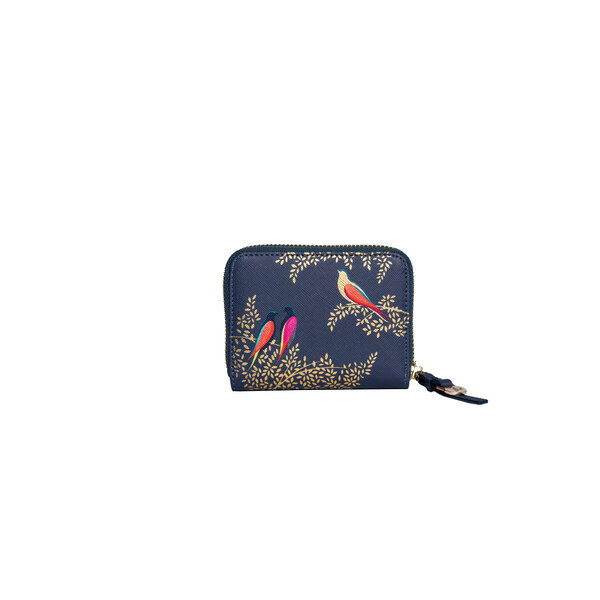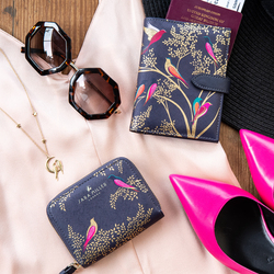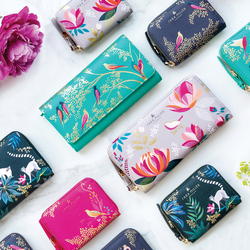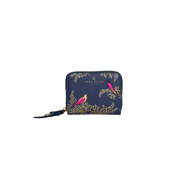 This elegant purse features stunning birds in an enchanted garden setting. It is ideal for everyday use, with room for both cards and cash essentials, and perfect for popping into smaller handbags. The smokey blue print is both sophisticated and stylish with the added luxury of decorative gold foil details. Zip opening embellished with a delicate gold logo, etched Sara Miller London zip pulls and gold studs, the intricate gold detailing is beautifully set against the durable yet luxurious saffiano embossed fabric. Paired with a striking fuchsia lining in a subtle two-tone leaf print complimenting the elegant, decorative outer design.
