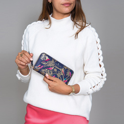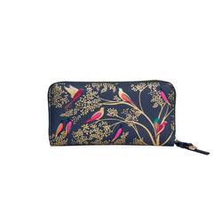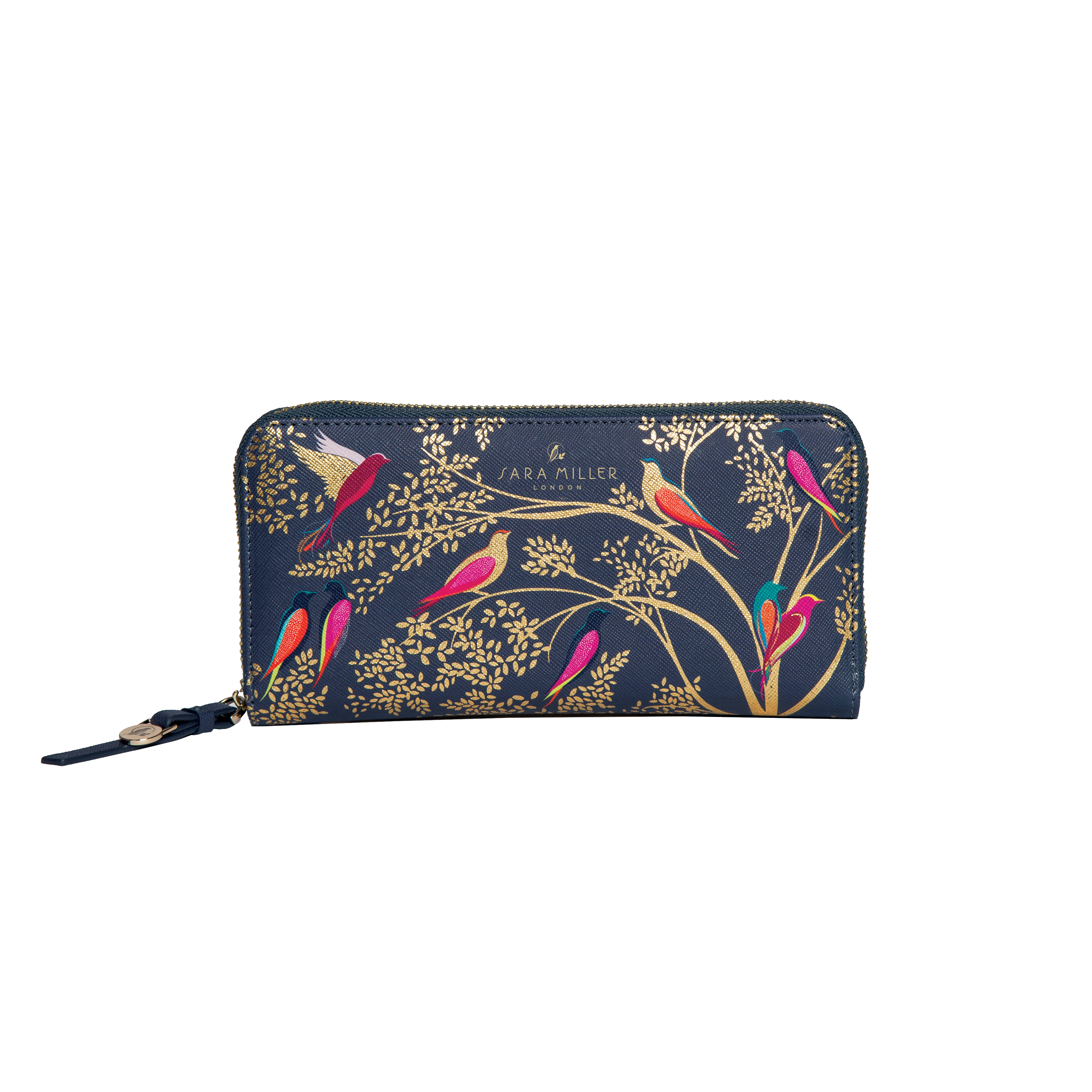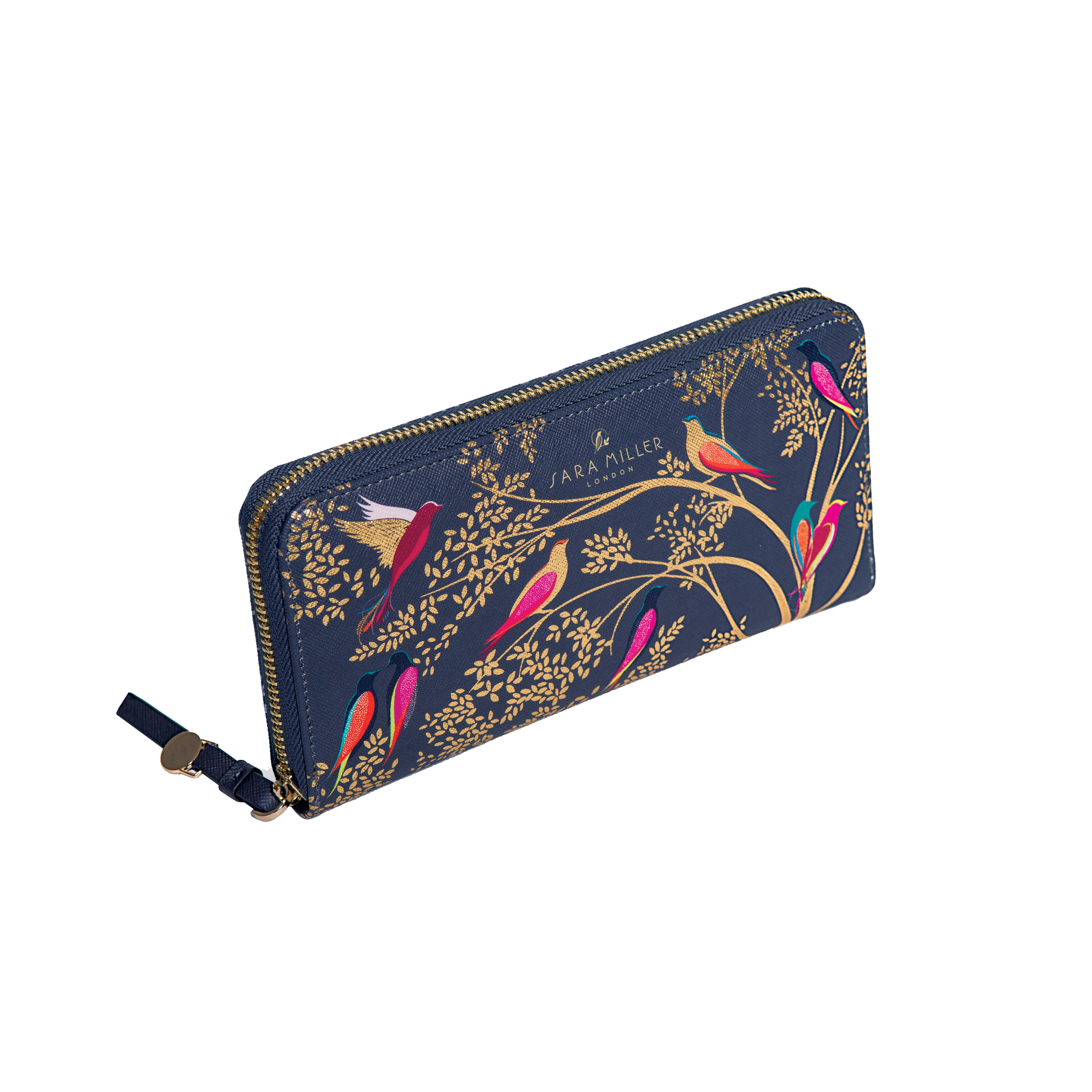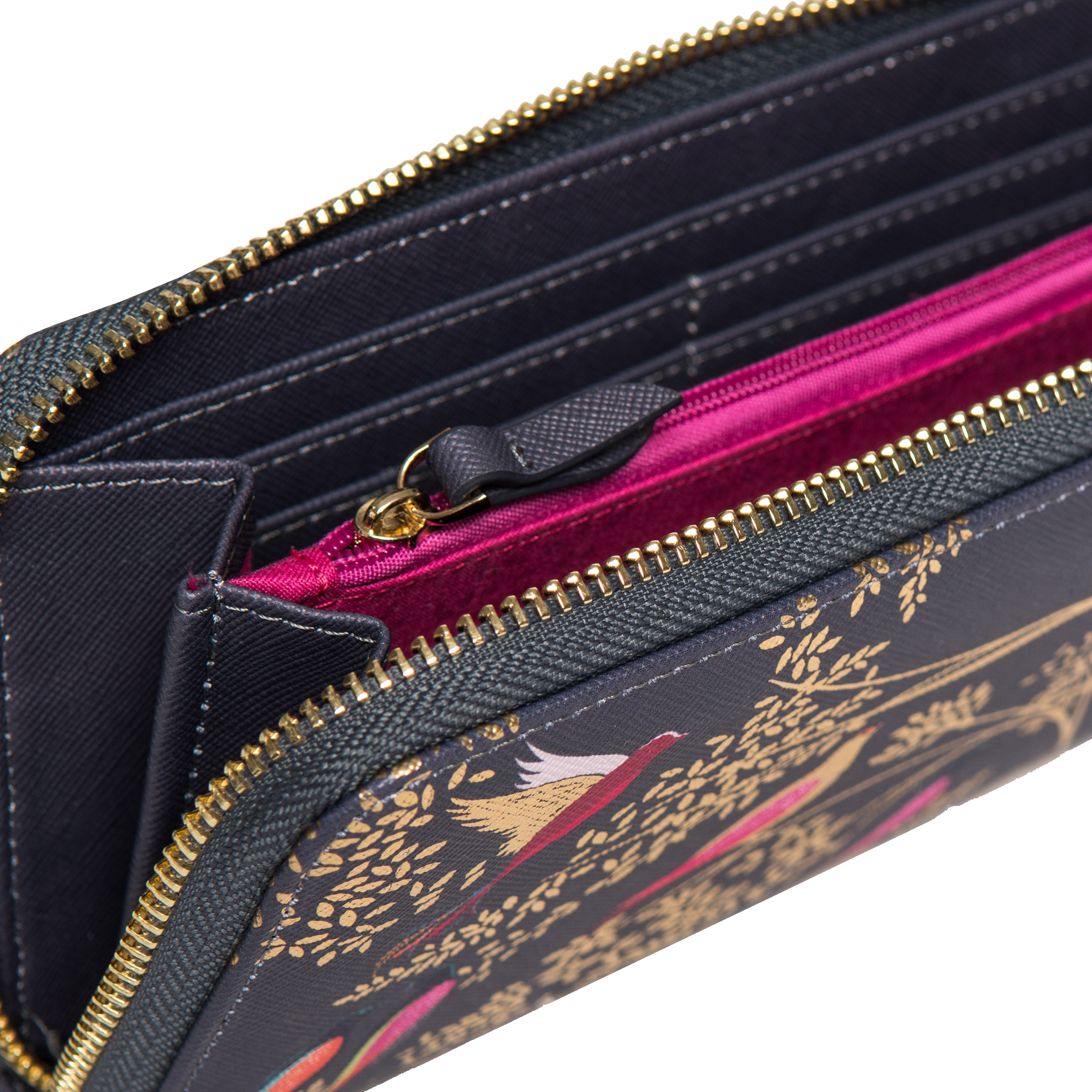 Large zip around purse featuring an array of stunning birds in an enchanted garden setting will add a dash of luxury to your everyday! Essential internal compartments will keep your cards, coins and notes all in one secure place. The distinctive print is both sophisticated and stylish with the added luxury of decorative gold foil details. Zip opening embellished with a delicate gold logo, etched Sara Miller London zip pulls and gold studs, the intricate gold detailing is beautifully set against the durable yet luxurious saffiano embossed fabric. Paired with a striking fuchsia lining in a subtle two-tone leaf print complimenting the elegant, decorative outer design.