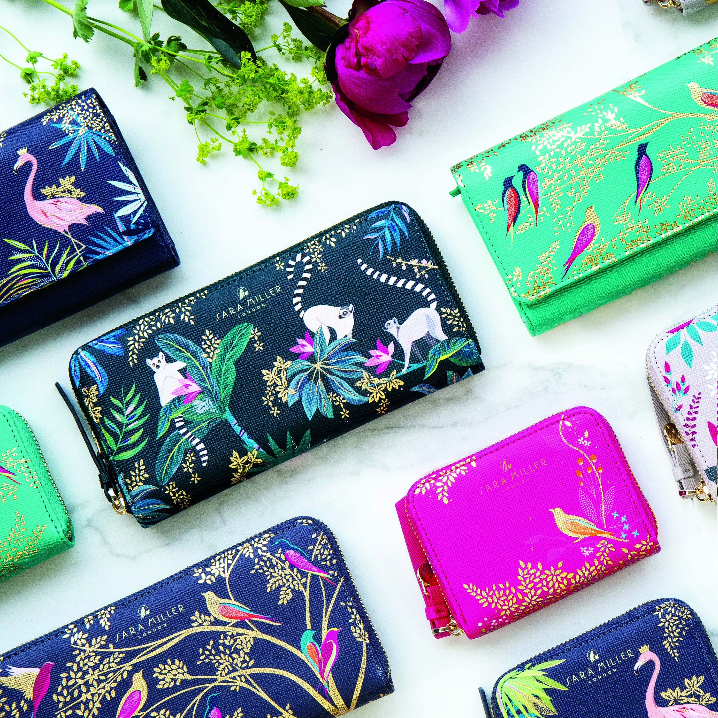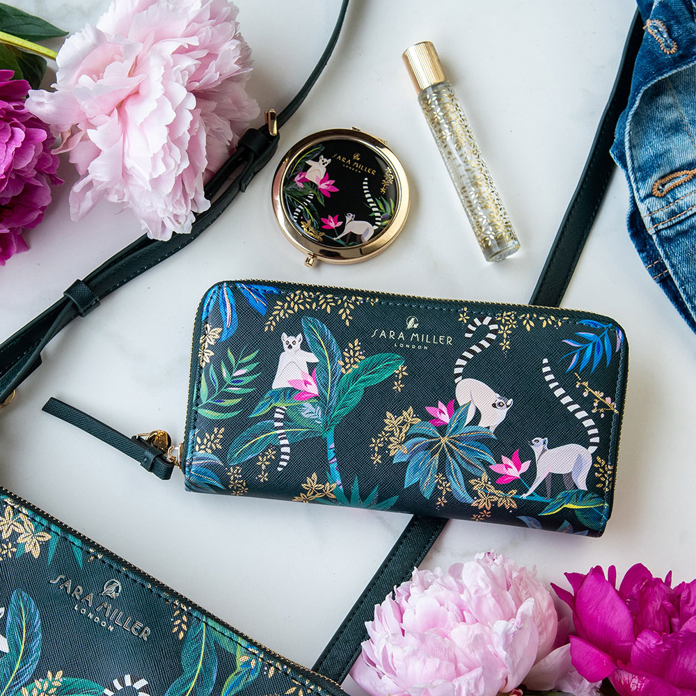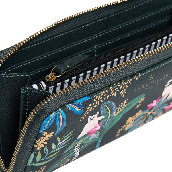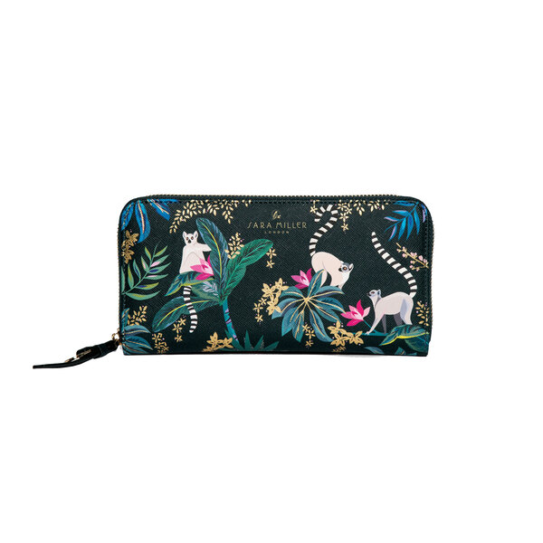 Large zip around purse featuring playful lemurs set amongst exotic jungle foliage will add a splash of colour to your everyday! Essential internal compartments will keep your cards, coins and notes all in one secure place. The charming lemur print is a fun yet striking design with the added luxury of decorative gold foil details. Zip opening embellished with a delicate gold logo, etched Sara Miller London zip pulls and gold studs, the intricate gold detailing is beautifully set against the durable yet luxurious saffiano embossed fabric. Paired with an eye-catching striped lining complimenting the fun and playful feel of the outer design.