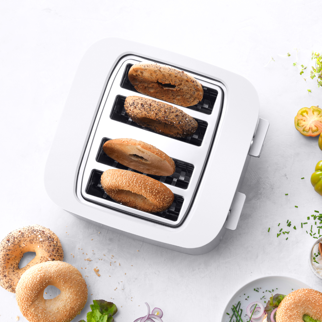The toaster features seven browning levels and three automatic programmes. Moreover, both the left and right slot can be individually set. The warm up feature allows you to reheat cold toast. The thaw feature allows you to toast frozen bread direct from the freezer. And the bagel feature with slice centring allows you to achieve ideal bagel toasting results: crispy on the outside, toasted on the inside.