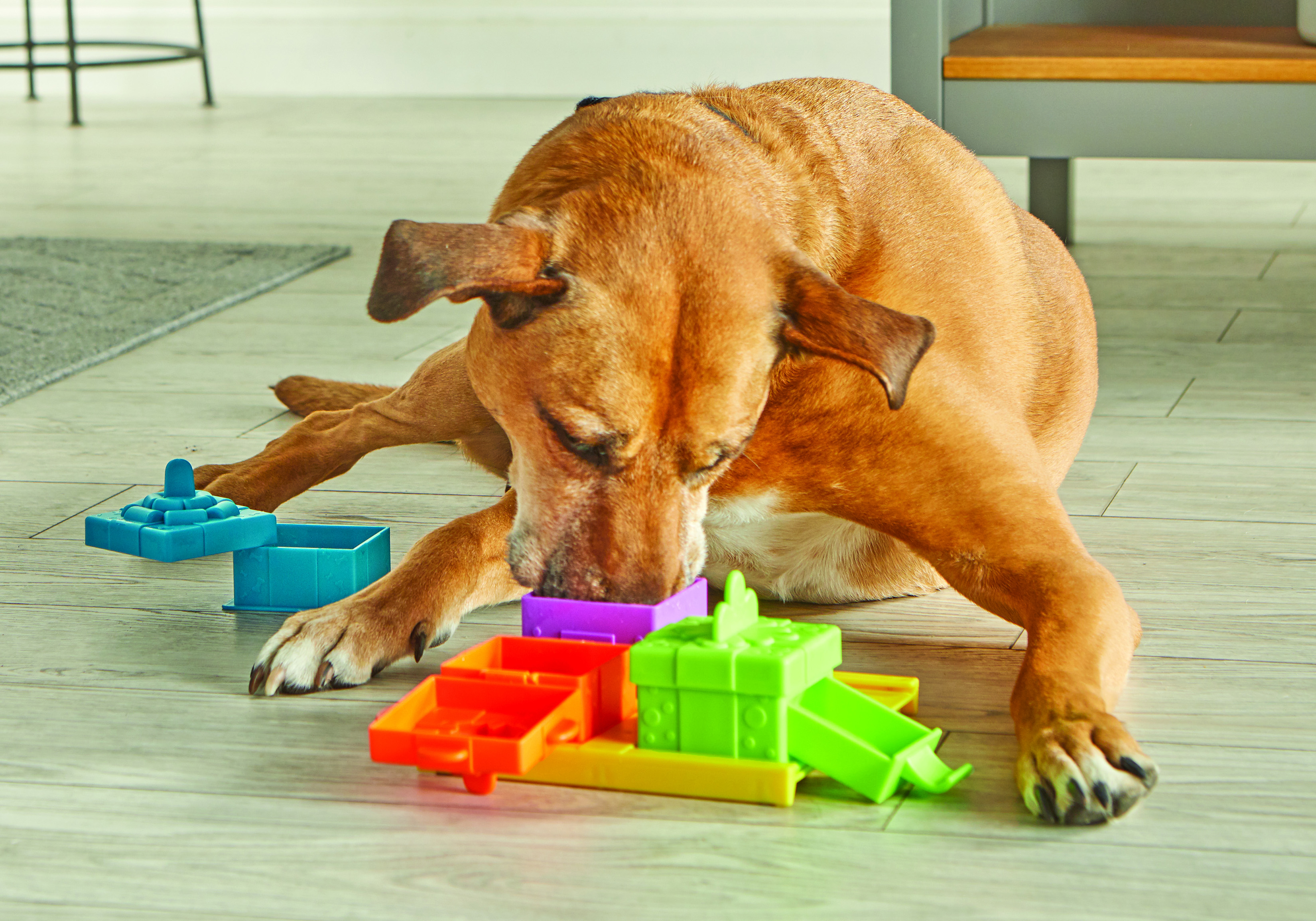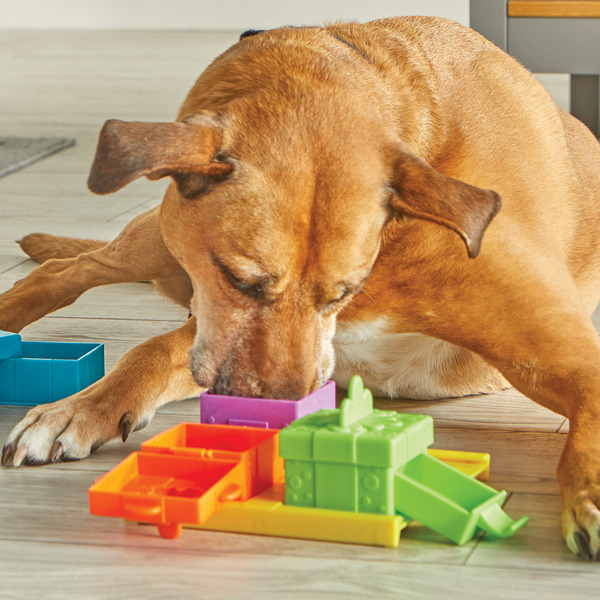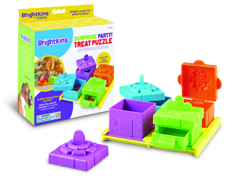At this puzzle party, pooches discover boredom-busting mental stimulation with the Surprise Party! Treat Puzzle from Brightkins™. Dogs use their noses and paws to sniff out the treats hidden inside the presents in this this slow feeding interactive game. Place treats or kibble inside each present, and cover with the present lids. Then encourage your dog to find the treats hidden inside. Each present opens in a different way to keep dogs engaged and learning: flip the orange lid; slide out the green drawer; swivel the blue lid; and lift off the purple lid. The pieces are made from high quality materials with smooth edges and are easy to clean with warm soapy water. Note: This is an interactive training tool, it is not a chew toy. Adult supervision is required. Available on Amazon: B0B92R597S