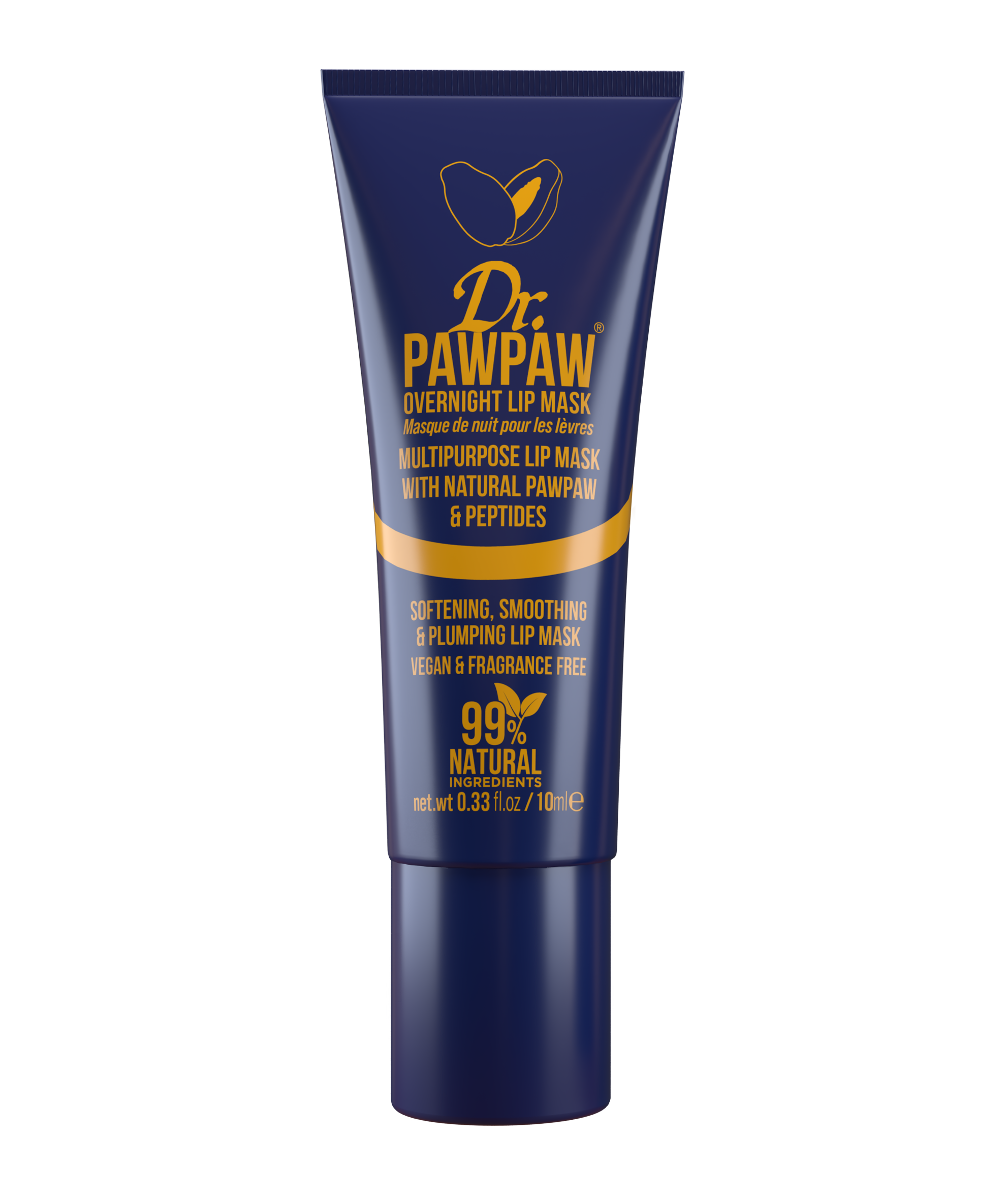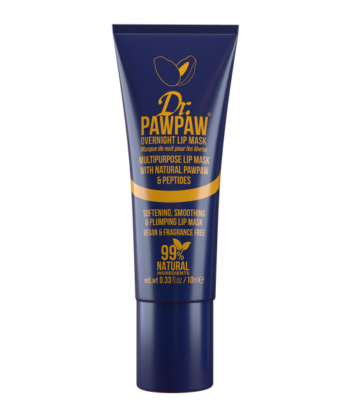 Our award-winning, 99% natural, Overnight Lip Mask is packed full of Pawpaw (papaya), Aloe Vera and Olive Oil. The Dr.PAWPAW Overnight Lip Mask melts into the lips whilst you sleep, fully absorbing for an intense lip mask treatment. Additional Natural Peptides work to both plump the lips and smooth any fine lines. See effective results from the first application, increasing in performance the more it’s applied. Can be used both day and night to reveal fuller, smoother and more defined lips. Formulated with rich natural ingredients including: Pawpaw Fruit - rejuvenates, nourishes and hydrates Aloe Vera - full of antioxidants and soothing antibacterial properties Olive Oil - gently hydrates the skin without feeling greasy Castor Oil - helps maintain moisture and protect the skin Natural Peptides - smoothes and plumps Suitable for all skin types, including sensitive skin. PETA approved. Vegan. Cruelty-free. 99% Natural.