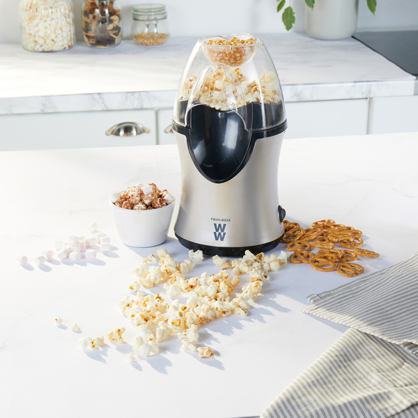 Create delicious fresh popcorn using the electric Popcorn Maker from Progress by WW. Conveniently easy to use, the snack maker has a detachable cover to speed up cleaning time. No need to use oil, simply add kernels and enjoy a fresh, flavoursome snack in under 3 minutes. Experience the cinema at home, perfect for movie nights, sleepovers and parties, the 1200 W maker uses hot air to pop. Use the integrated measuring cup to measure exactly what you need.