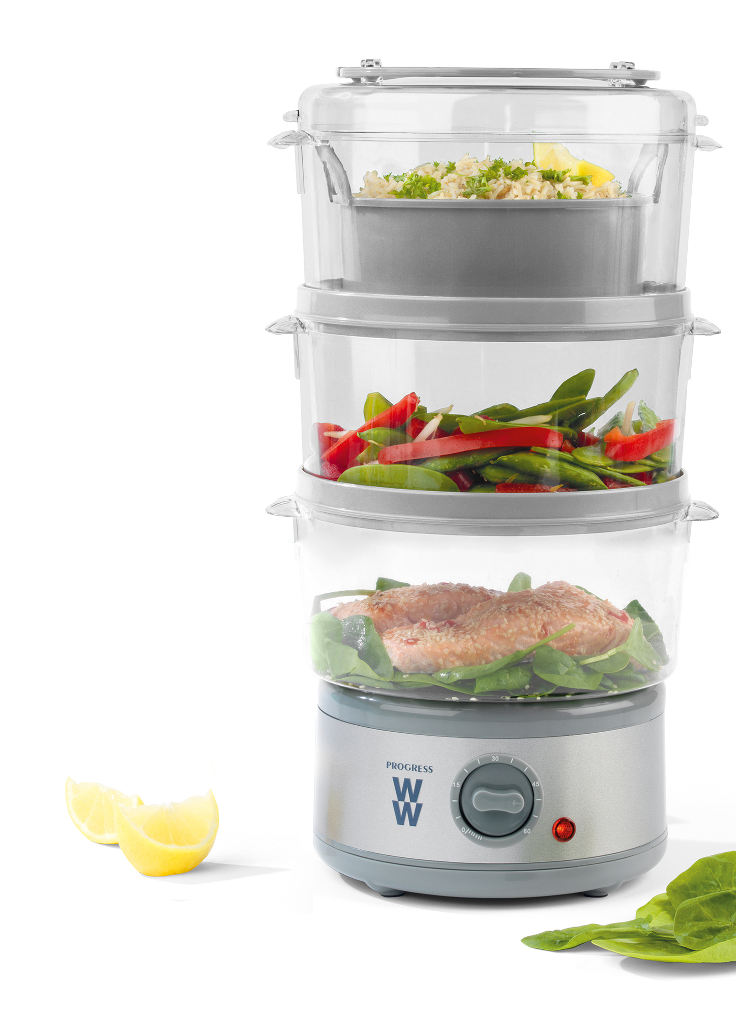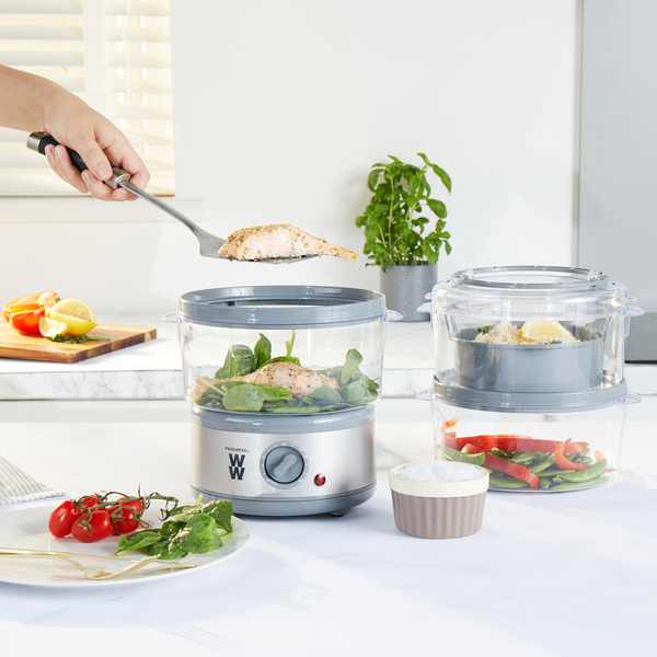 Cook healthier meals from scratch with the Progress by WW Steamer featuring 3 tiers to cook meat, fish, vegetables and rice in one go. With an impressive 7.5 L capacity, create healthier meals for the whole family. A 60 minute timer means you can easily measure cooking times without the fuss. Incredibly easy to use, the steamer also includes a rice bowl for perfectly fluffy rice, and 3 removable steam baskets whether you need 1, 2 or 3 depending on your portions.