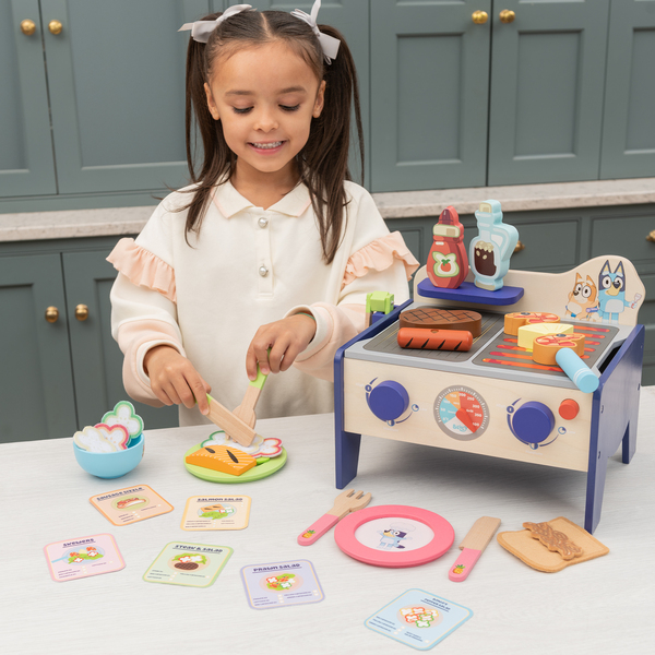 Hear that delicious food sizzle on the Wooden Bluey BBQ & Salad Set! Whether your little chef is cooking up a delicious Sausage Sizzle or a healthy Prawn Salad, the 6 recipe cards make it easy to follow the ingredients included in each dish and provides a fun matching game. Little ones will have to multi-task controlling the heat of the BBQ with the clicking dials alongside serving the dishes. With more interactive features included, it's the perfect pretend-play set for Bluey fans.