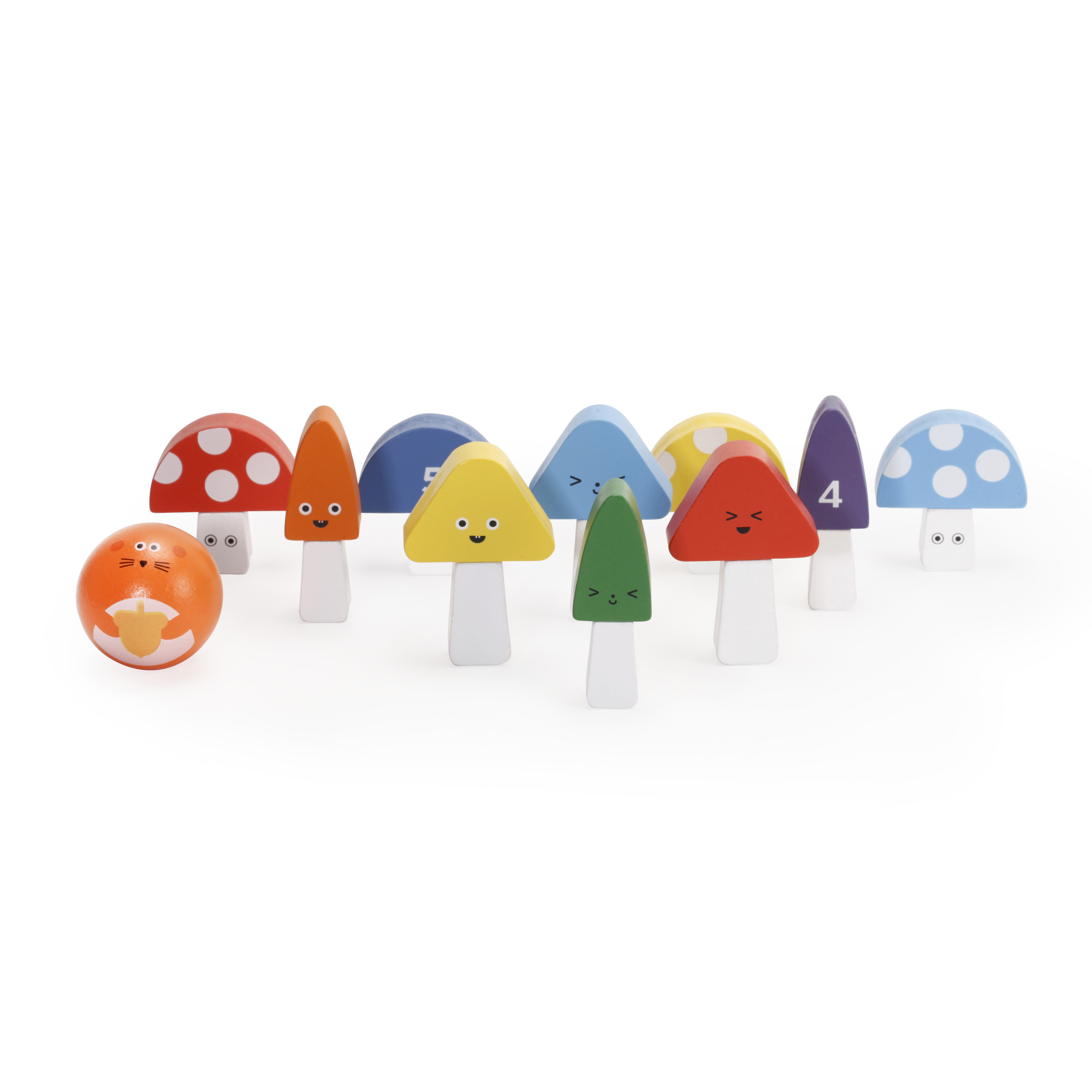 Roll the pesky squirrel and try to knock down as many mushrooms as you can. Includes: 10 mushroom pins, 1 squirrel bowling ball, 1 cotton draw string storage bag. , Design: Goodlines