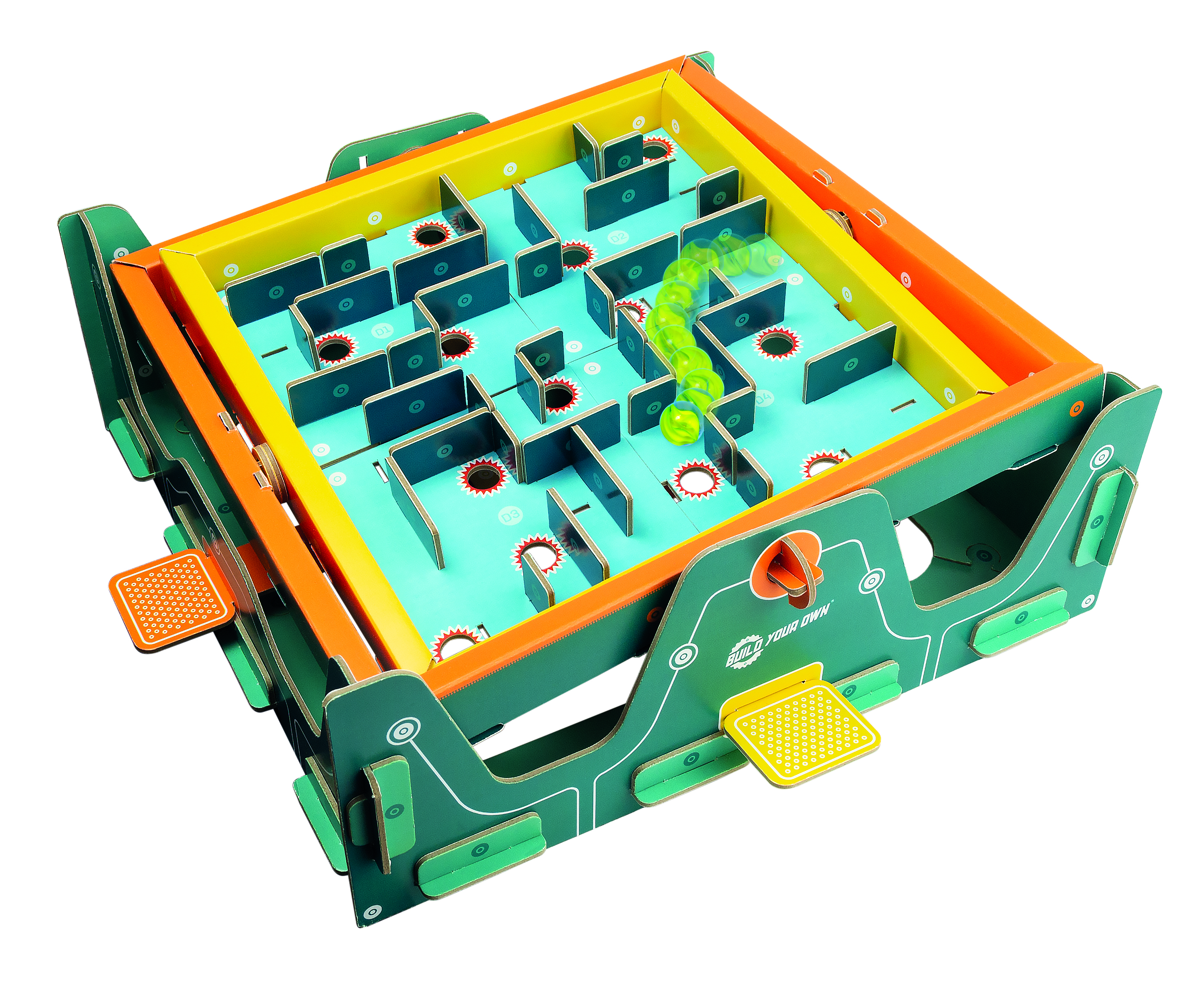 Two games in one and double the fun, this innovative Marble Labyrinth provides hours of entertainment. Place your swirly glass marble at the starting point, then use the push and pull tabs to tilt the labyrinth and steer your marble to the finish. Play alone or challenge friends and family. Watch out for the traps! You’ll need practice and a steady hand. Take your time and before long you’ll be a master! Ready for a new challenge? Move the walls around to create your own labyrinth design. You can even rearrange the base boards to really mix things up! Or why not try your hand at the Marble Frenzy game? Replace your labyrinth boards with the Marble Frenzy layer and you’re set to go. Place your marble in the start area, then use your awesome skills to guide each of the marbles into the scoring holes. Beware of the trap holes! Easy to assemble using slot together techniques – there’s no glue, no mess, no fuss. Everything you need is provided in the kit – simply follow the instructions: press out the pre-cut parts, build and you’re ready to go! Our Marble Labyrinth is suitable for children 8 years+ and is best enjoyed as a family experience. You’ll have brilliant fun building your labyrinth as a shared activity, then it’s time to put your maze navigation skills to the test! Made using sustainable cardboard, Build Your Own’s Marble Labyrinth is not only fun and engaging to play with, but also eco-friendly. Mess-free, slot together cardboard construction 90-minute build