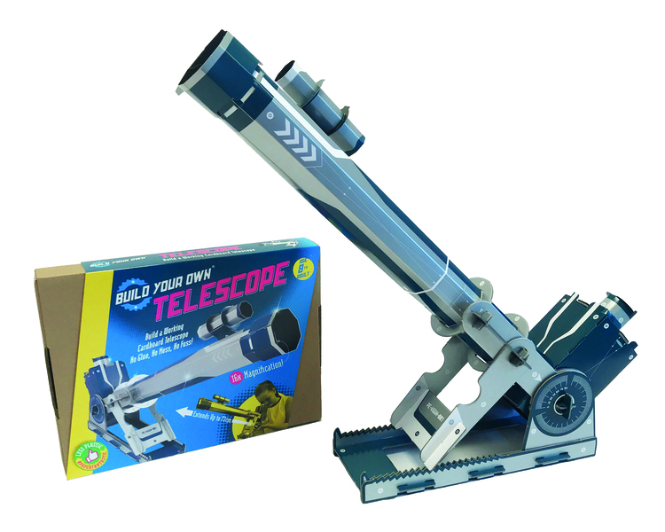 Get inspired with our Build Your Own cardboard telescope kit. The box contains everything you need to start exploring our world and beyond. Follow the detailed instructions, press out the pre-cut parts and add the lenses and mirror to build a fully functioning refractor telescope! You’ll be amazed at what you can see with the 16x magnification! Use the integrated spotting sight to line up your telescope, adjust the angle and focus tube and everything will become clear. Made using sustainable cardboards and minimal plastics, we have tried our best to create a product that is not only fun and engaging to use, but also environmentally responsible. Slot together mess free construction – No glue needed Perfect family time activity Use in the day to explore your world Use at night to explore the sky Incredible 16x magnification Real glass optic lens Sliding focus tube Angle finder Built-in spotting sight Includes safety lens caps High quality sustainable cardboard Full instructions included Designed in the UK Fun, educational and supports STEAM Age 8+