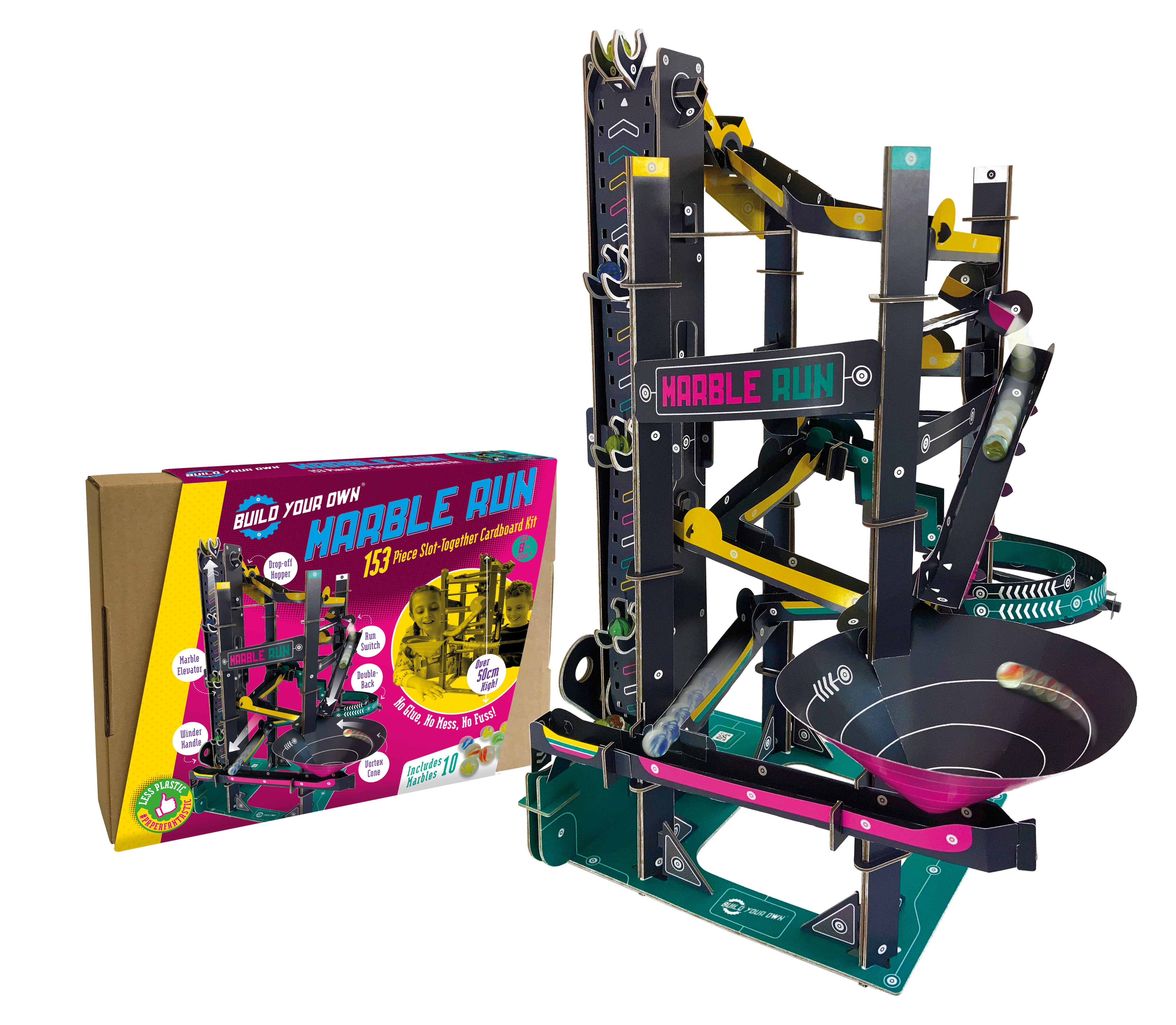 This innovative cardboard marble run is assembled using slot together techniques – no glue, no mess, no fuss. Everything you need is provided in the kit – follow the detailed instructions: press out the pre-cut parts, build and watch them go! Wind the handle to raise the 10 swirly glass marbles up the elevator; then watch as they speed down one of the three different neon coloured tracks. Enjoy endless fun as the marbles twist, turn, drop down the steps, and then whizz round the vortex cone before racing to the finish! Which marble will win?? Our most technical build so far, budding engineers will enjoy the challenge of constructing the Build Your Own Marble Run. And once built, the Marble Run stands at an impressive 50cms tall – you’ll be proud to show it off! A sleek charcoal grey, with contrasting pops of neon – it looks super smart too. The detailed instruction booklets will guide you through each step of the build, and contains helpful troubleshooting tips if you get stuck. You can also find detailed video instructions and support on our website at www.buildyourownkits.com Fun and educational, constructing the Build Your Own Marble Run is the perfect activity for quality family time. You might choose to build it in stages, as this one is more of a project than a quick build. So, grab your fellow builders and have some exciting fun as a family! Building the Marble Run will encourage children to use their imagination and problem-solving skills