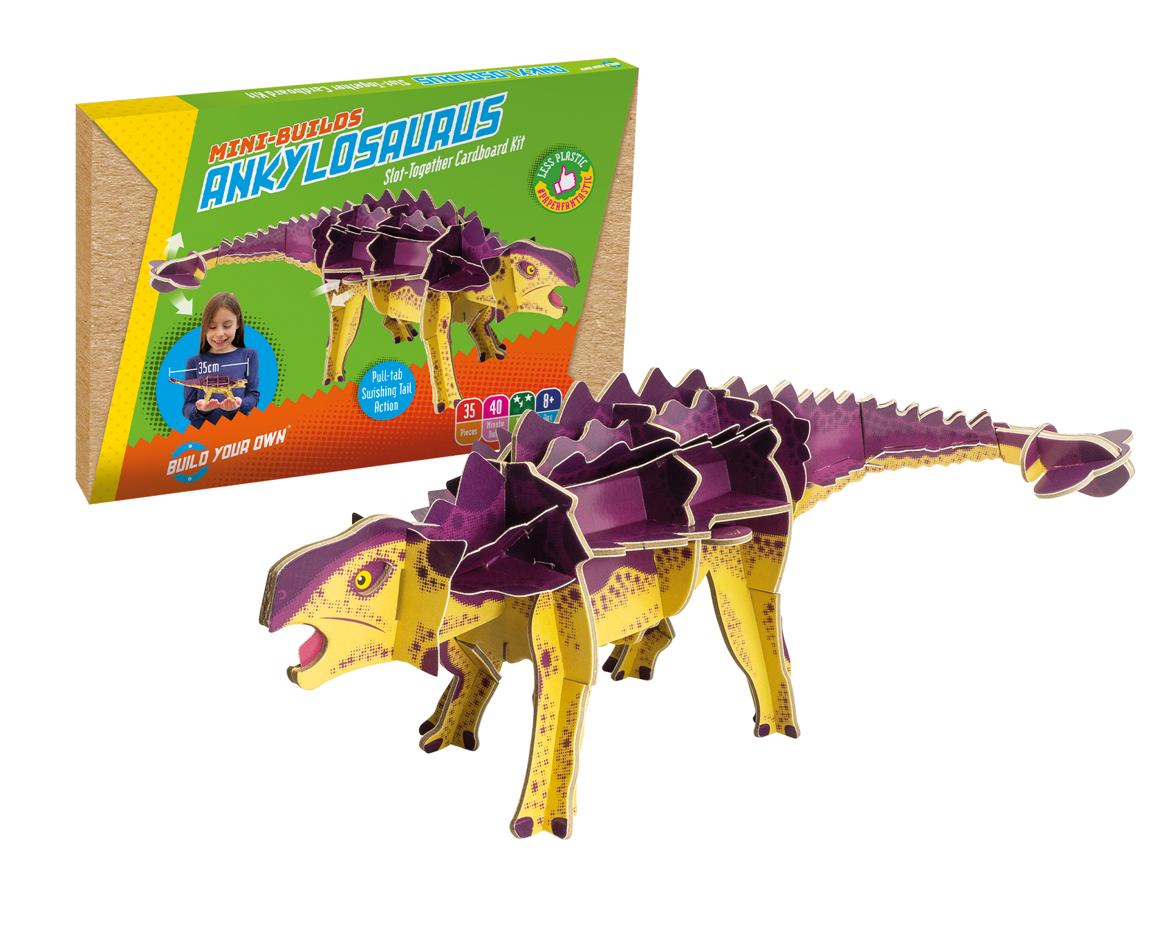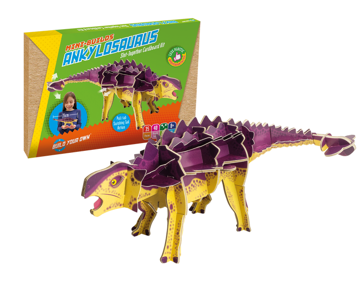 With a heavily armoured body and pull-tab swishing tail action, this plant-eating dinosaur was protected from head to tail with bony plates and spikes. The largest ankylosaur ever, this club-tailed Dino could swing at attackers with bone-shattering force. Ouch! Easy to assemble using slot together techniques – there’s no glue, no mess, no fuss! Everything you need is provided in the kit – simply follow the instructions: press out the pre-cut parts, build and play. This awesome kit also comes with a press-out Ankylosaurus Fact Stand for you to find out more about this famously armoured dinosaur. Our Mini Builds are suitable for 8 years+ and are best enjoyed as a family experience. You’ll have great fun building your Ankylosaurus as a shared activity, plus there’s lots to learn together about this massive Dino. Made using 100% sustainable cardboard and paper, Build Your Own’s Ankylosaurus is not only fun and engaging to play with, but also eco-friendly.