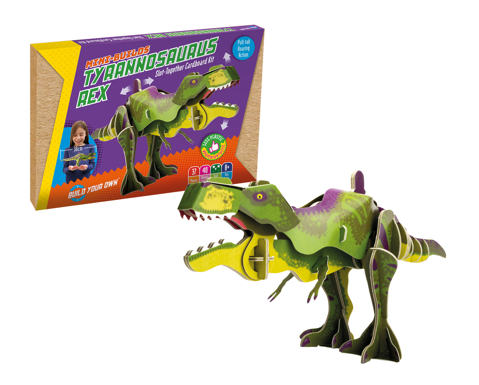 With a clever pull-tab roaring action and striking bold markings, this deadly bone-crusher was a heavyweight hunter with strong teeth and a powerful jaw. The most terrifying and famous dinosaur of all. Easy to assemble using slot together techniques – there’s no glue, no mess, no fuss! Everything you need is provided in the kit – simply follow the instructions: press out the pre-cut parts, build and play. This innovative kit also comes with a press-out Tyrannosaurus Rex Fact Stand for you to learn more about this dinosaur favourite. Our Mini Builds are suitable for 8 years+ and are best enjoyed as a family experience. You’ll have great fun building your Tyrannosaurus Rex as a shared activity, plus there’s lots to discover together about this roarsome Dino. Made using 100% sustainable cardboard and paper, Build Your Own’s Tyrannosaurus Rex is not only fun and engaging to play with, but also eco-friendly.