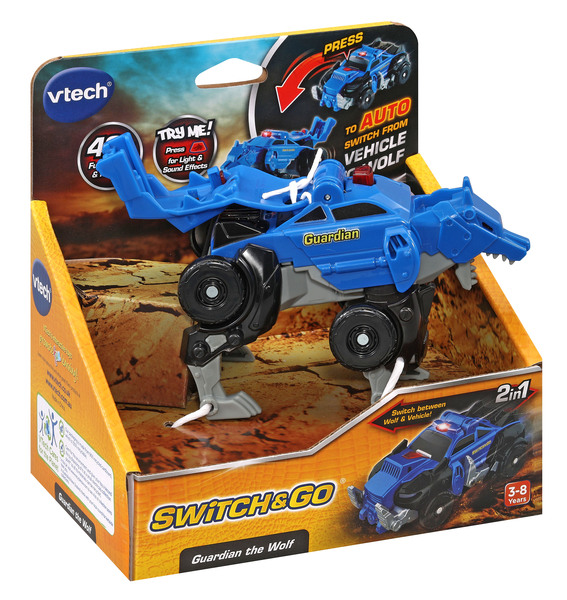 Wolfpack, assemble! Guardian the Wolf is here and ready to Switch & Go! This amazing 2-in-1 toy by VTech can instantly switch from a vehicle to wolf in just a press of a button! Watch as your vehicle switches automatically in the blink of an eye to a mighty wolf! Easily switch Guardian back into vehicle mode in just a few simple steps! Guardian the Wolf plays lively wolf and vehicle sound effects as you interact with him, as well as fun phrases and wolf facts! See cool light effects with the sounds and as Guardian speaks too! Let's Switch & Go! Intended for ages 3-8 years.