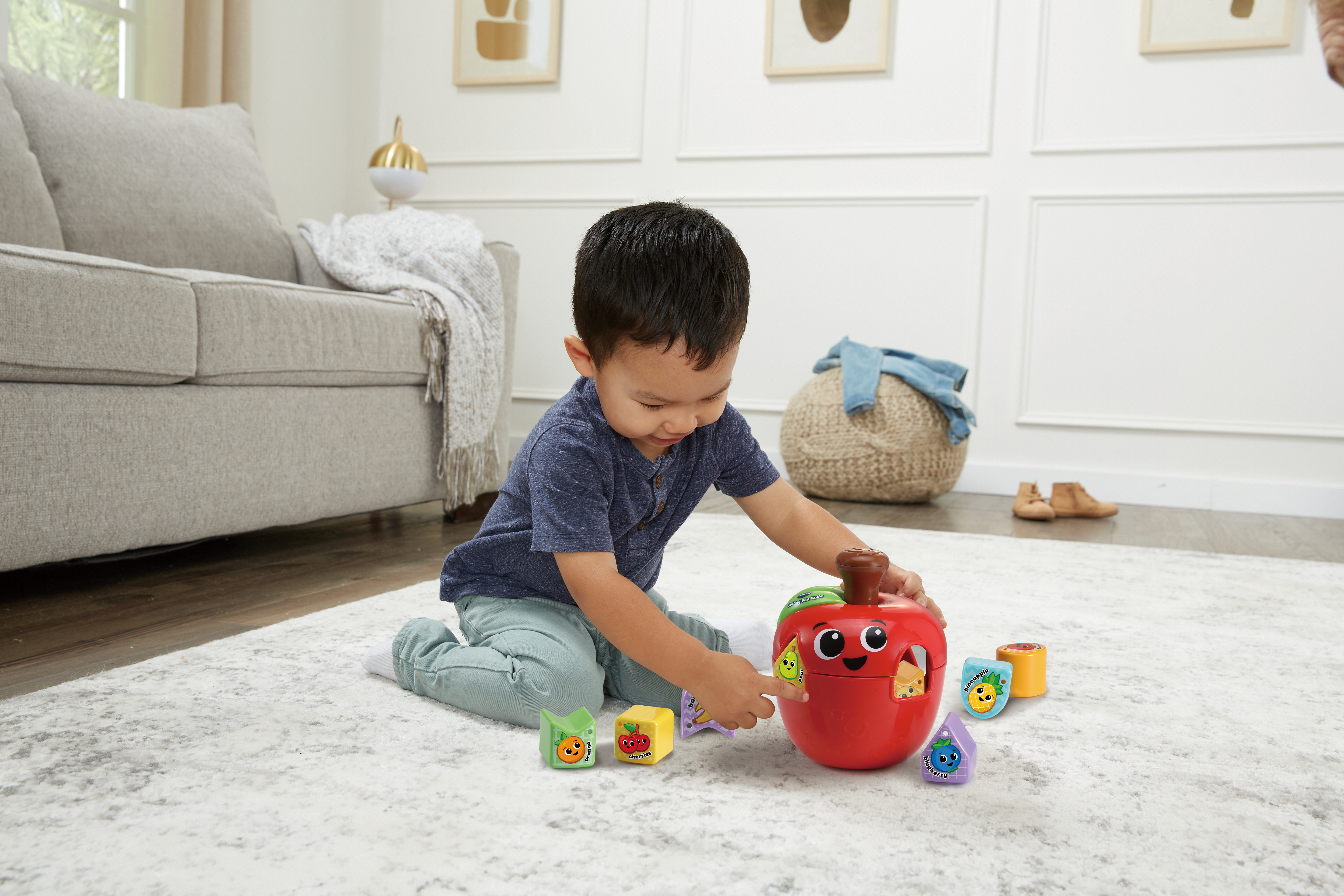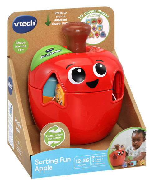 Let’s spin and sort with the Sorting Fun Apple by VTech® A new spin on shape sorting! Made from 90% reclaimed plastic, this cute, chunky shape sorter apple spins at the press of its stork, spinning around to create both classic shapes and more unique shapes – go beyond square, diamond, oval and bow! Comes complete with 10 different shapes with 2 levels of learning: Level 1- 4 classic shapes or level 2- 6 special shapes. Also introduces 10 different fruits. Encourages & enhances hand-eye coordination, spatial reasoning, logical thinking & discovery & exploration. Intended for ages 12-36 months