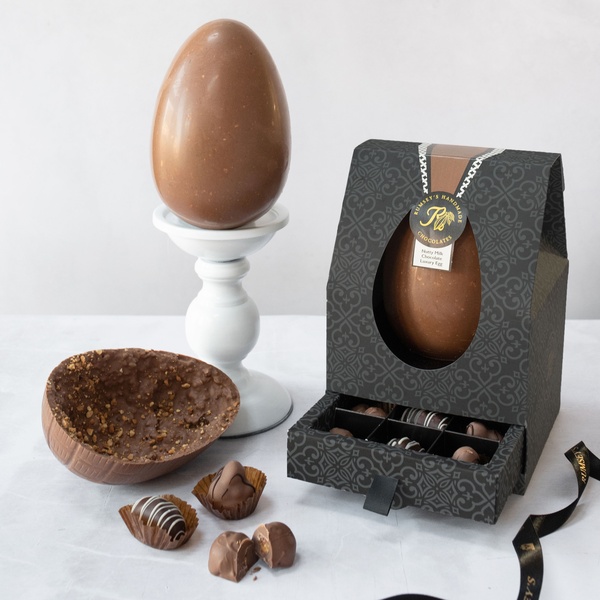 Showstopping nut studded milk chocolate Easter egg, filled with 9 of Rumsey's award winning handmade nutty chocolates. 3 x Macadamia 3 x Brazilia 3 x Hazelnut Cluster 400g. All cardboard is recyclable and the plastic window and tray cover are made from rPET and are also widely recyclable. From one of the many amazing Trustpilot reviews: 5 Stars "I ordered the chocolate nut Easter egg with a tray of chocolates. The tray of chocolates was amazing- delicious, premium and unique. The Easter egg was good too - creamy, quality chocolate with lots of nut pieces. Delivered on time and in perfect condition."