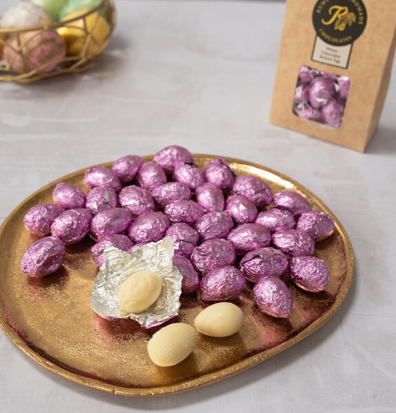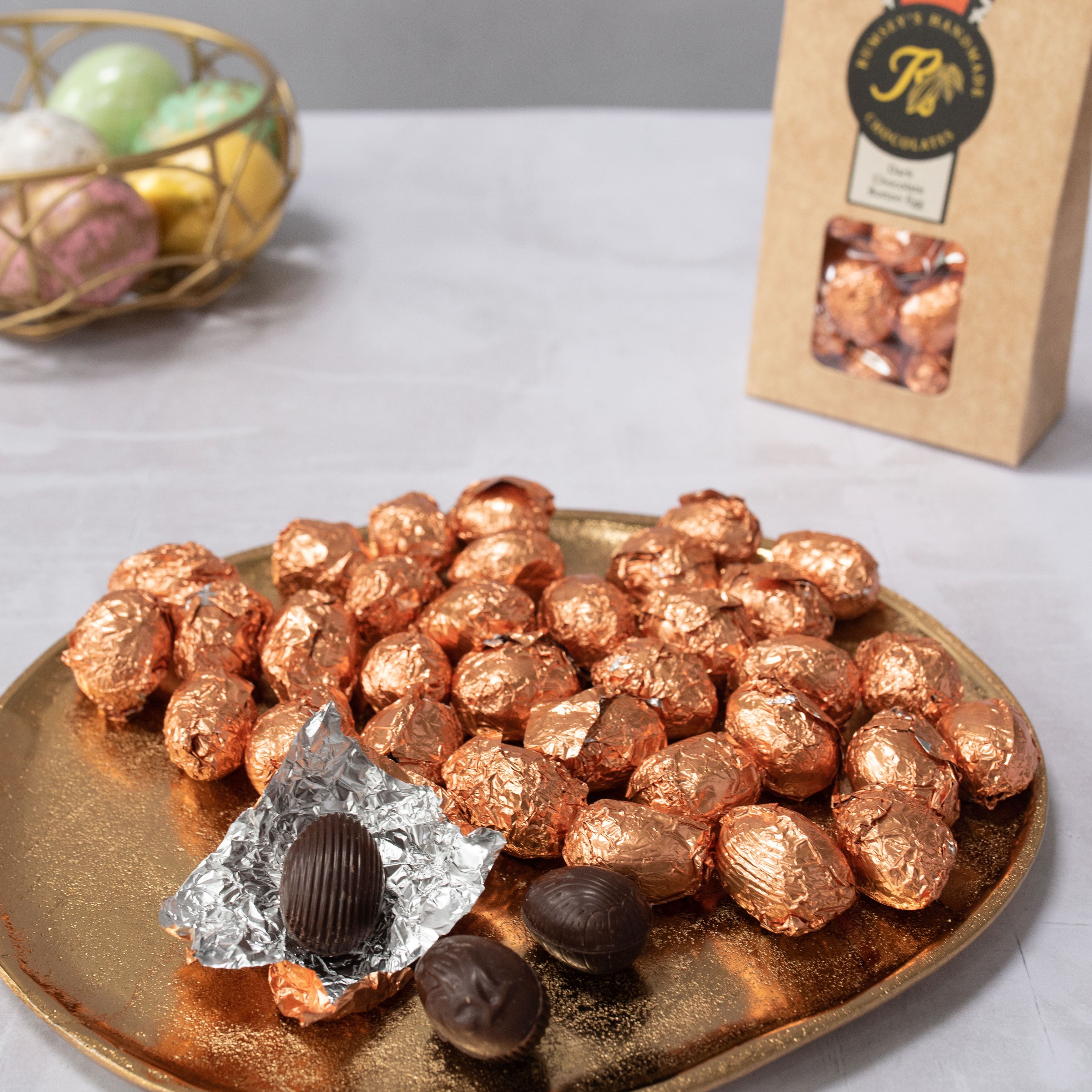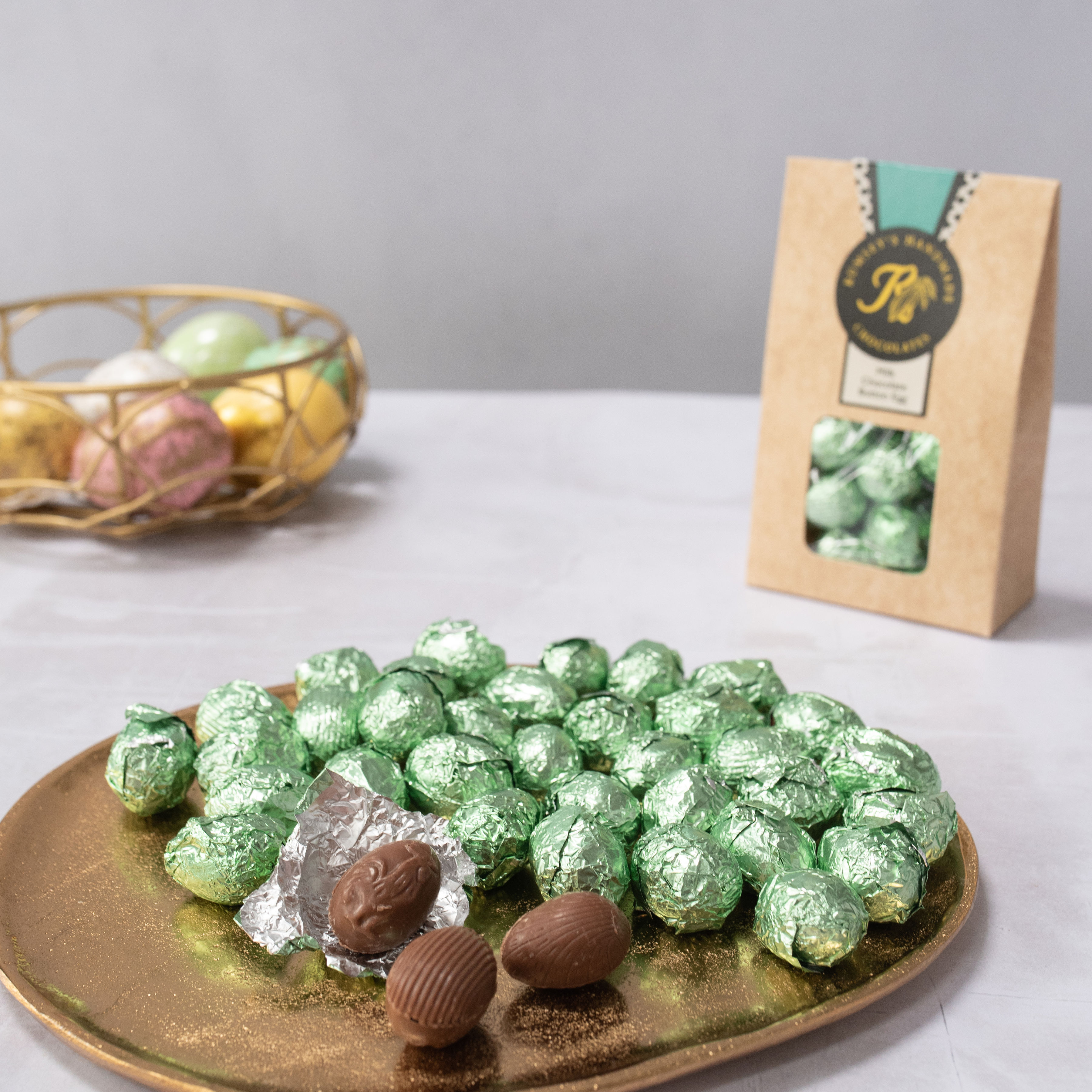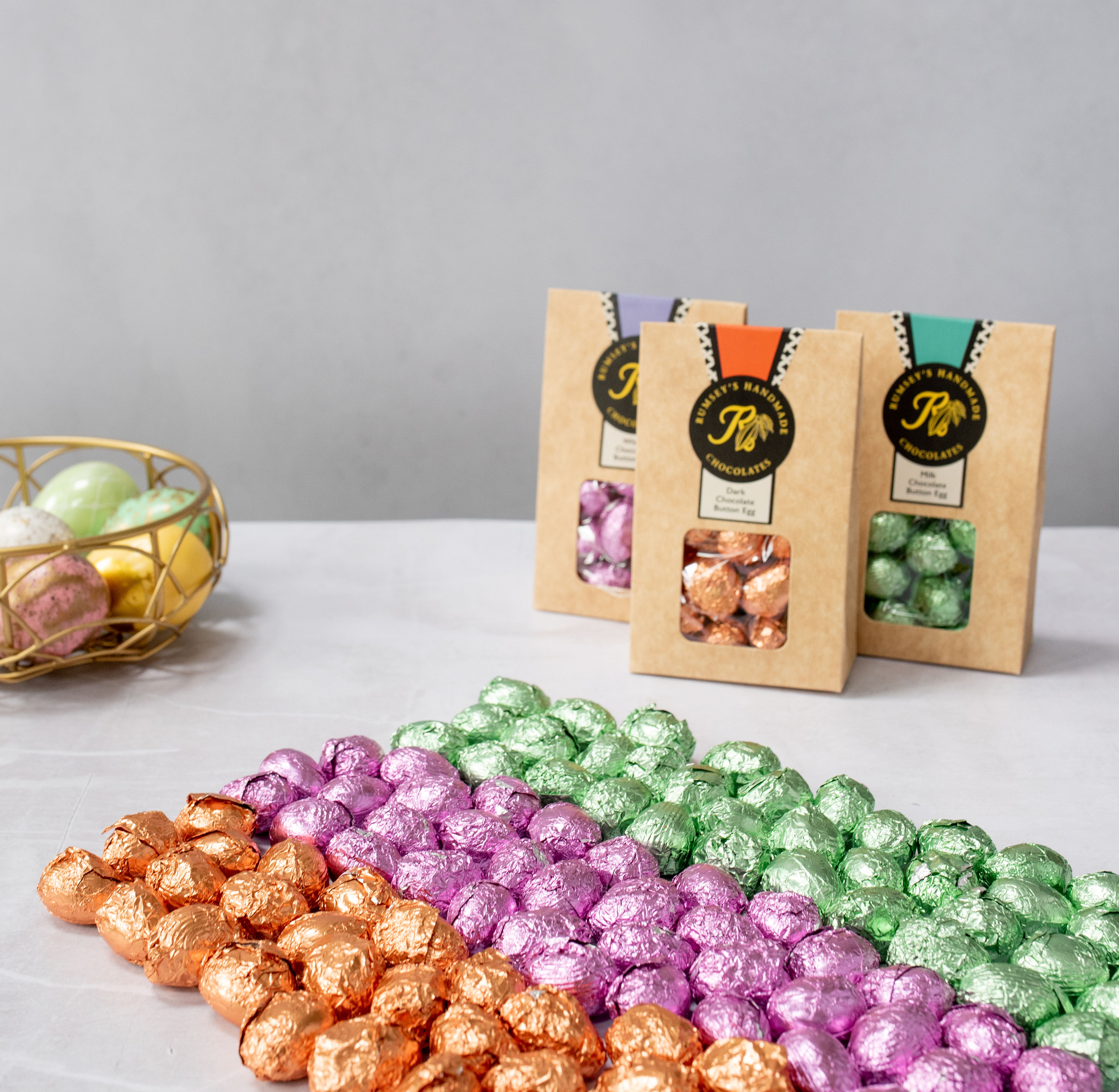 Individually handmade and foil wrapped mini eggs. Choose from milk, dark or white chocolate - or one of each type! Perfect for Easter Egg hunts or a little gift for someone special. The box is made from a natural kraft, cardboard manufactured in the UK and recyclable. The bag inside is a compostable Natureflex material.