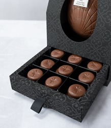 Handmade milk chocolate Easter Egg with pull out tray filled with delicious milk chocolate buttons. Rumsey's chocolate buttons are solid rounds of exquisite chocolate which melt in the mouth. Ideal chocolate treat for children and for adults. Our chocolate buttons are deliciously large and something to be savoured. 300g All cardboard is recyclable and the plastic window and tray cover are made from rPET (recycled plastic) and are also widely recyclable.