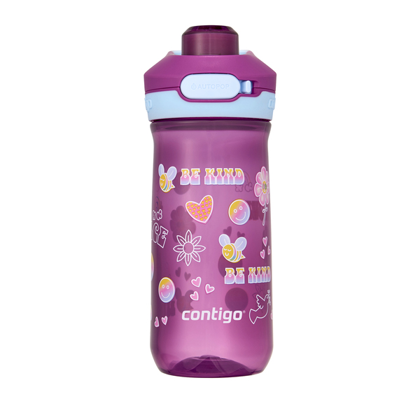 Pop it, lock it, love it! The Jessie Water Bottle is perfect for kids who have graduated from straw bottles and are ready for a bottle with a wider opening. It has fun colors and features that kids love, and a leak-proof, easy-clean and dishwasher safe design that busy parents appreciate, too. Karate kid, dance diva, or football star, active kids have big thirsts, and this cool water bottle keeps the drinks they love handy onthe-go. A covered spout keeps dirt and grime out of the way, and the handle makes it easy to carry. When it’s time to drink, kids just push the big front button; the AUTOPOP™ lid pops open to reveal a wide mouth opening for easy one-handed drinking. A smaller lock button seals the lid securely for leak-proof travel. And it is also sized to fit most car seat cup holders, so that kids always have it handy.