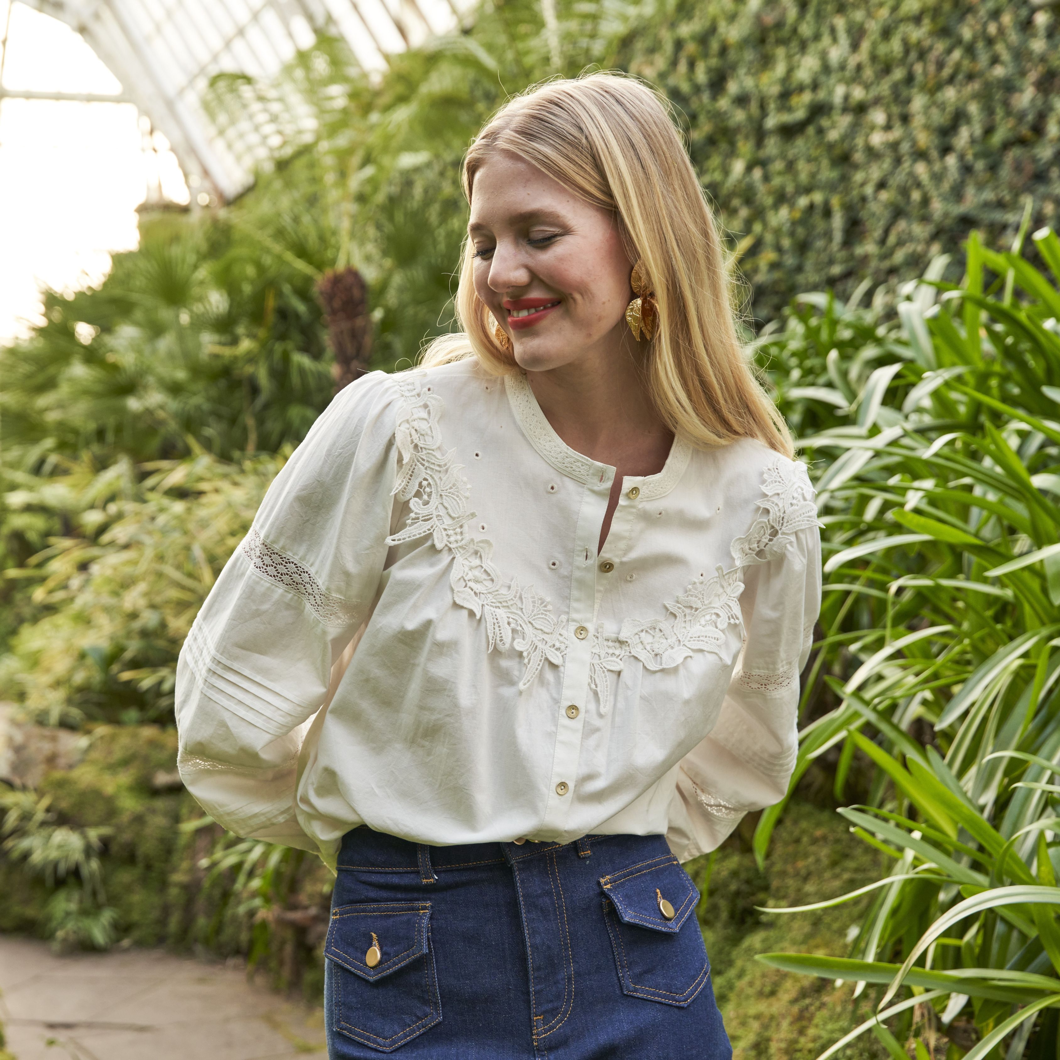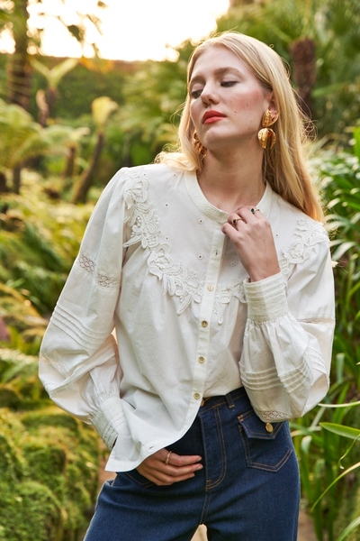 We are obsessed with this new in lace shirt with its dreamy lace detail trims. The elegant style is the ultimate piece for your spring wardrobe. This shirt will elevate any casual outfit and can be worn multiple ways either with our jeans or some wide leg trousers. The gold button details down the front is the perfect feminine touch along with lace trim on the sleeve and across the yoke with eyelet embroidery details.
