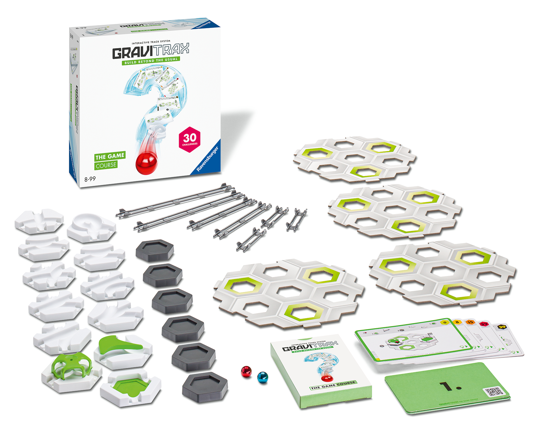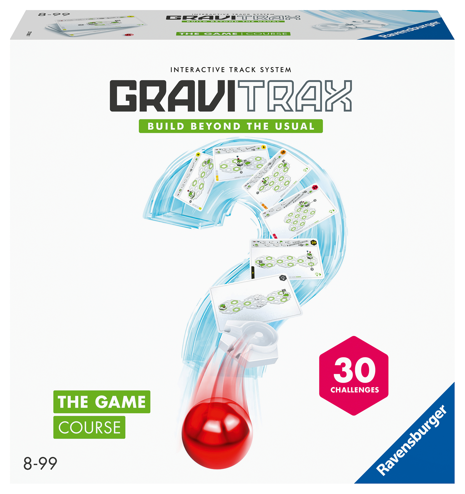 How does the ball get from start to finish when, for example, only 4 height stones, 3 curves and 2 rails are available to build the railway? 30 task cards show the start and finish point of the track to be built. If at the end the ball rolls from start to finish and all parts are installed, the puzzle is solved. Hexagonal base plates, which can be variably placed next to each other, enable tricky and varied puzzle fun with the interactive marble run system. This set is suitable for ages 8 years and up. Other editions of GraviTrax The Game also available.