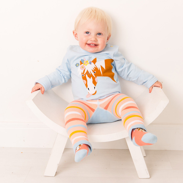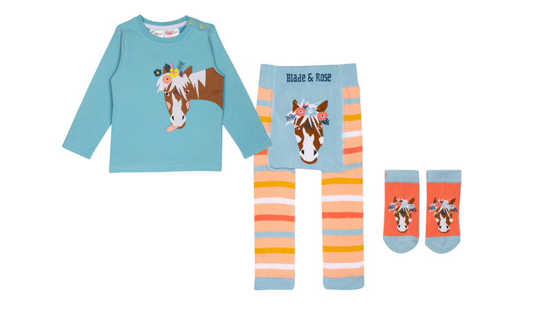 Bella the Horse, a long-awaited collection, available from July 2023. After many requests from dedicated fans, Blade and Rose have launched the cutest horse design. Amanda and Faye, the Blade and Rose design team have created these with all little equestrians in mind. Perfect for visiting the stables, and practical for young jockeys, these super soft, and washable products are designed with this in mind. The blue, orange, mustard and white stripey leggings feature Bella, a lovely brown and white skewbald pony who has a lovely long mane adorned with flowers and leaves and of course the Blade and Rose brand name on the waist band. The coordinating long sleeved top in a sky-blue shade has a beautifully embroidered Bella who has a very cheeky expression on her face and of course flowers in the mane to match the leggings. With the highly detailed soft orange and blue cotton socks to match, this is set to be a future best seller. Available in size 0m to 4 years.