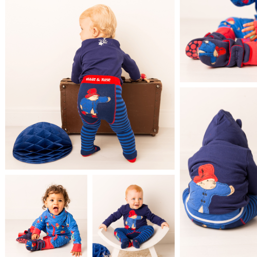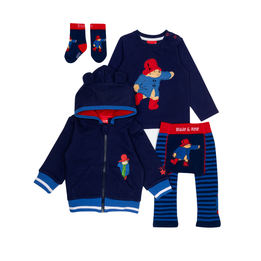 This adorable collection includes: Signature Blade & Rose leggings, featuring Paddington on the bottom and legs. size 0-6m, 6-12m, 1-2yr, 2-3yr, 3-4yrs Long sleeve top with applique Paddington size 0-6m, 6-12m, 1-2yr, 2-3yr, 3-4yrs Paddington Hoodie, the perfect blend of warmth, style, and childhood charm! This hoodie is a delightful tribute to everyone's favourite bear. (size 0-6m, 6-12m, 1-2yr, 2-3yr, 4-5yr, & 5- 6 yrs) Paddington Romper and matching bib , an eye-catching all-over print of Paddington romper with a clever two-way zip closure, allowing for hassle-free nappy changes without the need to fully undress - (sizes 3-6m, 6-12m, 12-18m & 18-24m) Booties with appliqued Paddington on the front, the elasticated ankle cuffs gently hug your baby's ankles, preventing the booties from slipping off. (sizes 0-6m, 6-12m 12-18m & 18-24m)