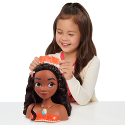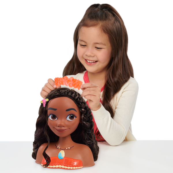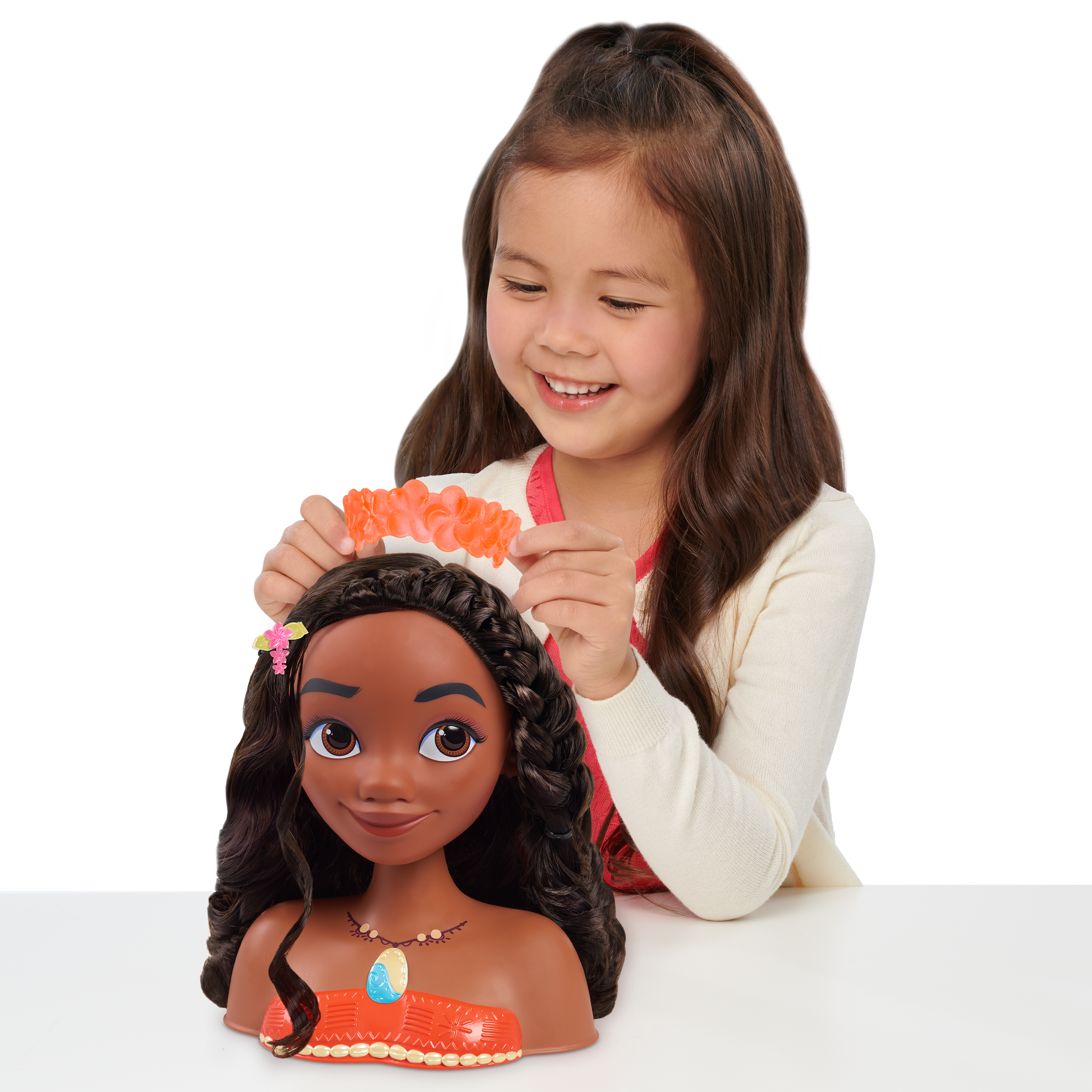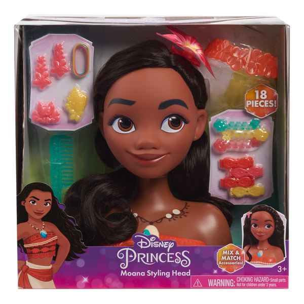Get ready to let creativity shine with the Disney Princess Moana Styling Head. Perfect for hours of pretend play, this 8-inch styling head comes with a gorgeous flower crown and 16 additional accessories to add glamour to Moana’s long, brown hair. Comb hair into her signature bun and use the beautiful flower clip to make a bold statement. Use hair ties to create stylish looks for day. Add a pop of color with coral and teal hair spirals. Customize 4 barrettes with 2 charms. For the finishing touch, accessorize with the pair of earrings! Whether kids imagine they’re getting ready to attend a celebration with Princess Moana or simply inventing stylish braid patterns, Moana’s hair can be worn up into her signature bun, worn down in wavy curls, and more. Whatever the style, hair play helps kids develop independence and self-confidence, and improves motor skills. Collect all four Disney Princess Styling Heads: Ariel, Rapunzel, Moana, and Tiana. Each sold separately. For kids ages 3 years and up.