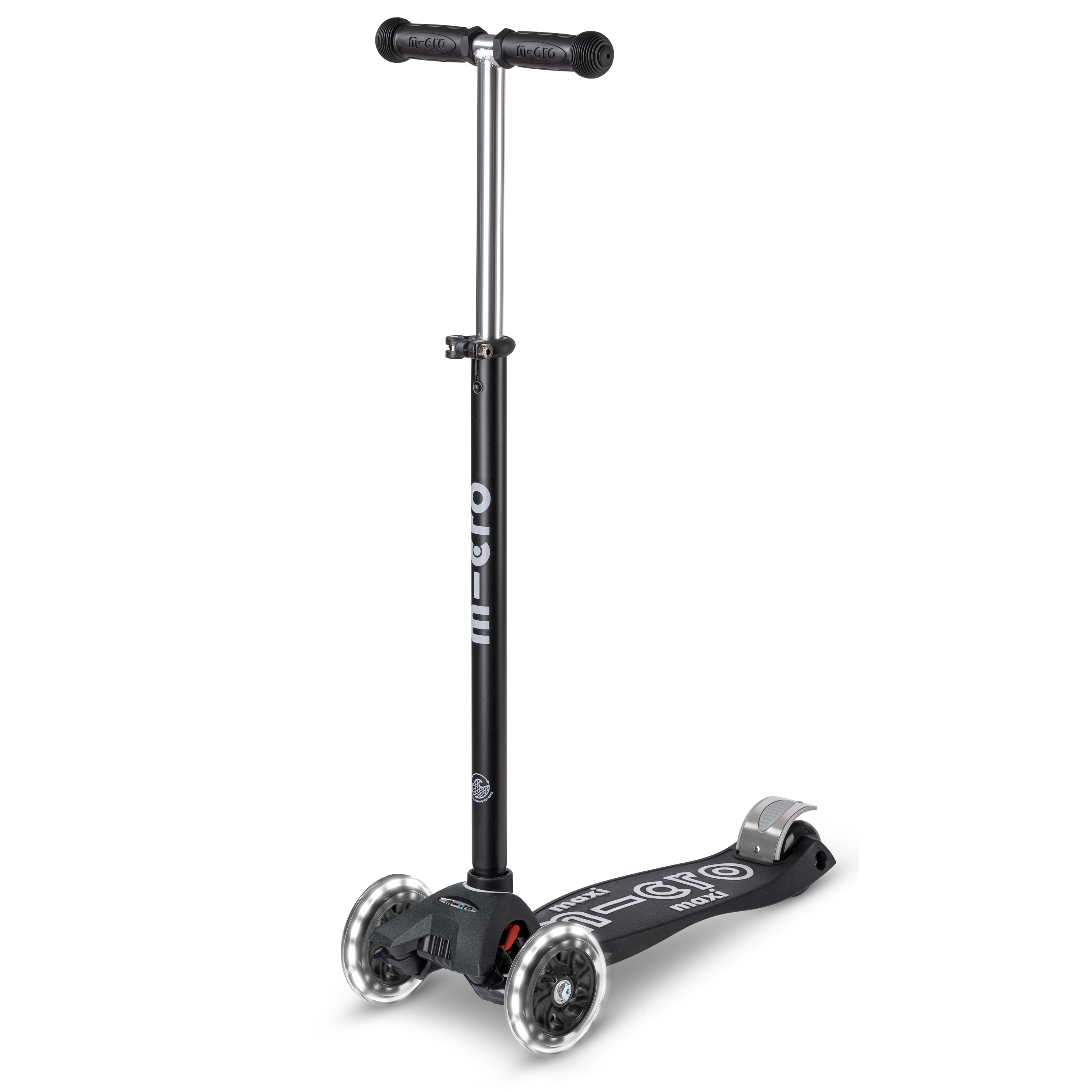 The Maxi Deluxe ECO LED has been designed to brighten every day while leaving little footprint on our planet. Our smart light up LED wheels use induction energy to turn the power kids create as they scoot into bright white light. No batteries. No fuss. Just a glow to light up the darkest evenings and brighten up the most ordinary days. With a deck made from recycled fishing nets that are removed from the ocean, cleaned and broken down into chips. They are then melted, coloured and poured into our deck moulds. Combined with our replaceable parts so that kids can tread lightly on their planet. A smart height-adjustable handlebar means the scooter grows as your child does. Micro's patented 'lean-to-steer' mechanism has helped millions of children all over the world learn to scoot. More intuitive , simpler and let's face it, more fun - it's like surfing the pavement - your child simply leans in the direction they want to steer. The colour pop anodised stem not only stands out from the crowd but survives the toughest of knocks. The Maxi Deluxe ECO LED has a footplate made from flexible PAGF (reinforced fibreglass) and a double-injected anti-slip silicone logo to help keep children's feet firmly planted, even in wet weather. With our innovative braking system that responds to the slightest touch, thermoplastic, toxin-free rubber handle grips that manage to be super soft and super durable at the same time and polyurethane wheels for endless adventures.