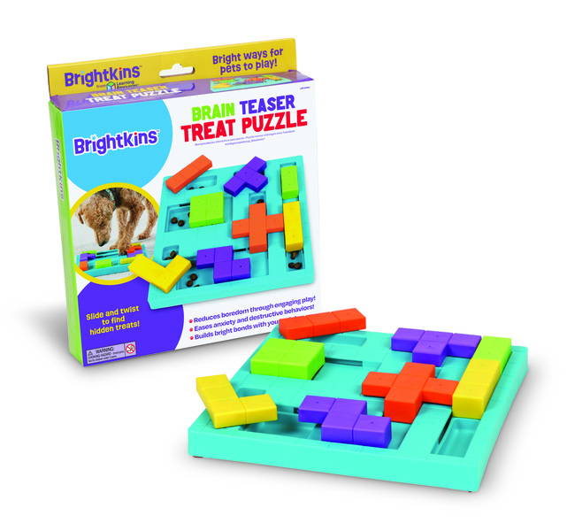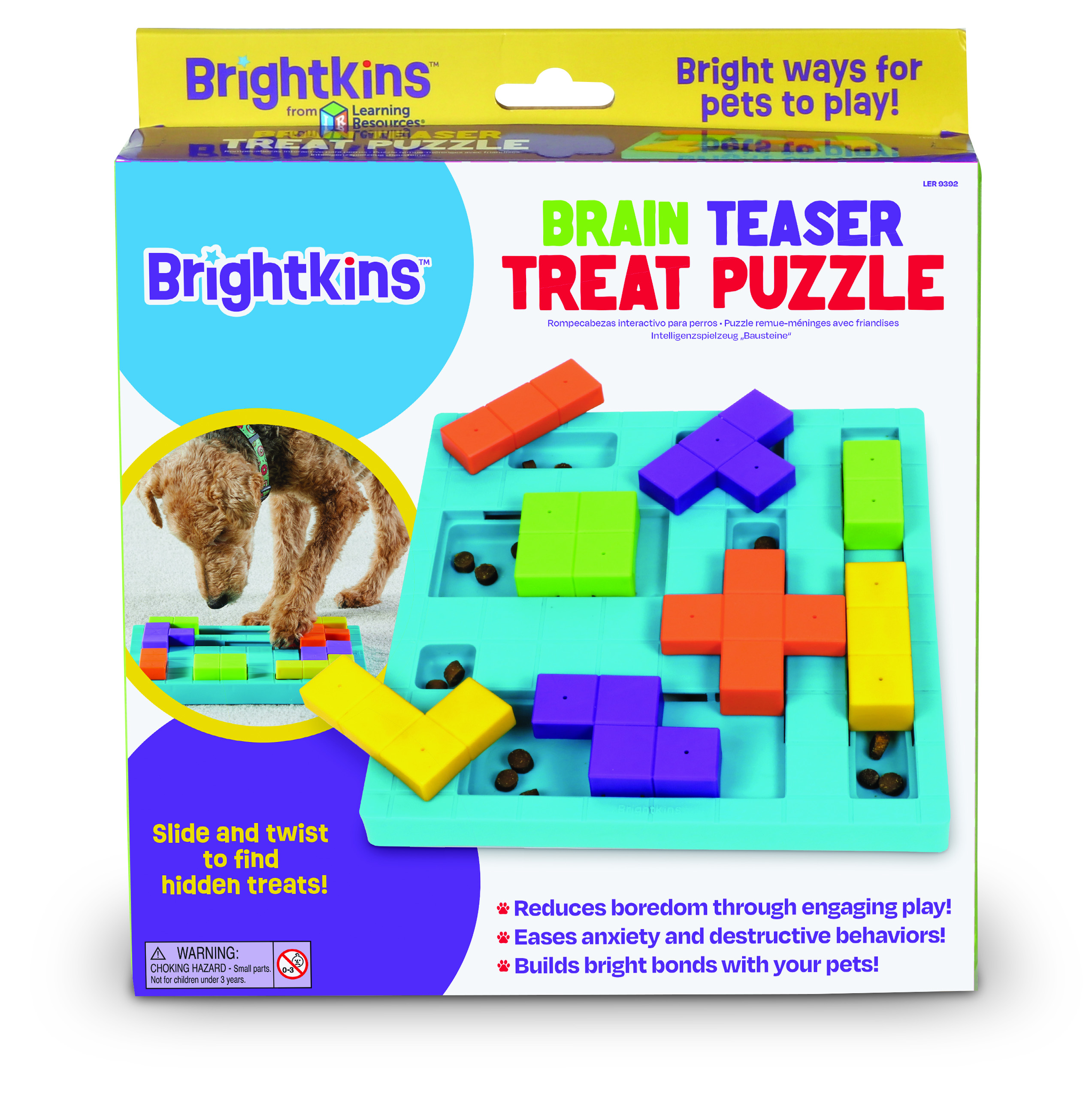 These sliding, spinning shapes turn your dog’s mealtimes into a brain-teasing dog puzzle. Your pooch will use their brain, nose, and paws to solve this stimulating snack challenges found in the Brain Teaser Treat Puzzle, one of the fun interactive dog toys from Brightkins. Inspired by the classic game of falling blocks, this dog puzzle toy comes with 8 shapes that move to reveal hidden treat compartments. As dogs sniff, twist, and slide their way to the treats in this dog food puzzle, they’ll boost their mental stimulation while also helping their nose build the beginnings of nose work skills. The Brain Teaser Treat Puzzle also doubles as a slow feeder and encourages fast eaters to take their time which also helps prevent your dog from overeating. Want even more ways to puzzle? Check out this dog treat puzzle's guide. Written by a certified professional dog trainer, it has all of the advice and activities you need to keep your pooch happy and engaged and make the most of our stimulating dog toys. The pieces are made from high quality BPA-free materials with smooth edges and are easy to clean with warm soapy water. Note: This is an interactive toy and is not a chew toy. Adult supervision is required. At Brightkins, our paws-on interactive dog toys and training tools unlock your pets' curiosity and engage the entire family.