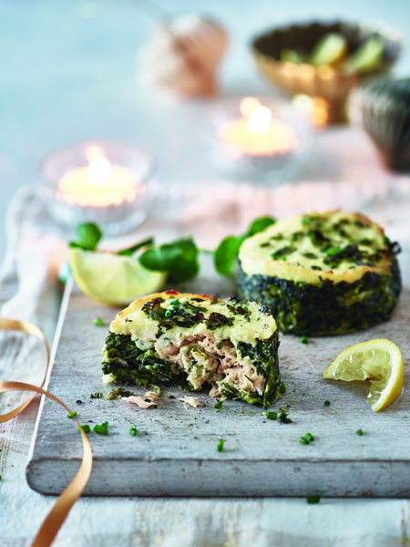 Flaked kiln-roasted salmon on a base of spinach, creme friche and cornichons, topped with a horseradish nad mascarpone cream.