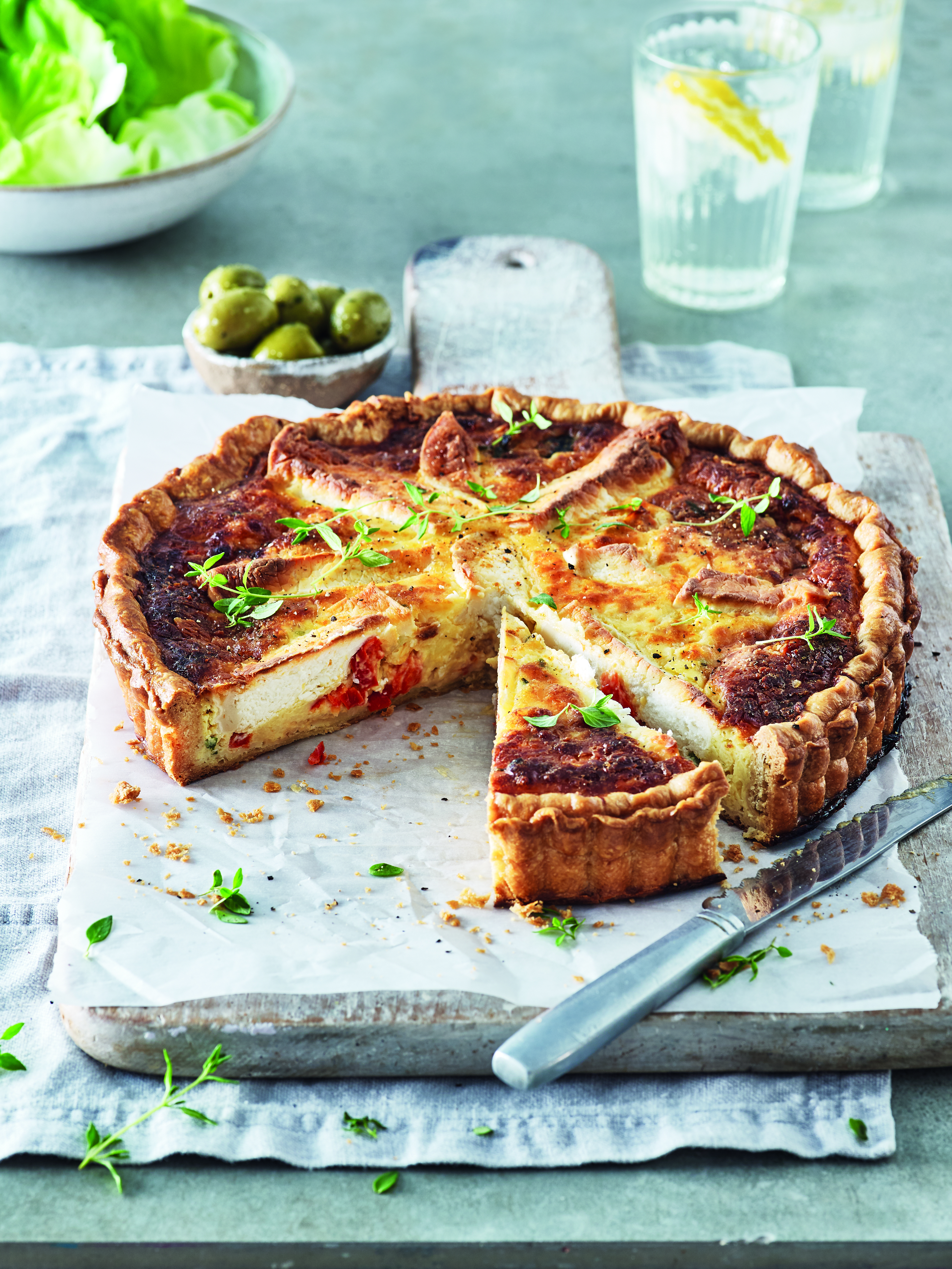 Sweet roasted peppers and slices of goat's cheese in a deep, free-range quiche