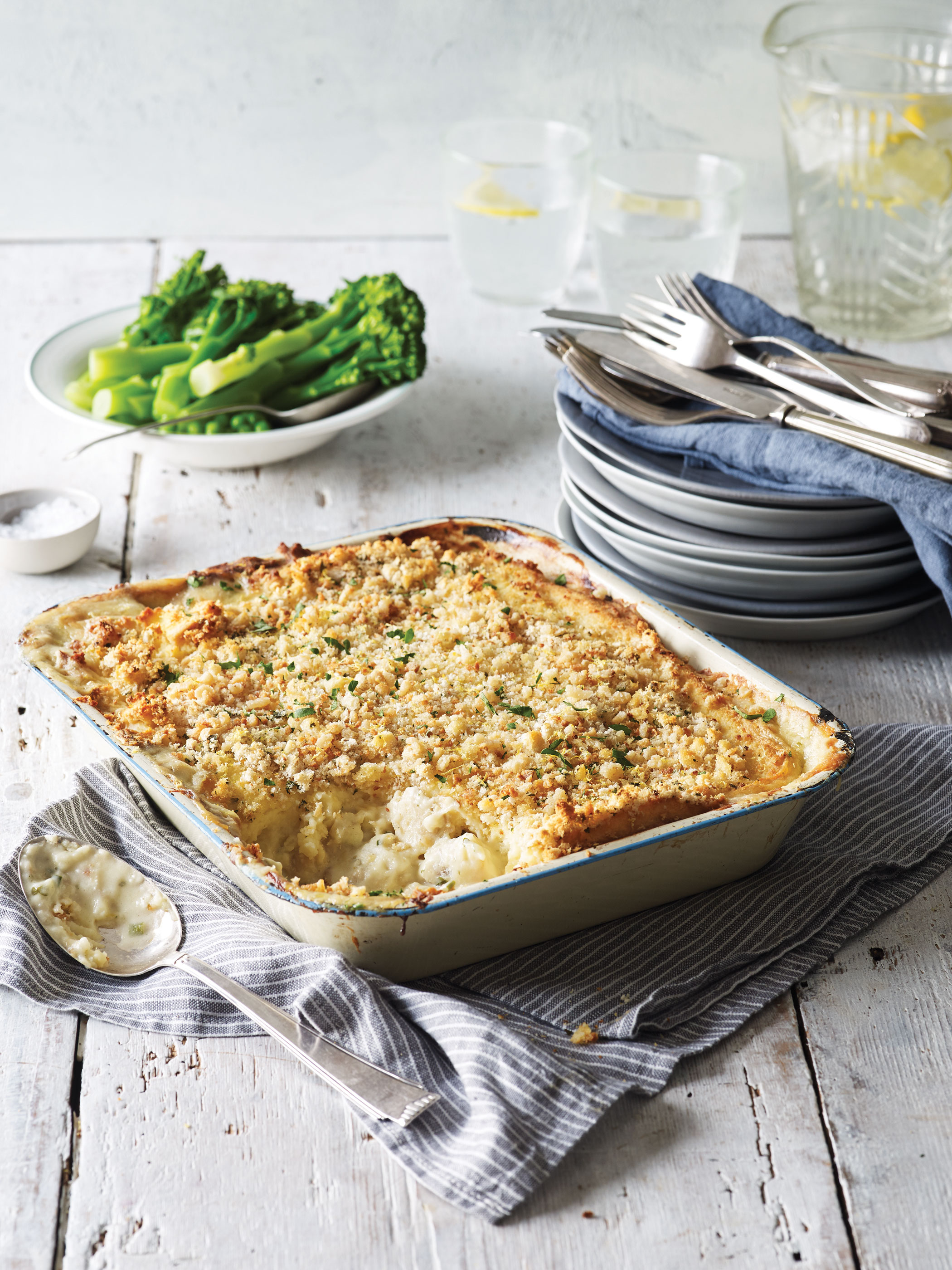 Cod and smoked haddock in a classic, white roux sauce with lemon, parsely and chives. Topped with fluffy, buttery and parsley mash and finished with a crispy crumb and lemon zest.