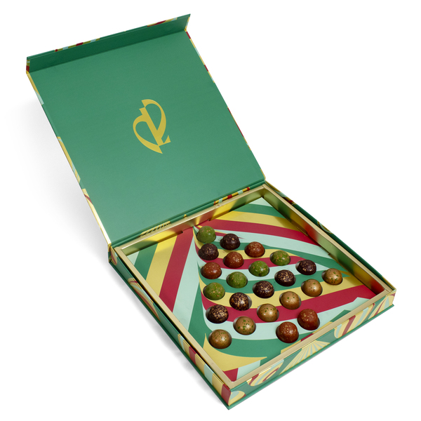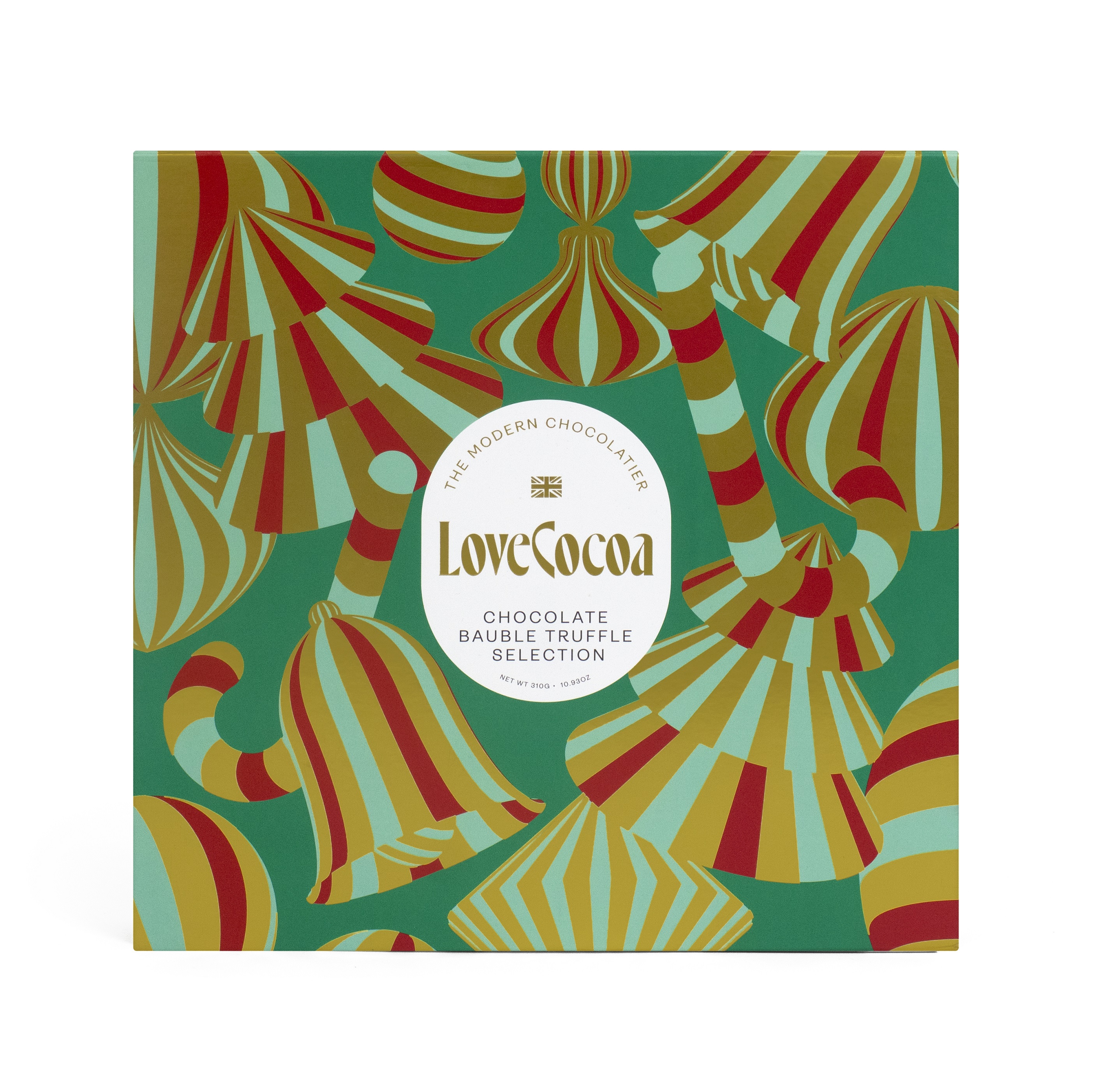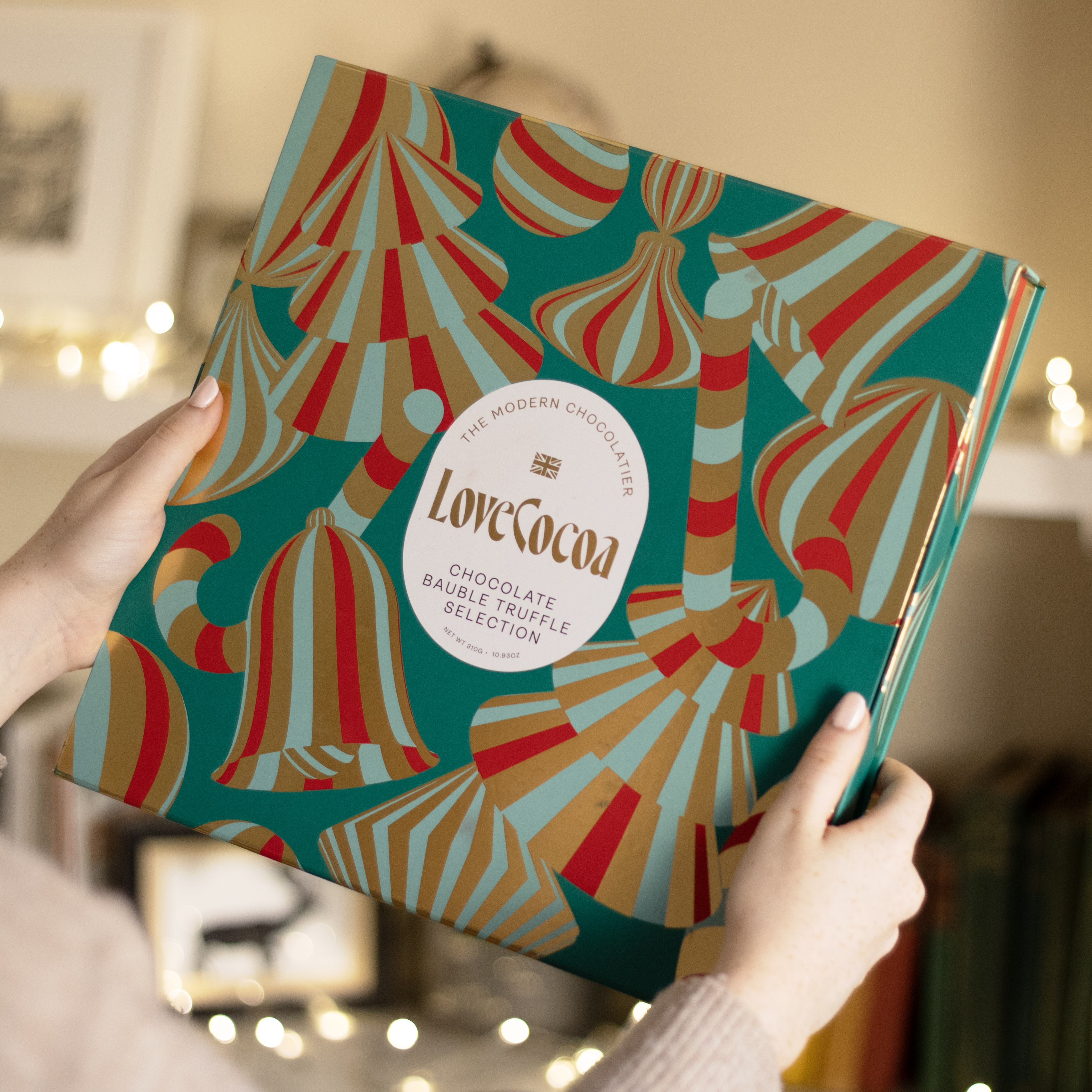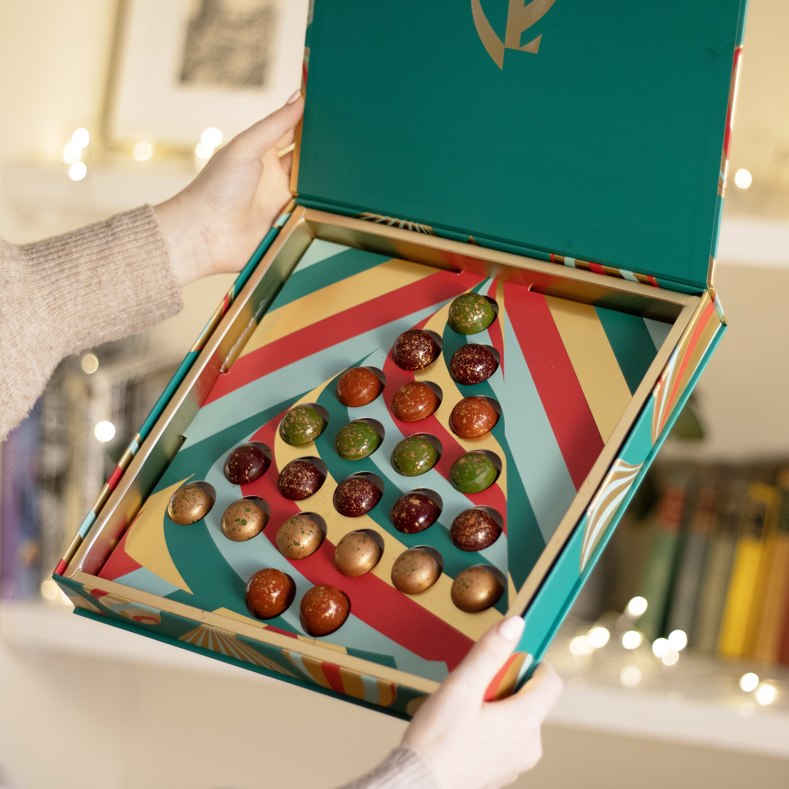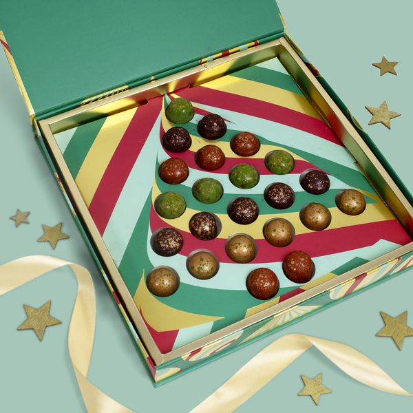 A selection of luxury chocolate ‘bauble’ truffles inside a fabulously festive Christmas tree box, with four carefully curated (and colourful) flavours, each as rich and delicious as the next. This box is the perfect festive gift, post-dinner treat and sweet snack to take you through the holiday season. 100% plastic free packaging.