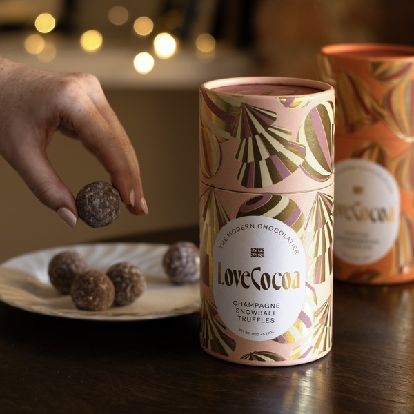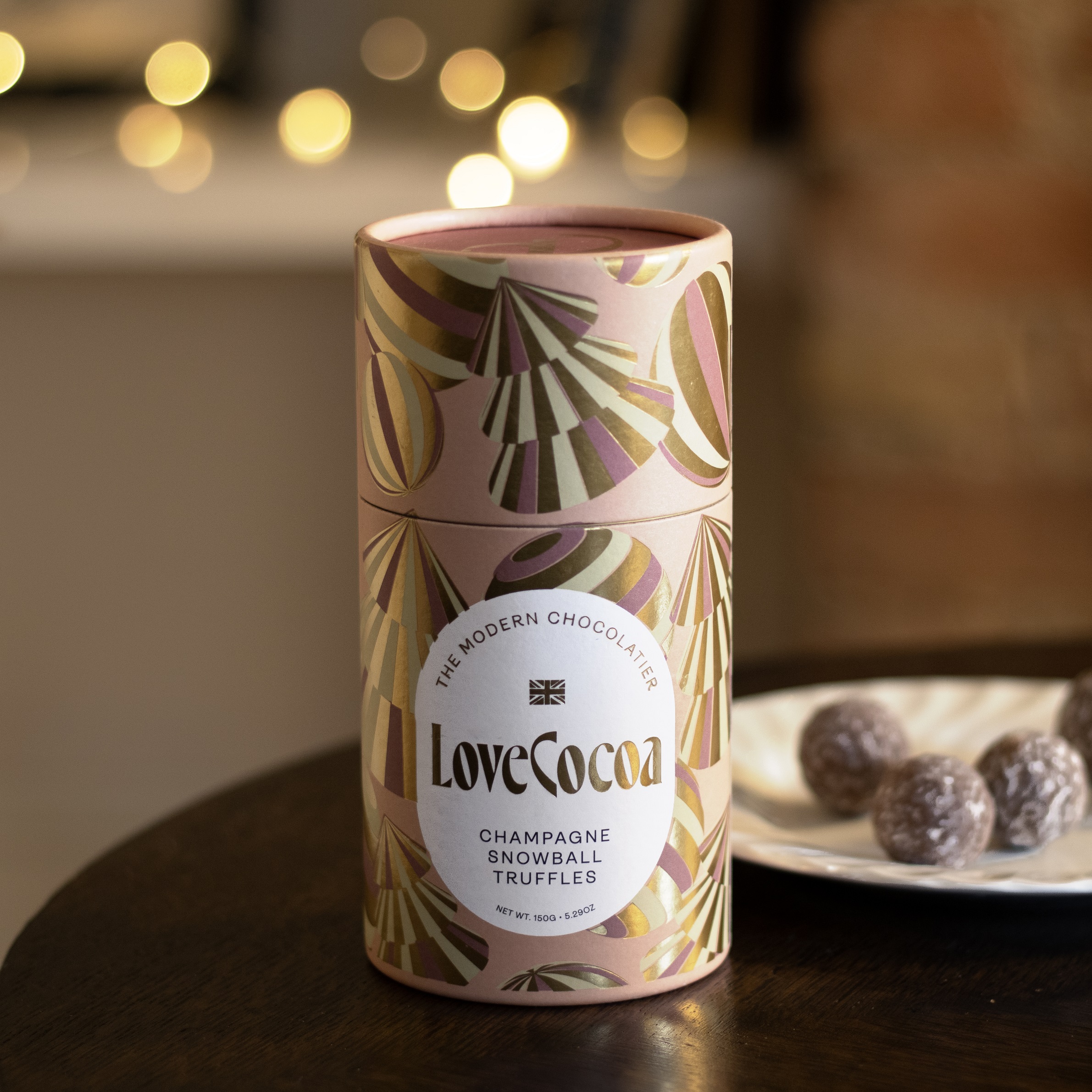 Filled with a creamy milk chocolate ganache, made with fresh cream infused with Marc de Champagne, and sealed in a chocolate shell delicately topped with icing sugar for a wintery finish. But from Love Cocoa, Anthropologie, Liberty and Next. 100% plastic free packaging.