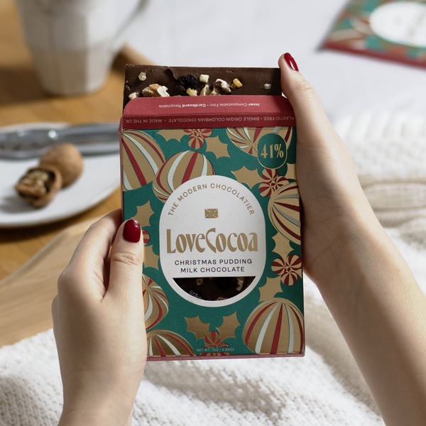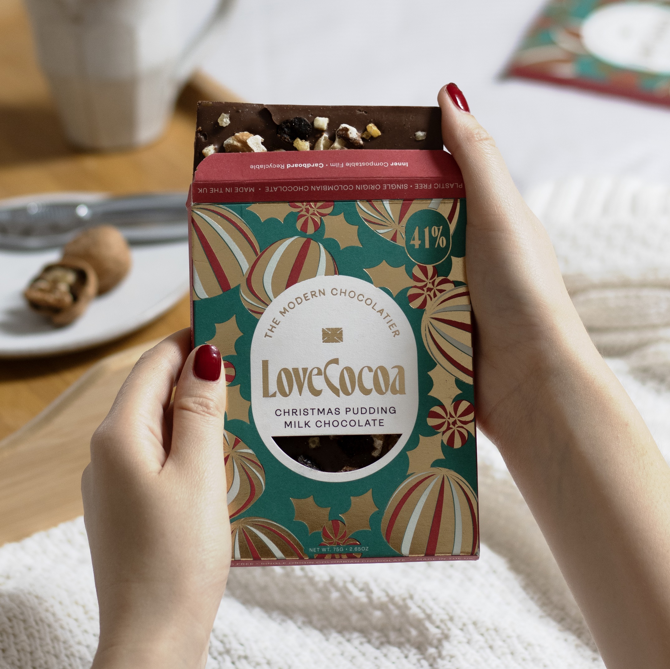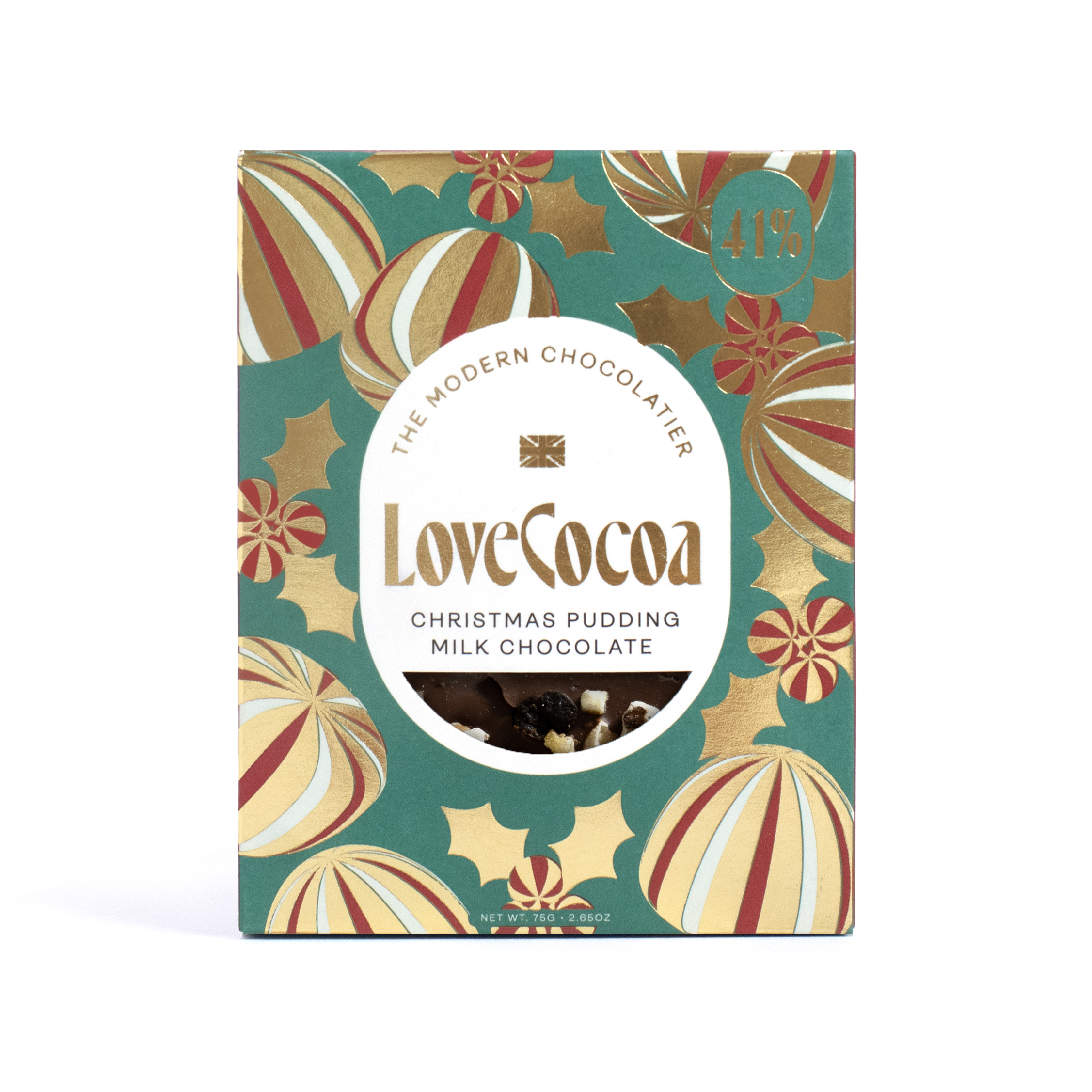 Love Cocoa's take on the mighty Christmas pudding: single-origin Colombian chocolate combined with a generous helping of all the nuts, fruits and spices that make a Christmas pudding so delicious. Indulge in this sweet seasonal flavour with family, friends and loved ones. A wonderful excuse to prolong eating pudding all winter and the perfect stocking filler.