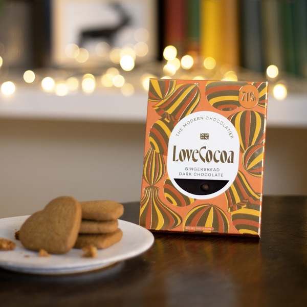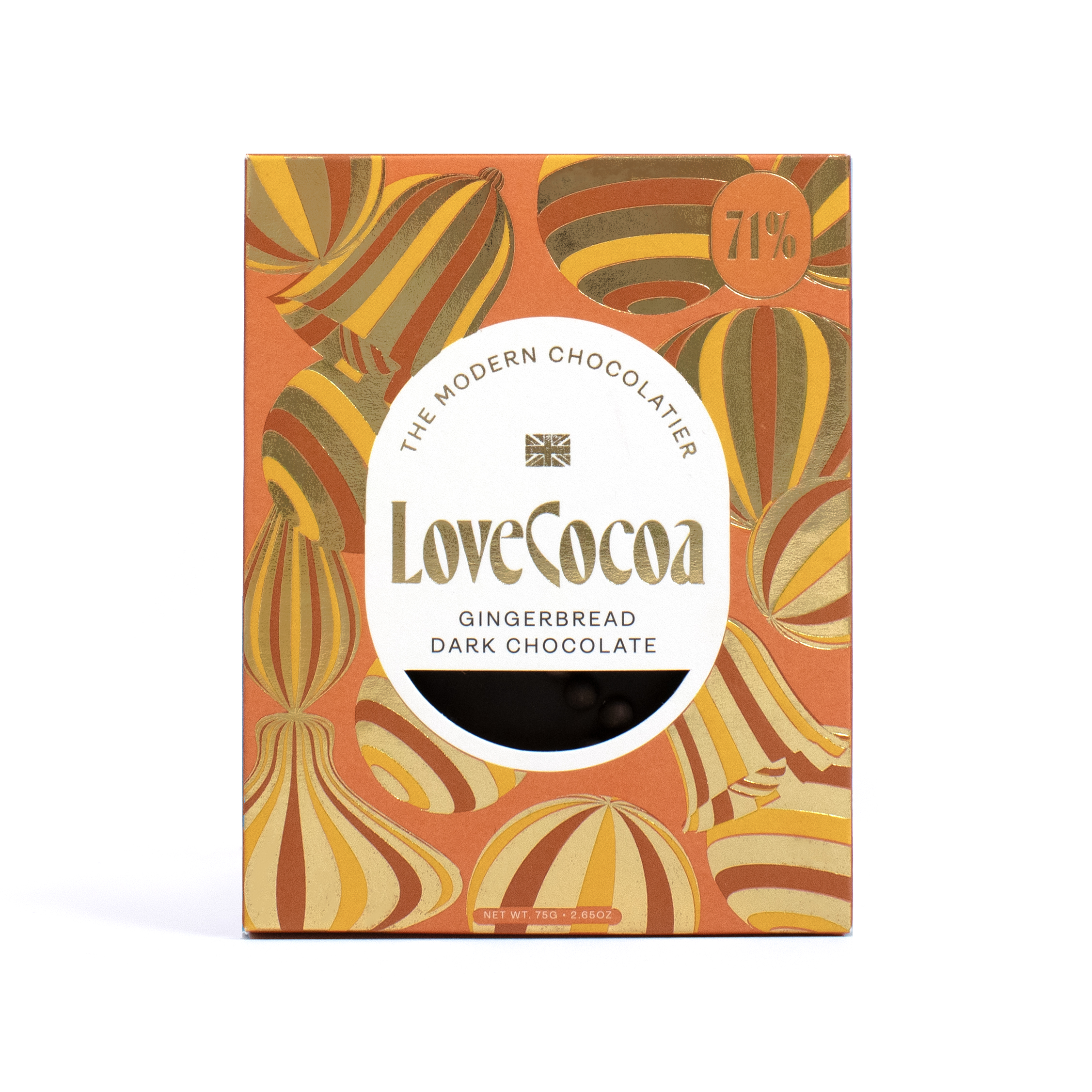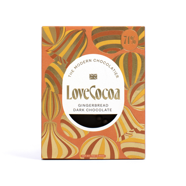71% Peruvian dark chocolate, deep with fruity notes and rich aroma, is combined with rich wintery spices for the perfect festive treat. Decorated with crunchy biscuit pearls, this is Christmas chocolate at its best. 100% plastic free packaging.
