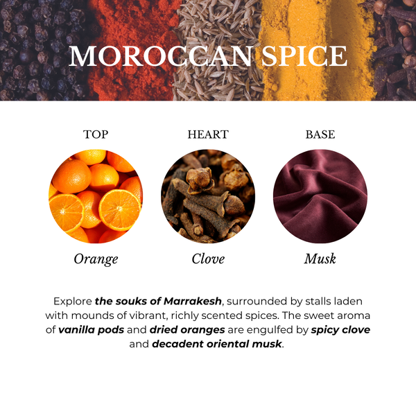 Ashleigh & Burwood’s signature Reed Diffusers are for the fragrance enthusiast with an eye for luxurious design. Black rattan reeds are presented in a stylish, recyclable black ombre glass vessel and provides continuous room scent for up to ten weeks. Encased in luxurious, recyclable black and gold gift packaging the Reed Diffuser presents as the perfect thoughtful gift. Go on a luxury voyage through global fragrance experience and discover our world of fragrance. Explore the souks of Marrakesh, surrounded by stalls laden with mounds of vibrant, richly scented spices. Fragrance Notes: Orange - Clove - Musk